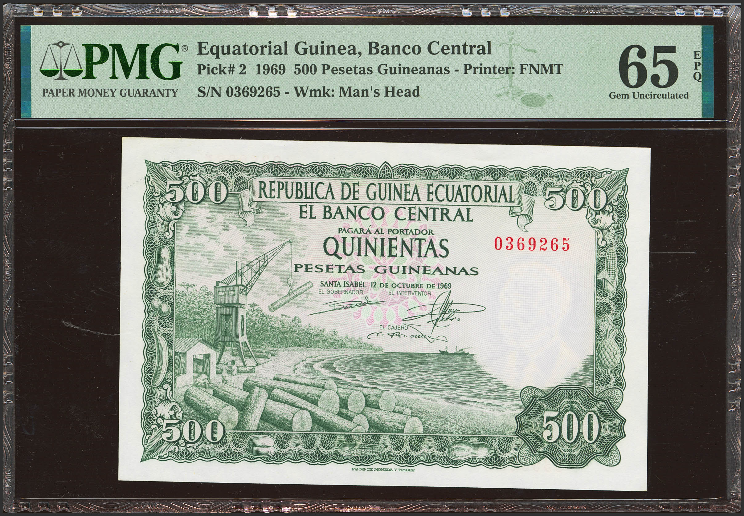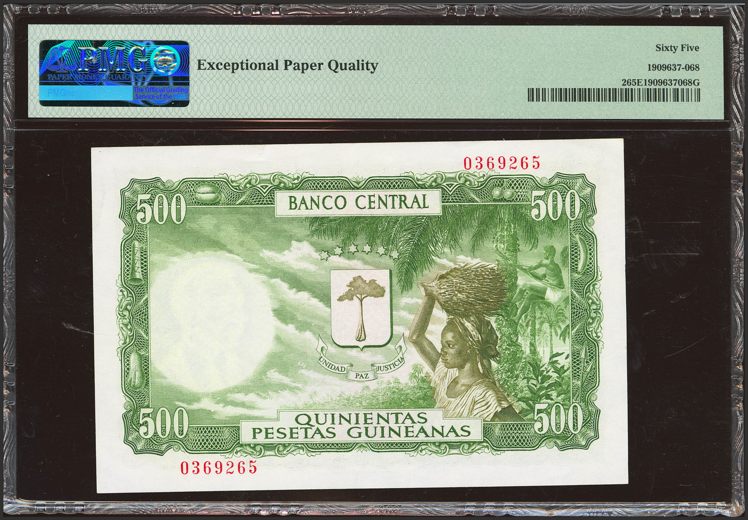 GUINEA ECUATORIAL. 500 Pesetas. 12 de Octubre de 1969. Sin serie. (Pick: 2). Inusual en esta excepcional calidad, apresto original. SC. Encapsulado PMG65EPQ.