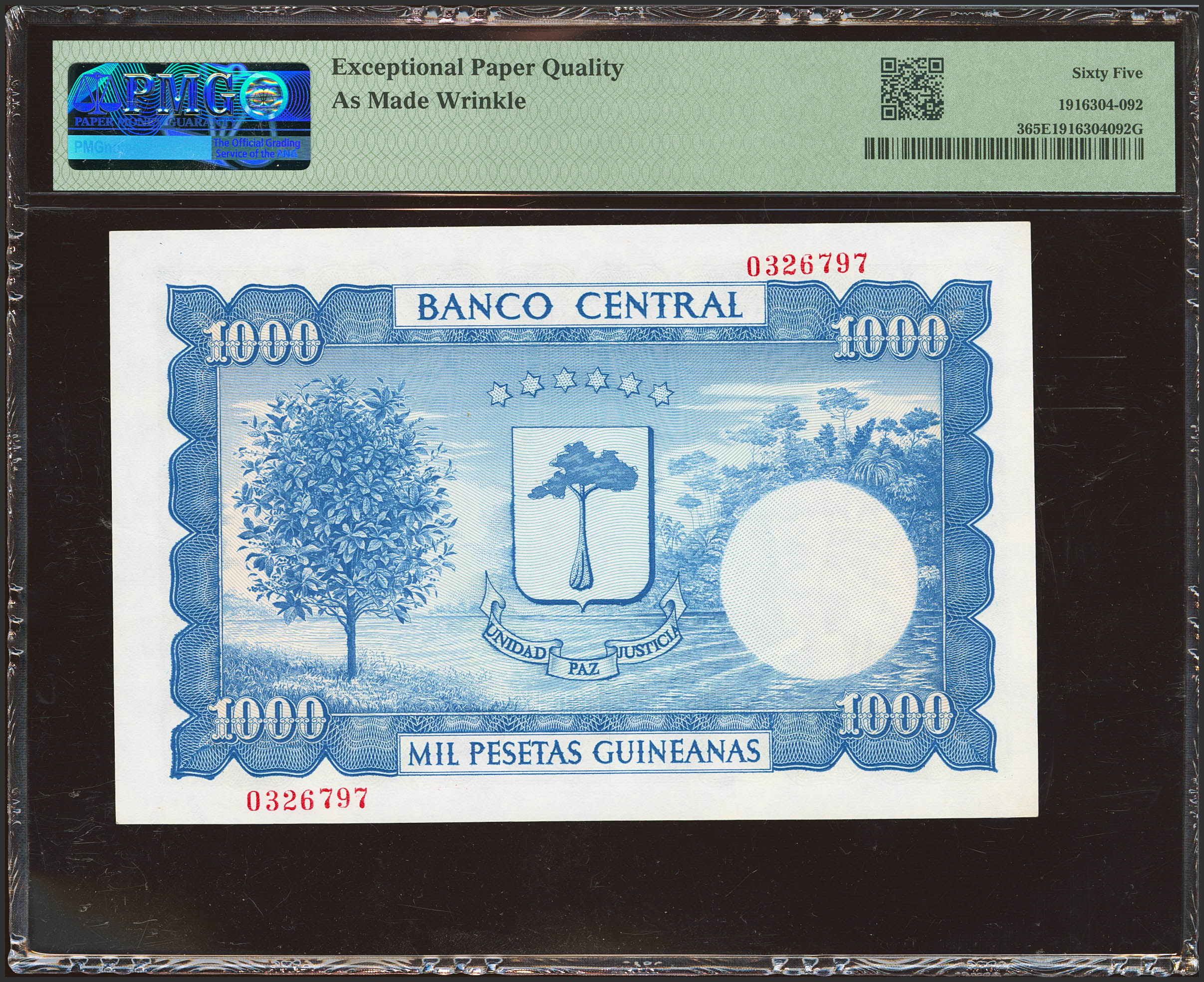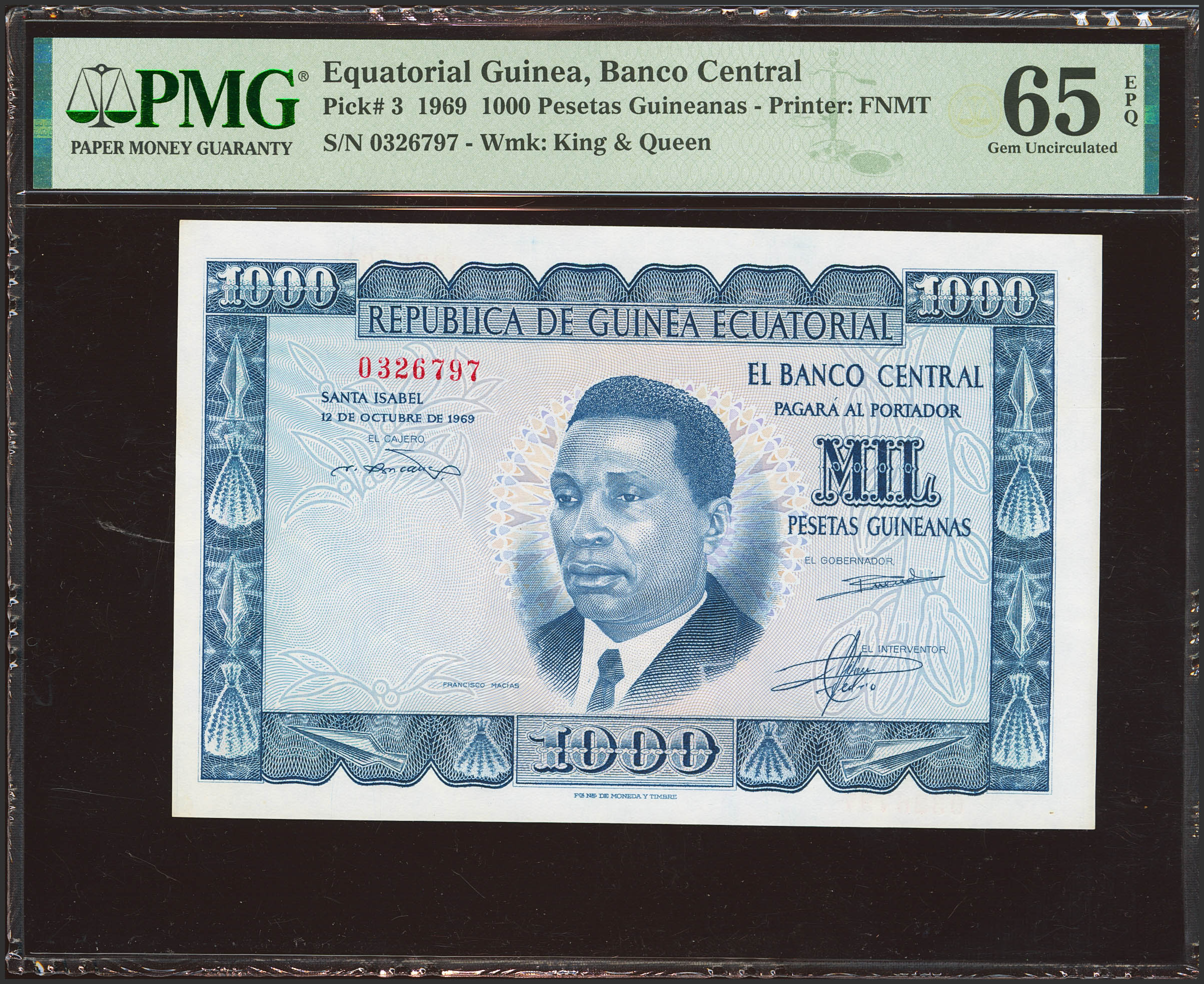 GUINEA ECUATORIAL. 1000 Pesetas. 12 de Octubre de 1969. Sin serie. (Pick: 3). Raro en esta excepcional calidad, apresto original. SC. Encapsulado PMG65EPQ (as made wrinkle).