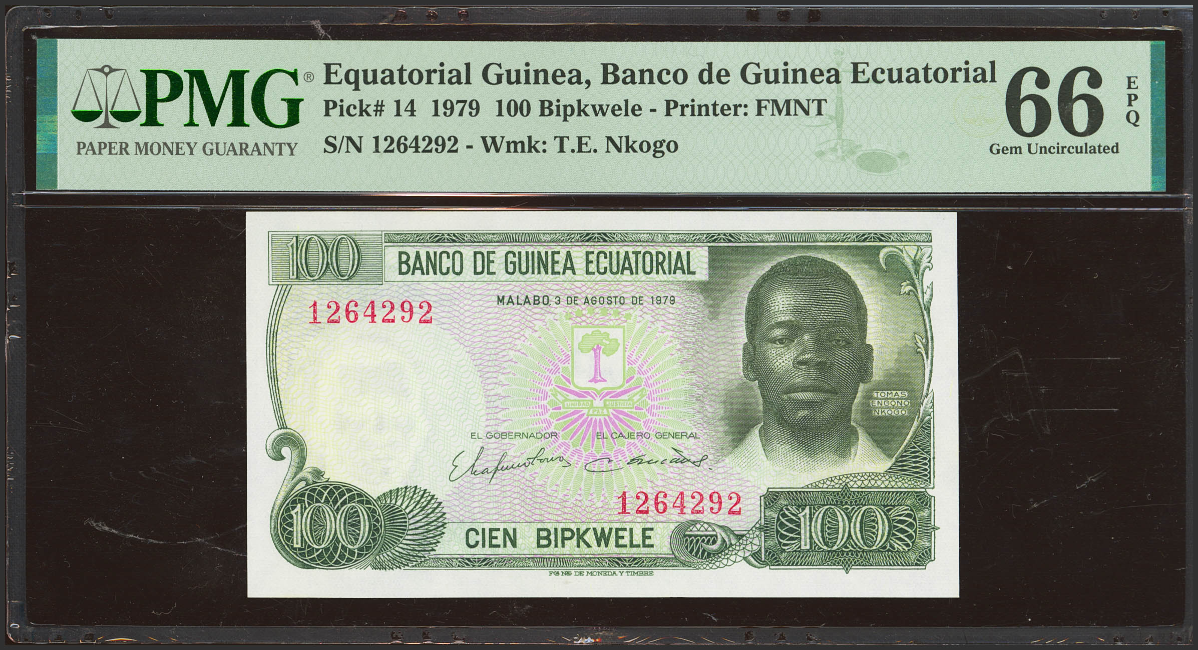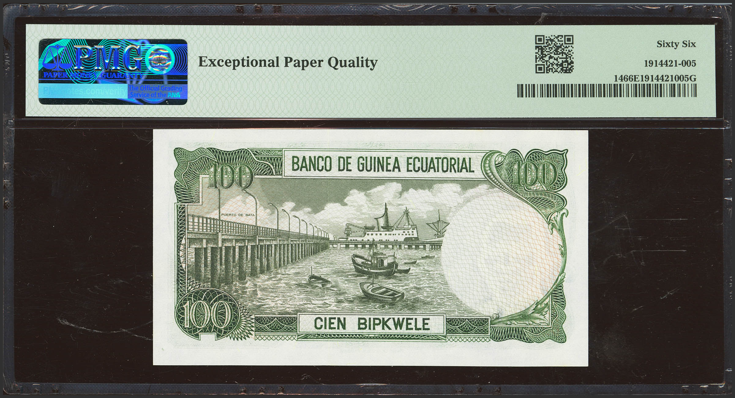 GUINEA ECUATORIAL. 100 Bipkwele. 3 de Agosto de 1979. (Pick: 14). Raro en esta excepcional calidad. SC. Encapsulado PMG66EPQ.