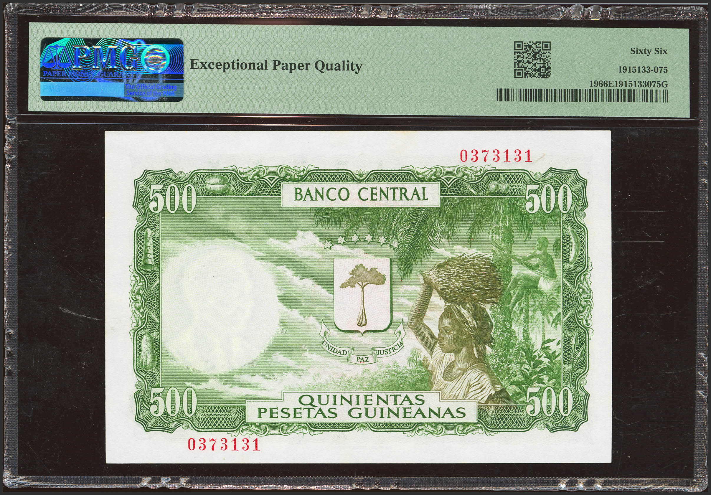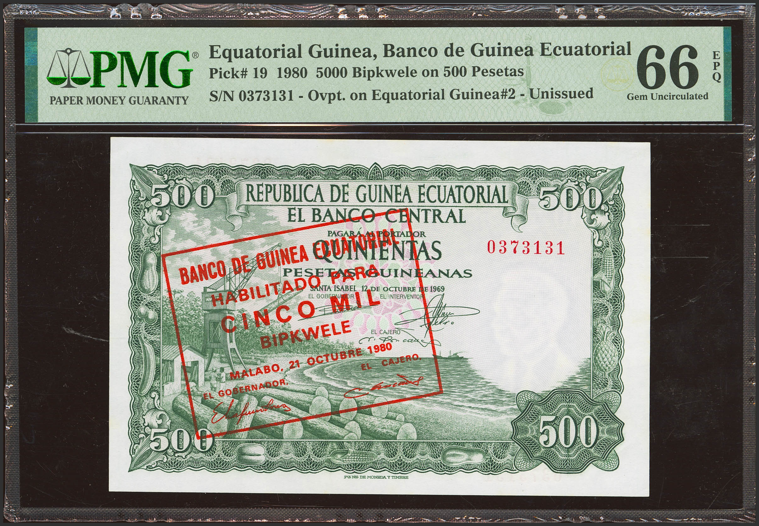GUINEA ECUATORIAL. 5000 Bipkwele sobre 500 Pesetas Guineanas. 1 de Diciembre de 1969. (Pick: 19). Apresto original. SC. Encapsulado PMG66EPQ.