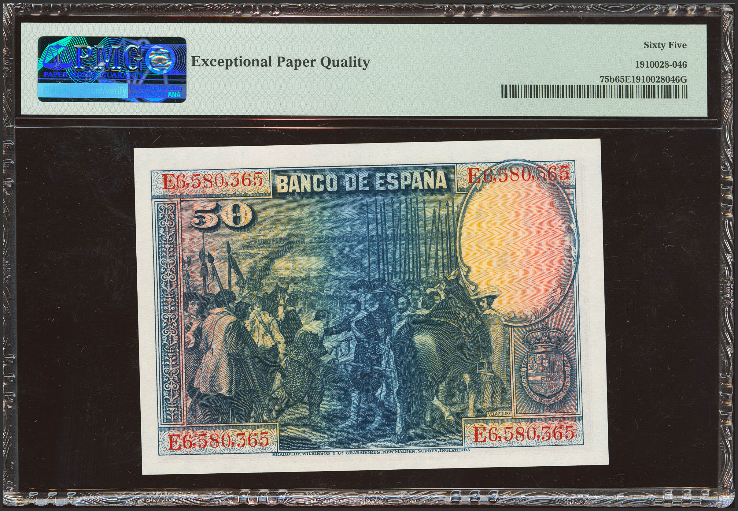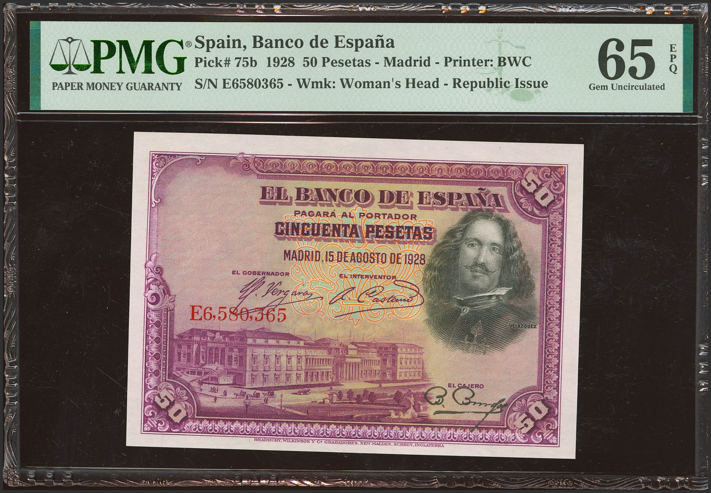 50 Pesetas. 15 de Agosto de 1928. Serie E. (Edifil 2023: 354, Pick: 75b).Apresto original. SC. Encapsulado PMG65EPQ.