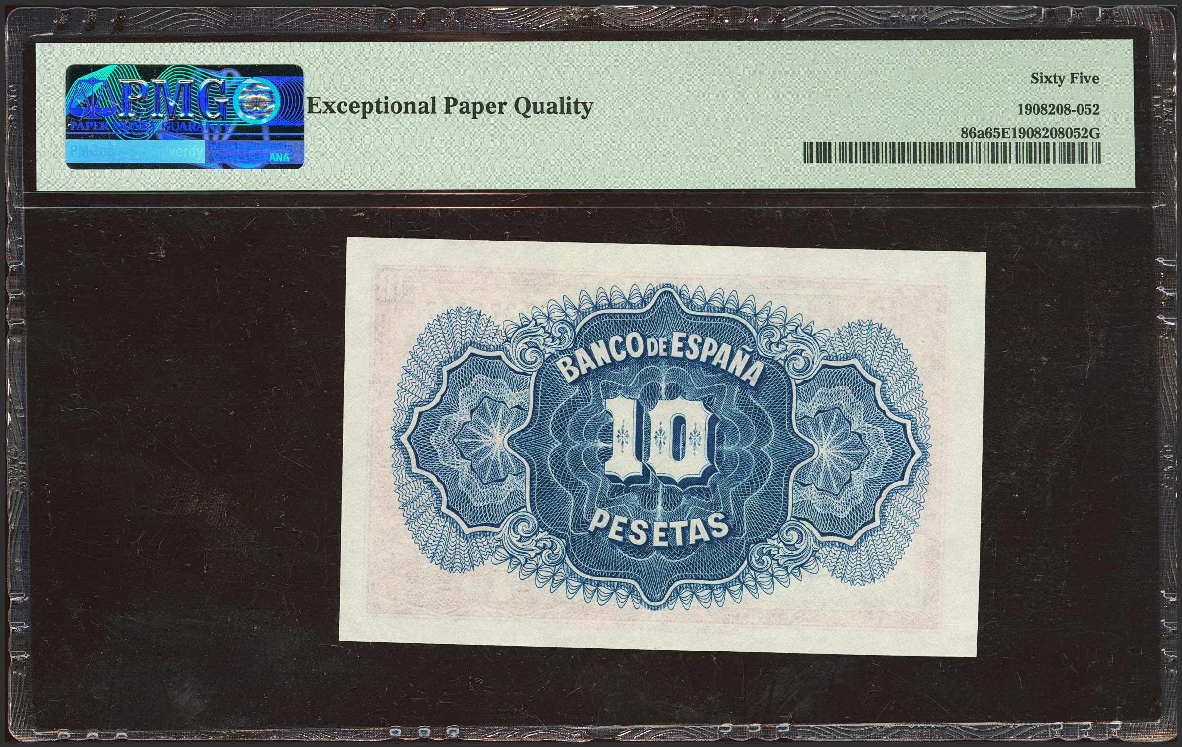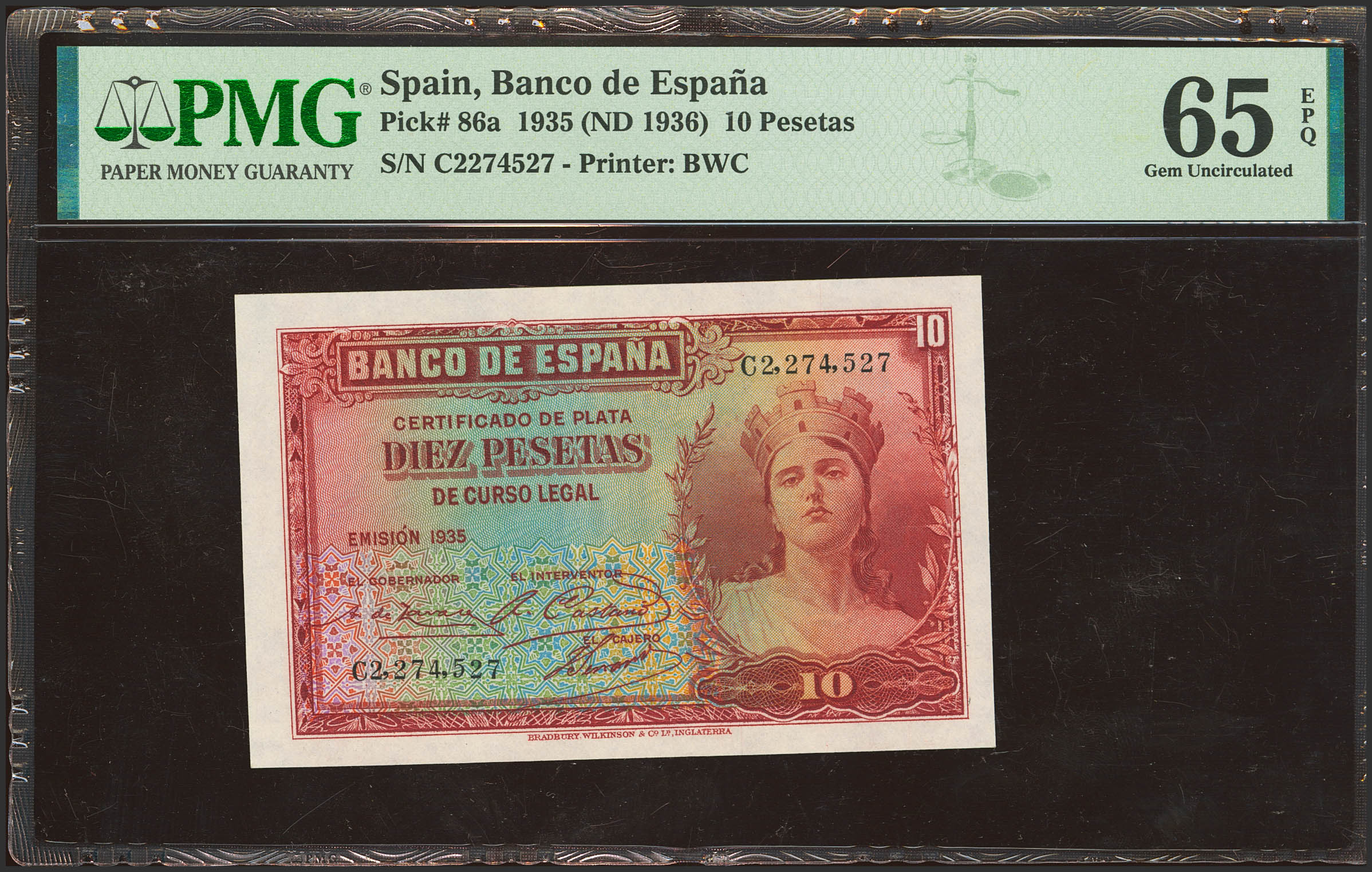 10 Pesetas. 1935. Certificado de Plata. Serie C, última serie emitida. (Edifil 2023: 364b, Pick: 86a). Inusual en esta excepcional calidad, apresto original. SC. Encapsulado PMG65EPQ.