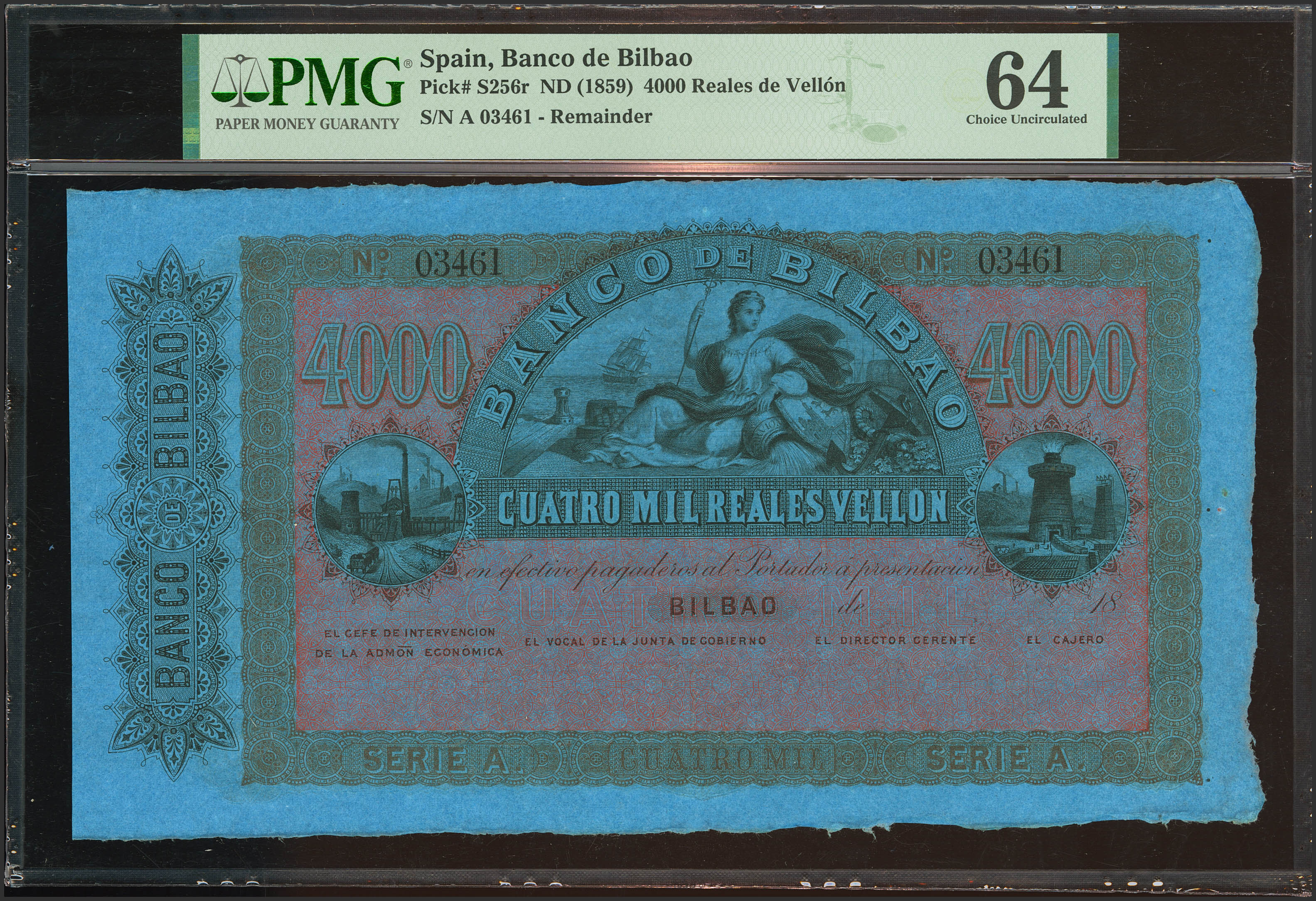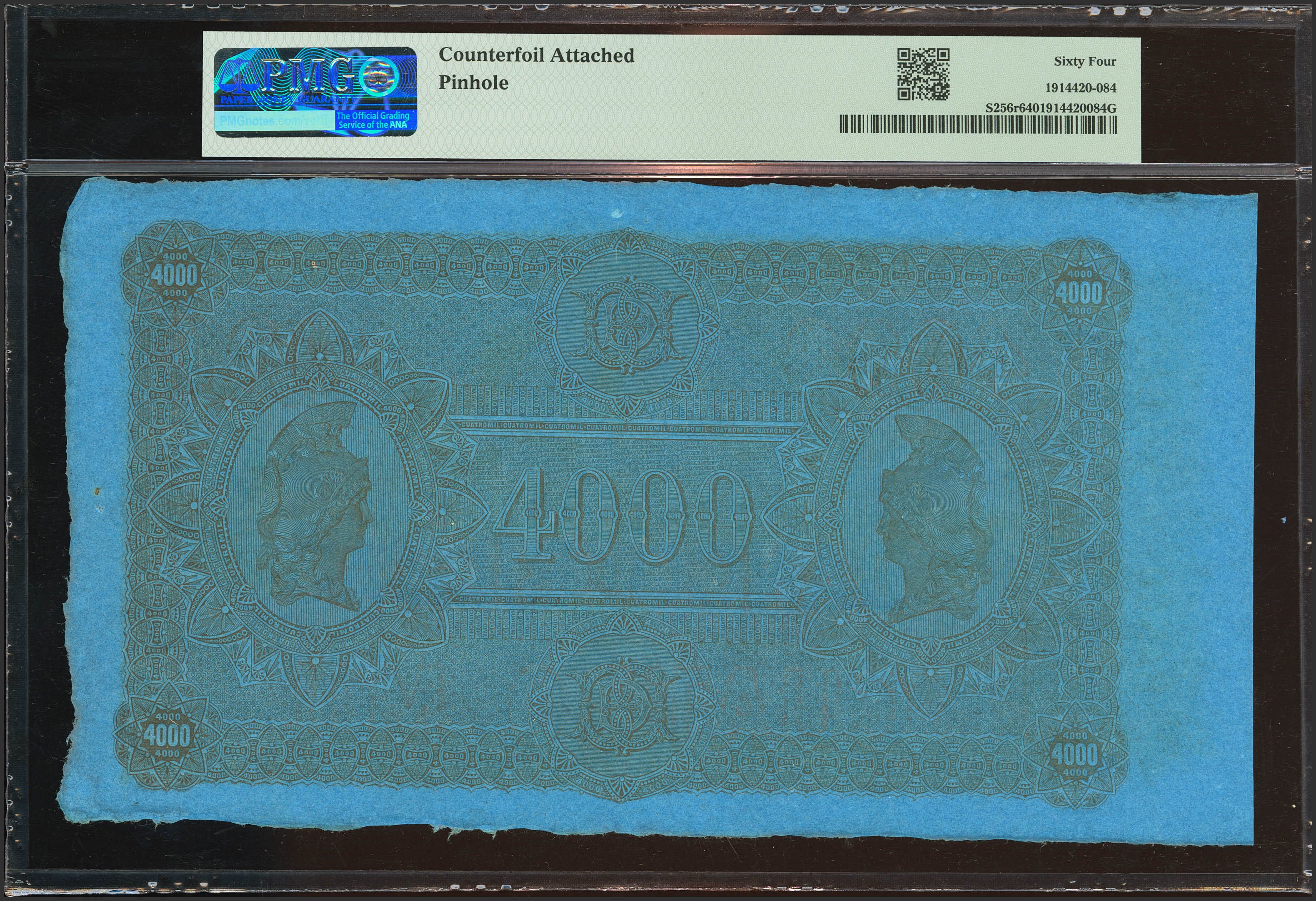 4000 Reales. 21 de Agosto de 1857. Banco de Bilbao. Serie A, sin firmas y con numeración. (Edifil 2023: 148, Pick: S256r). Puntos de aguja. SC. Encapsulado PMG64 (pinhole).