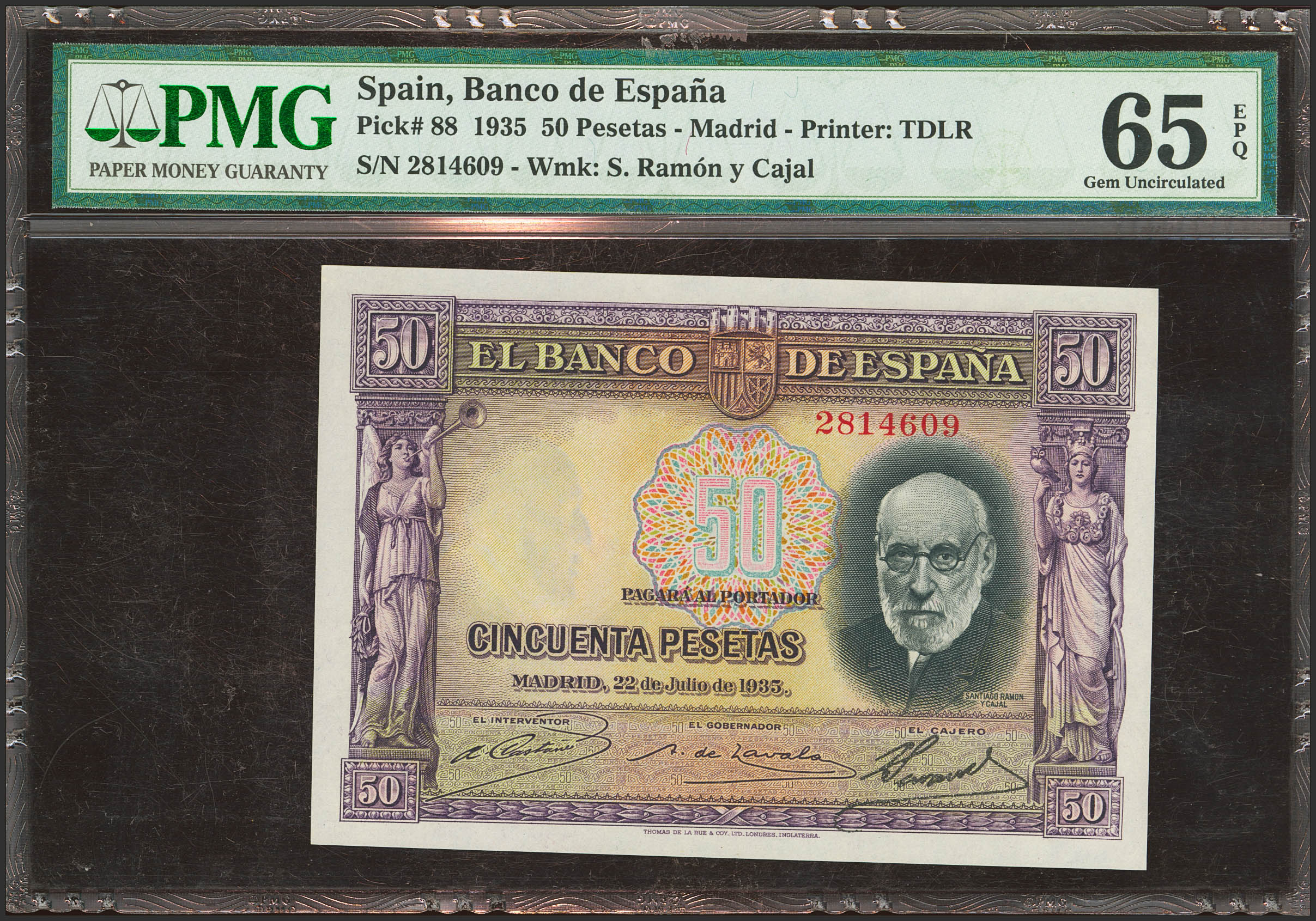 50 Pesetas. 22 de Julio de 1935. Sin serie. (Edifil 2023: 366, Pick: 88a). Inusual en esta calidad, apresto original. SC. Encapsulado PMG65EPQ.
