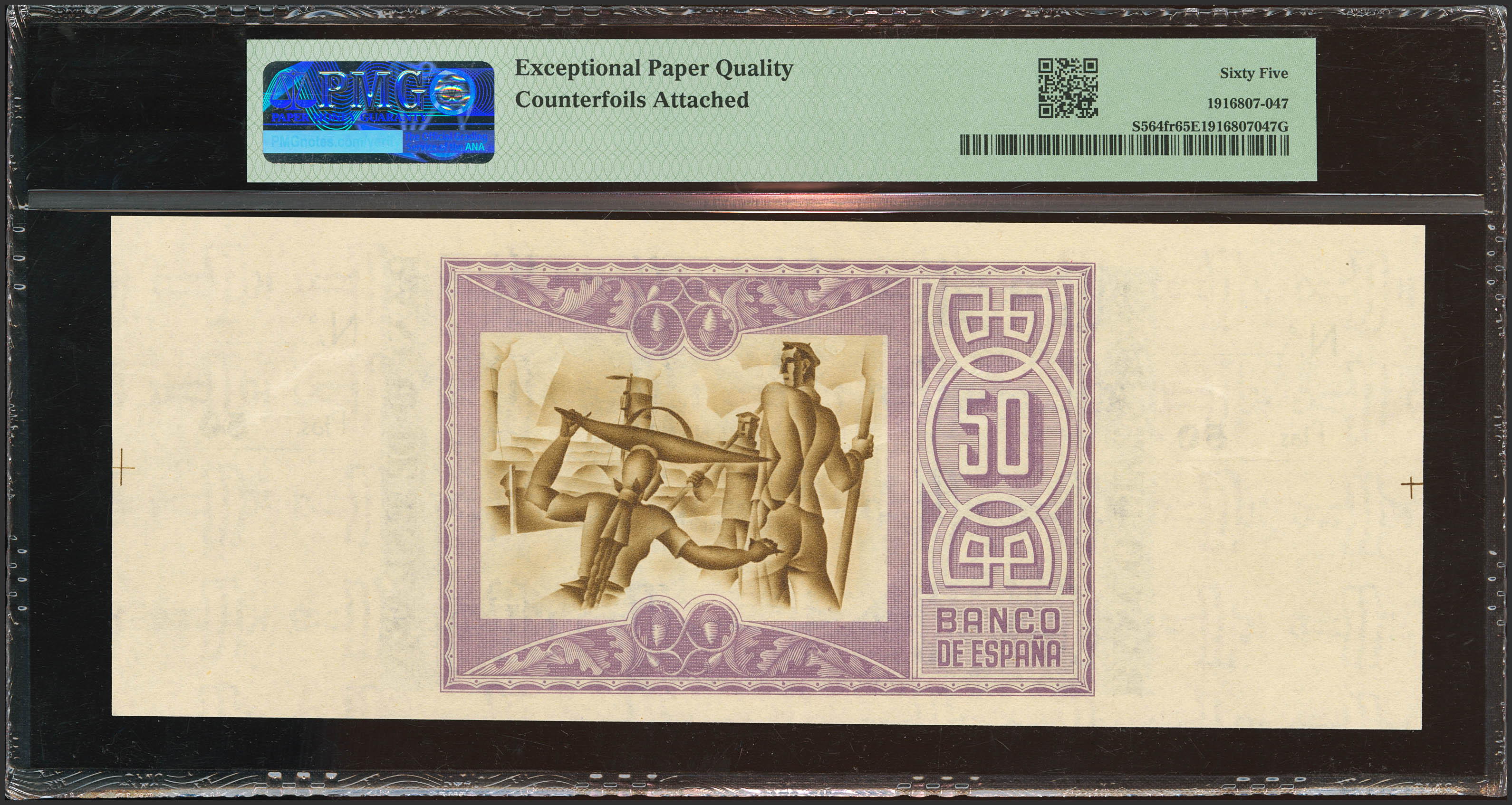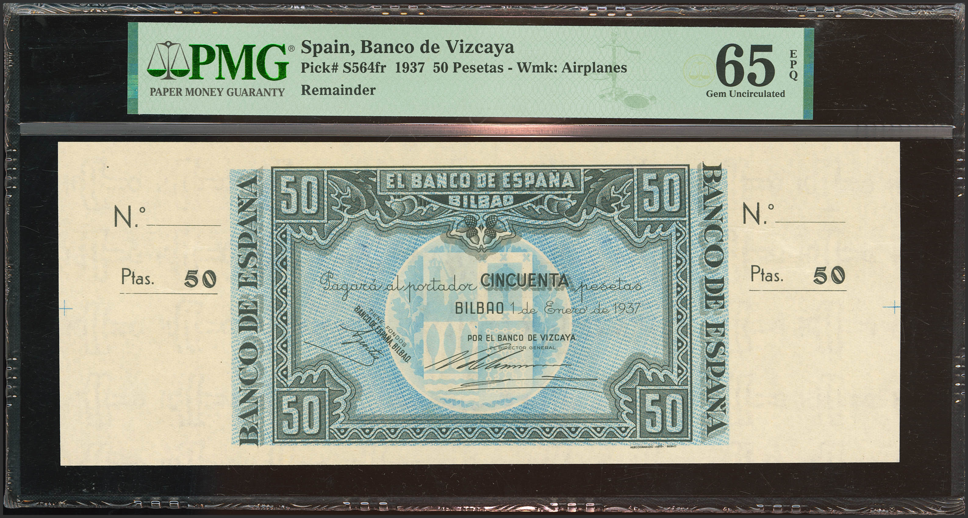 50 Pesetas. 1 de Enero de 1937. Sucursal de Bilbao, antefirma Banco de Vizcaya. Sin serie y sin numeración, con ambas matrices. (Edifil 2023: 389b, Pick: S564fr). Apresto original. SC. Encapsulado PMG65EPQ.
