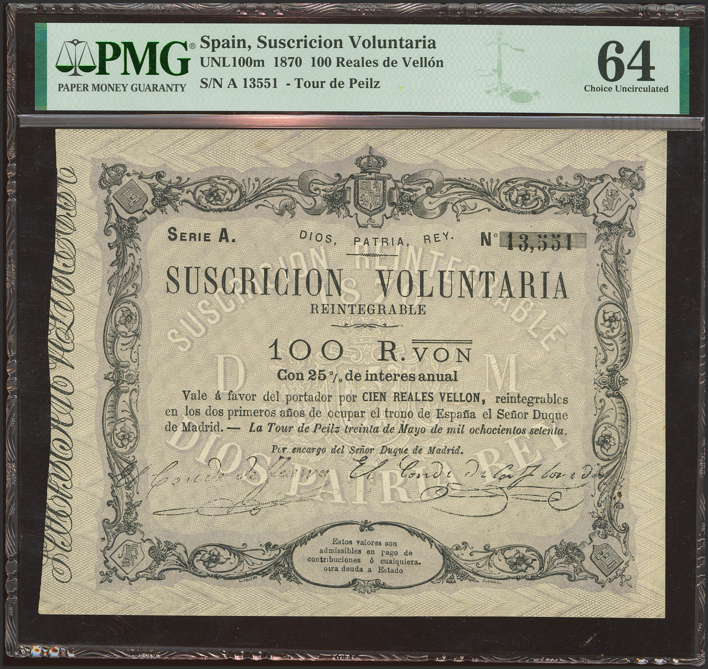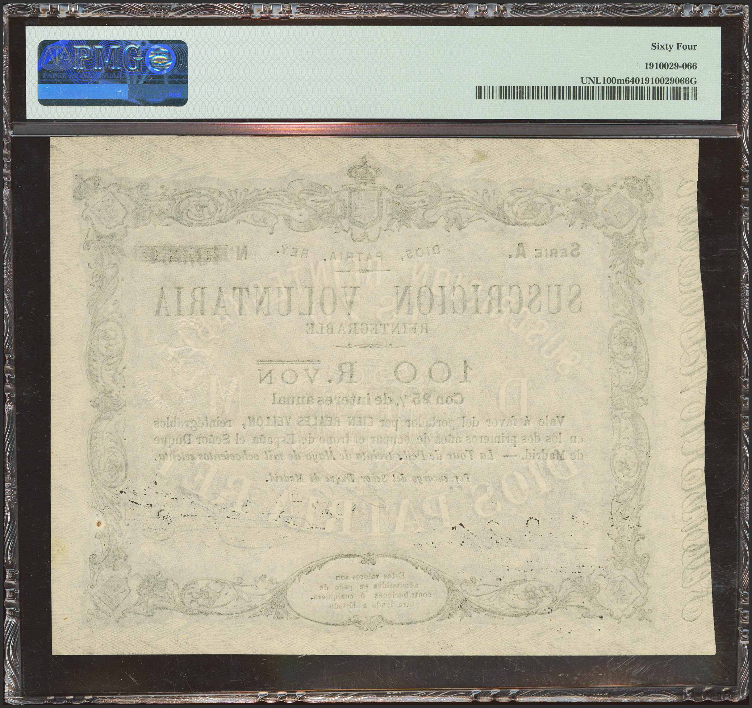 100 Reales de Vellón. 30 de Mayo de 1870. Emisión de Tour de Peilz. Serie A. (Edifil 2023: 196). SC. Encapsulado PMG64.