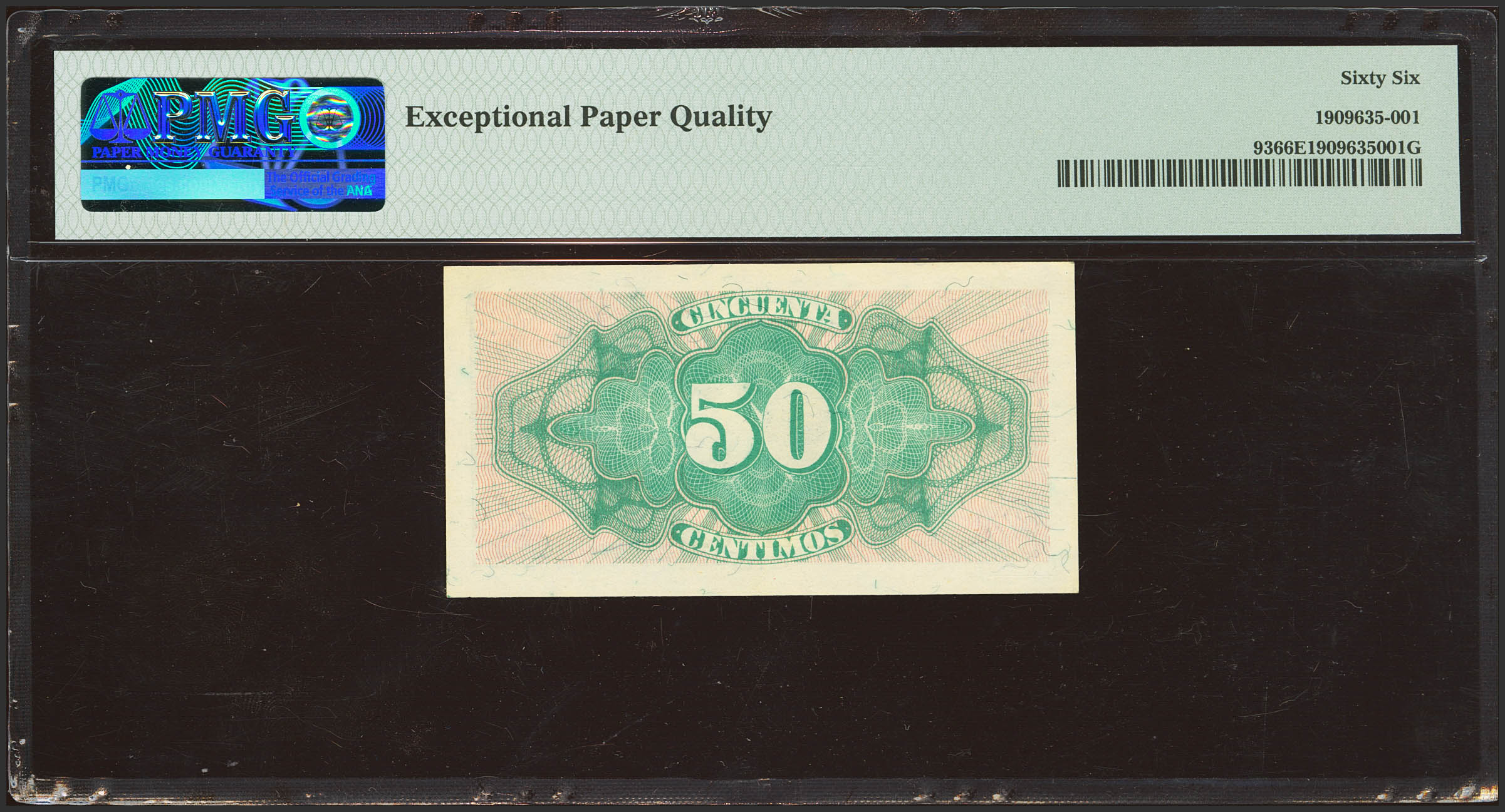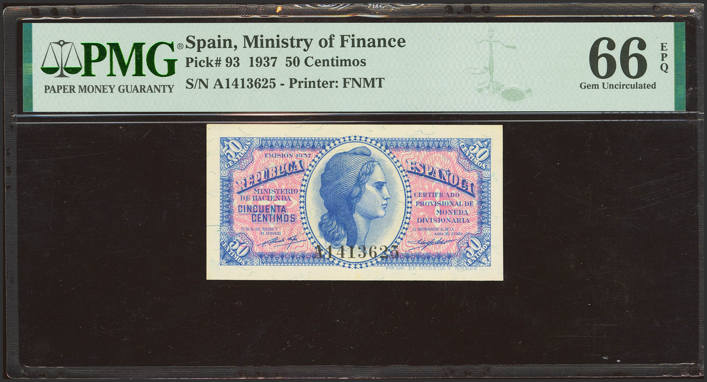 50 Céntimos. 1937. Ministerio de Hacienda. Serie A. (Edifil 2023: 391, Pick: 93). Apresto original. SC. Encapsulado PMG66EPQ.