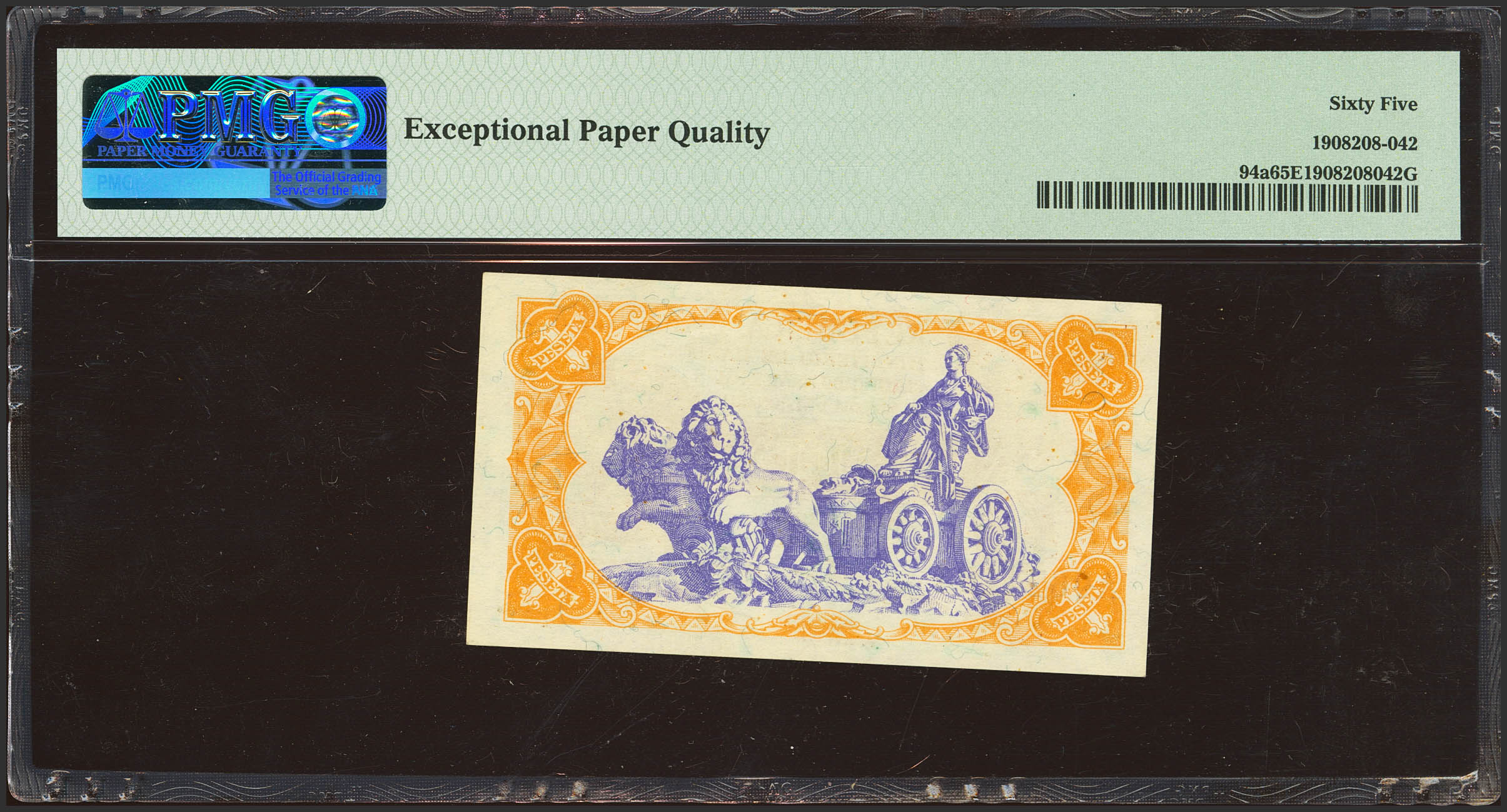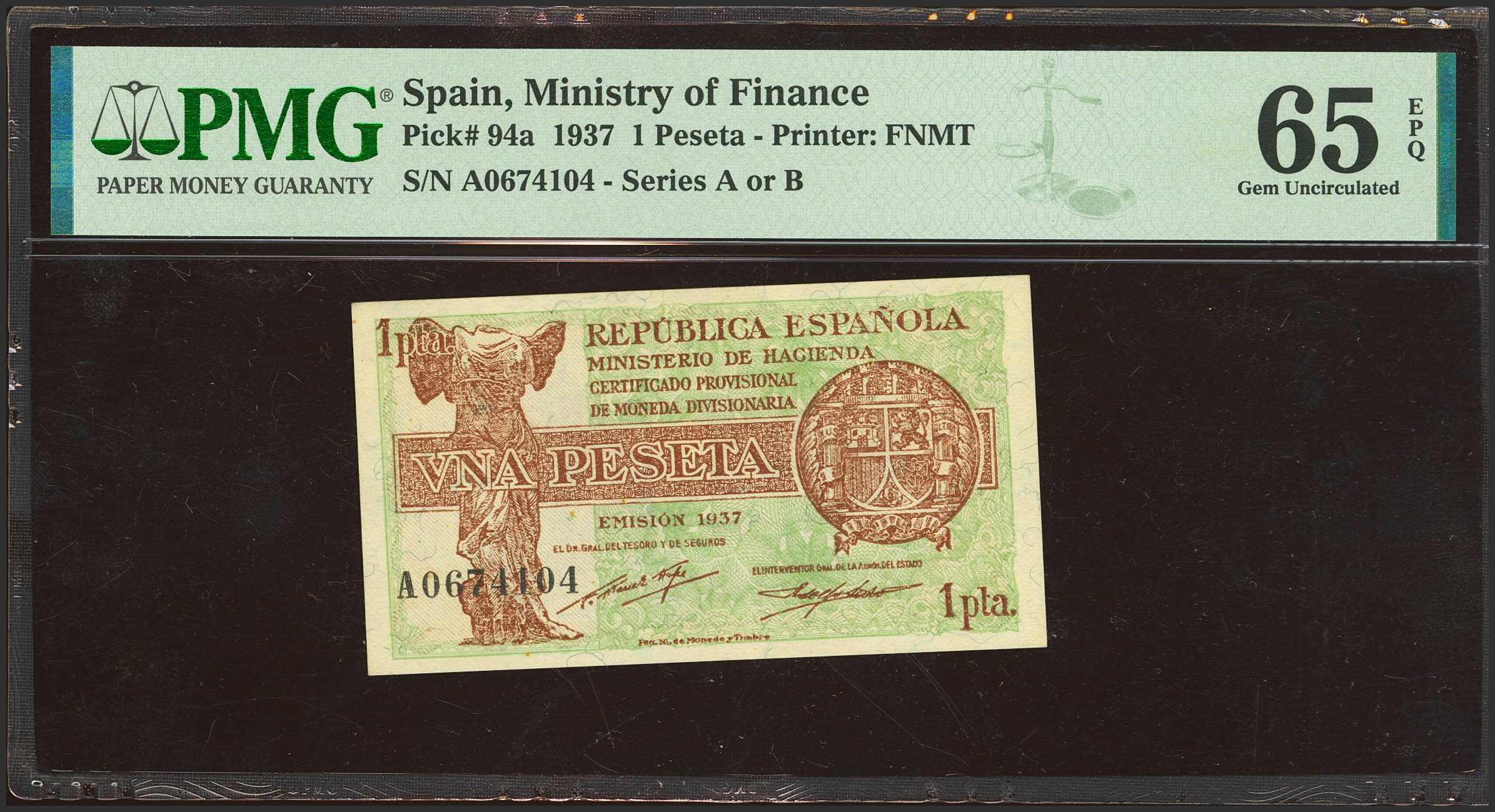 1 Peseta. 1937. Ministerio de Hacienda. Serie A. (Edifil 2023: 392, Pick: 94). Apresto original. SC. Encapsulado PMG65EPQ.