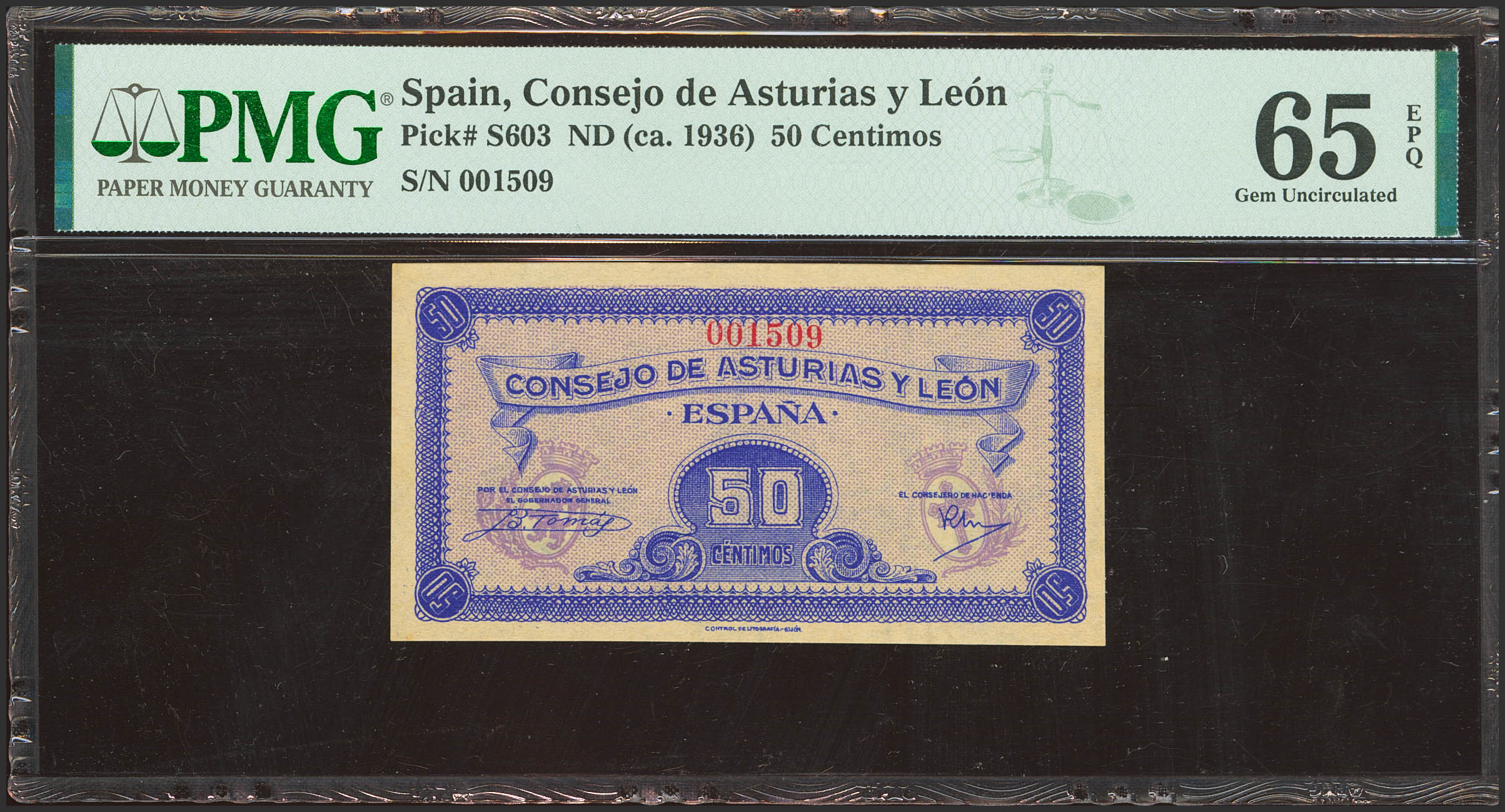 50 Céntimos. 1937. Asturias y León. Sin serie. (Edifil 2023: 396, Pick: S603). Rarísimo, especialmente en esta excepcional calidad, apresto original. SC. Encapsulado PMG65EPQ.