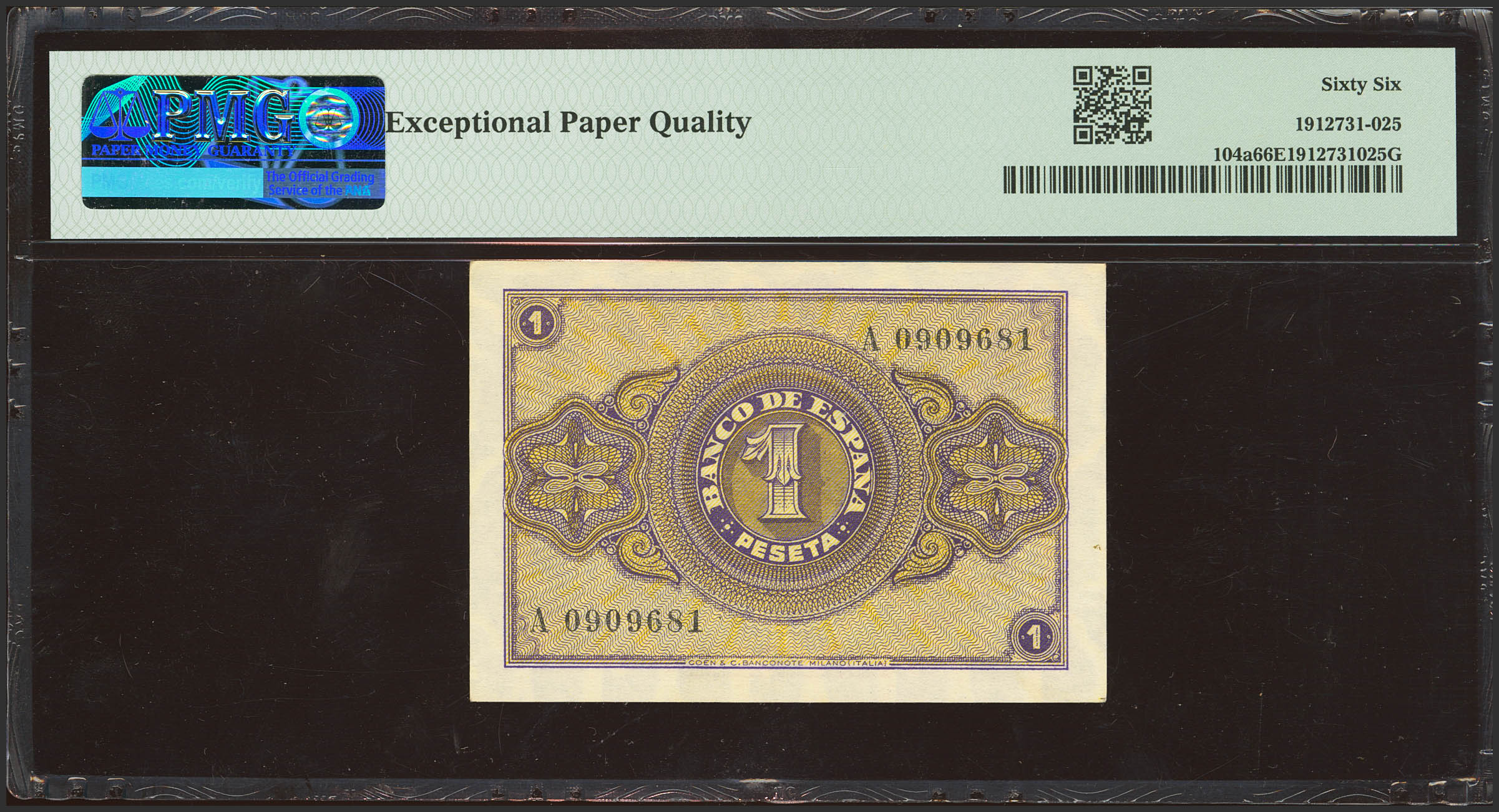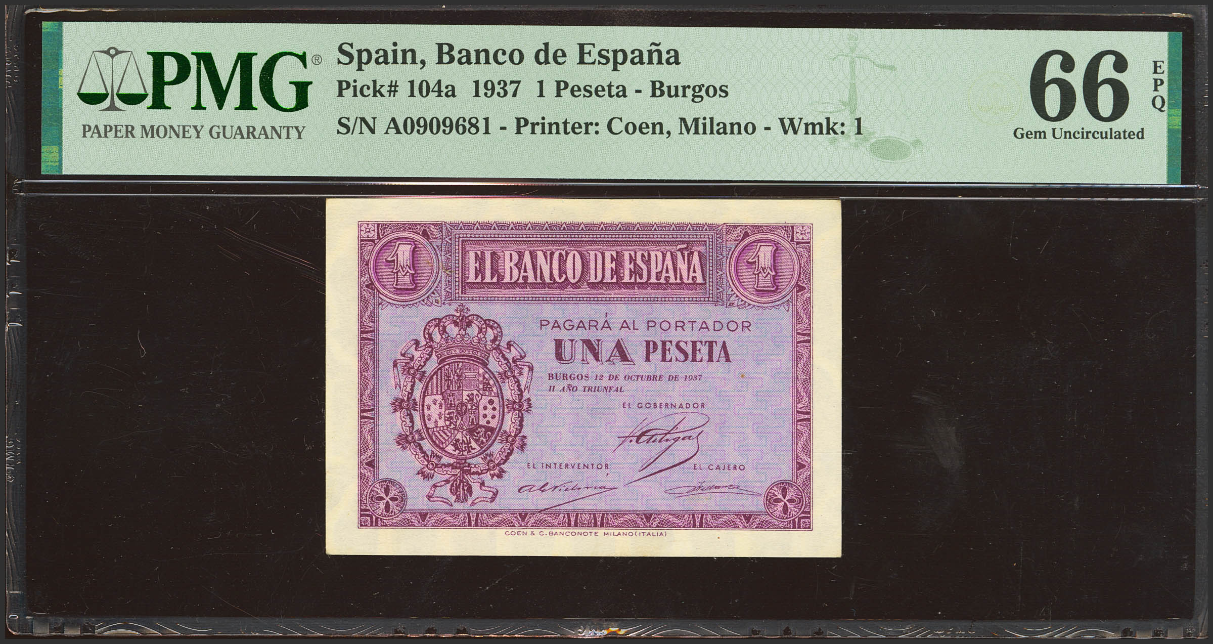 1 Peseta. 12 de Octubre de 1937. Serie A. (Edifil 2023: 425, Pick: 104a). Inusual en esta excepcional calidad, apresto original. SC. Encapsulado PMG66EPQ.