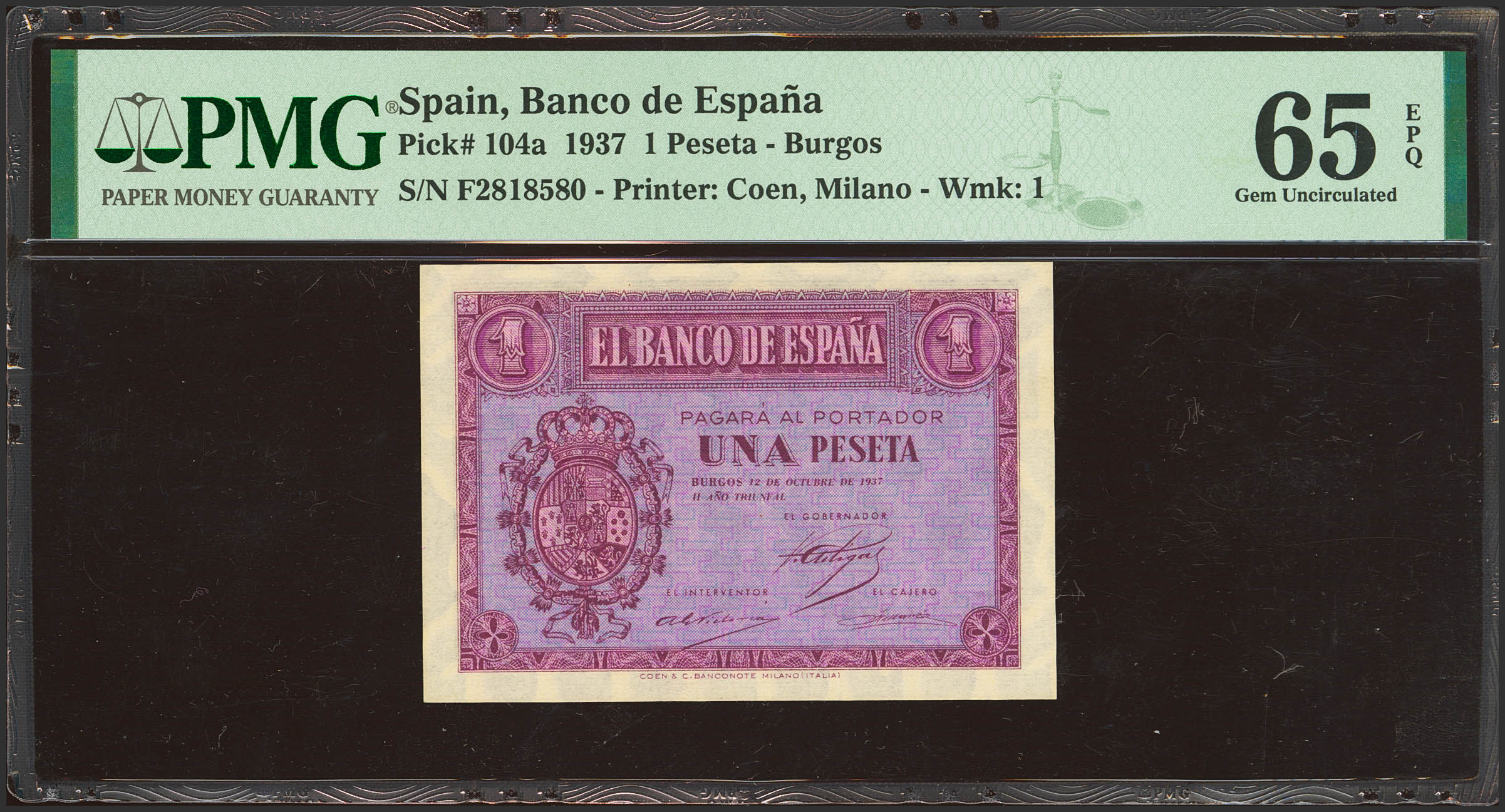 1 Peseta. 12 de Octubre de 1937. Serie F, última serie emitida. (Edifil 2023: 425a, Pick: 104a). Apresto original. SC. Encapsulado PMG65EPQ.