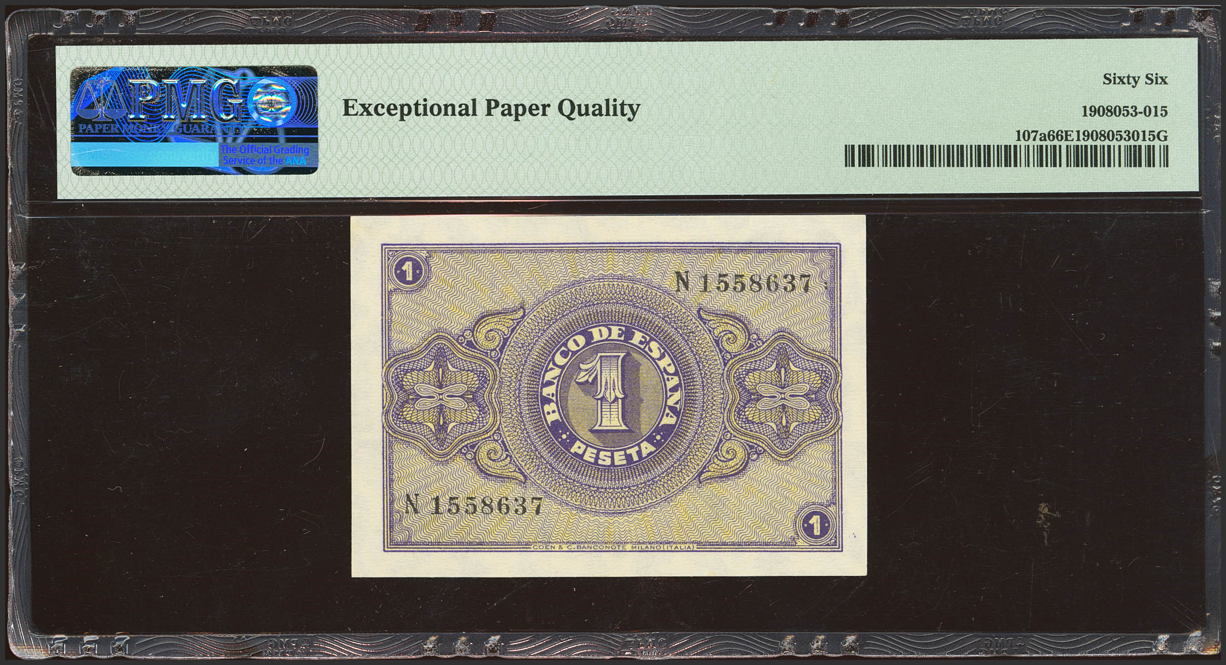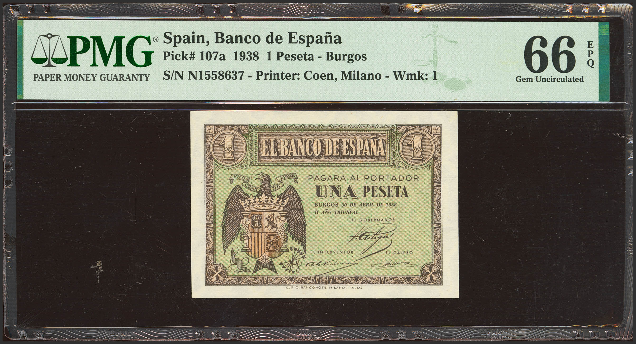 1 Pesetas. 30 de Abril de 1938. Serie N. (Edifil 2023: 428a, Pick: 108a). Inusual en esta calidad, apresto original. SC. Encapsulado PMG66EPQ.
