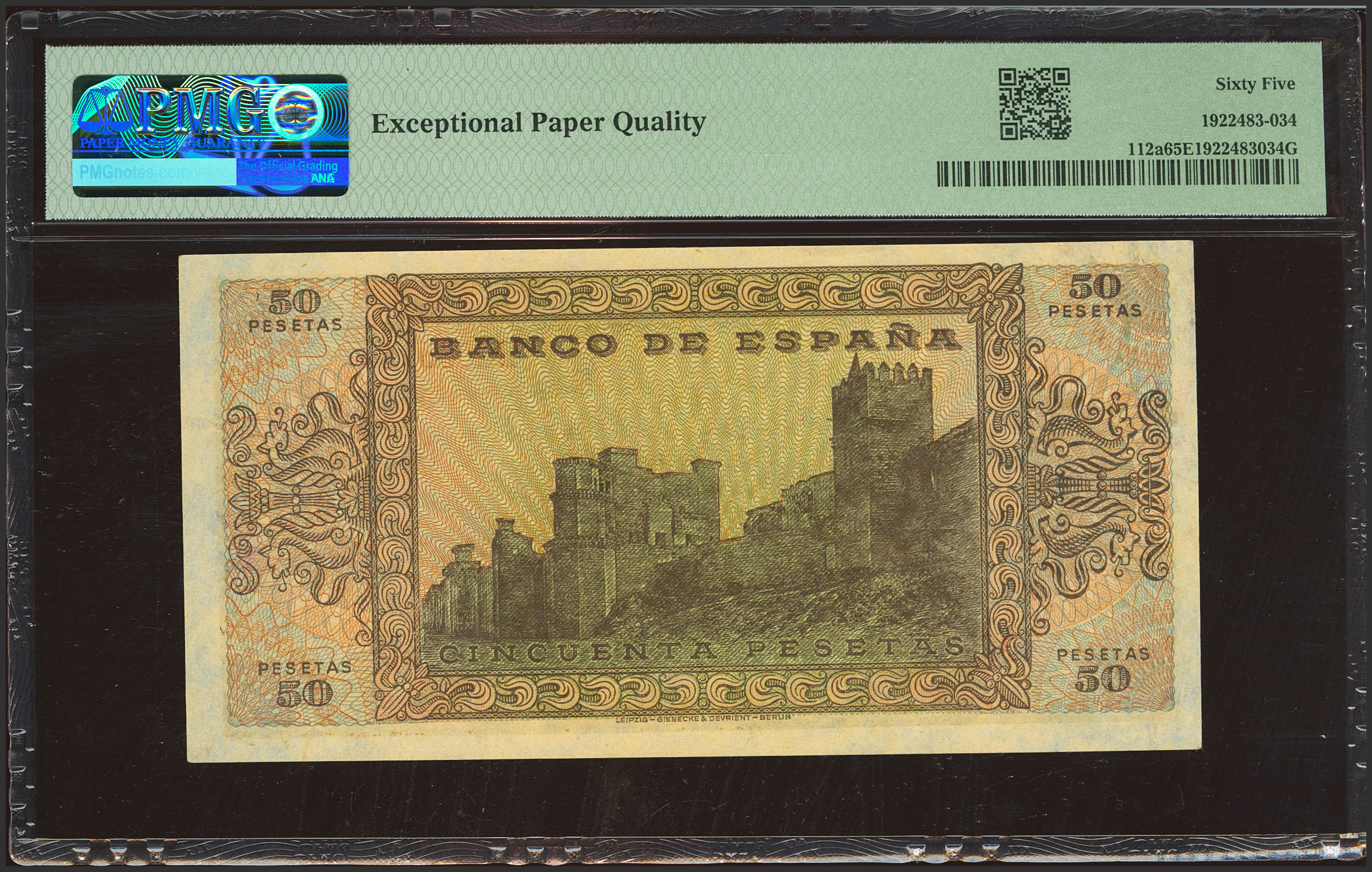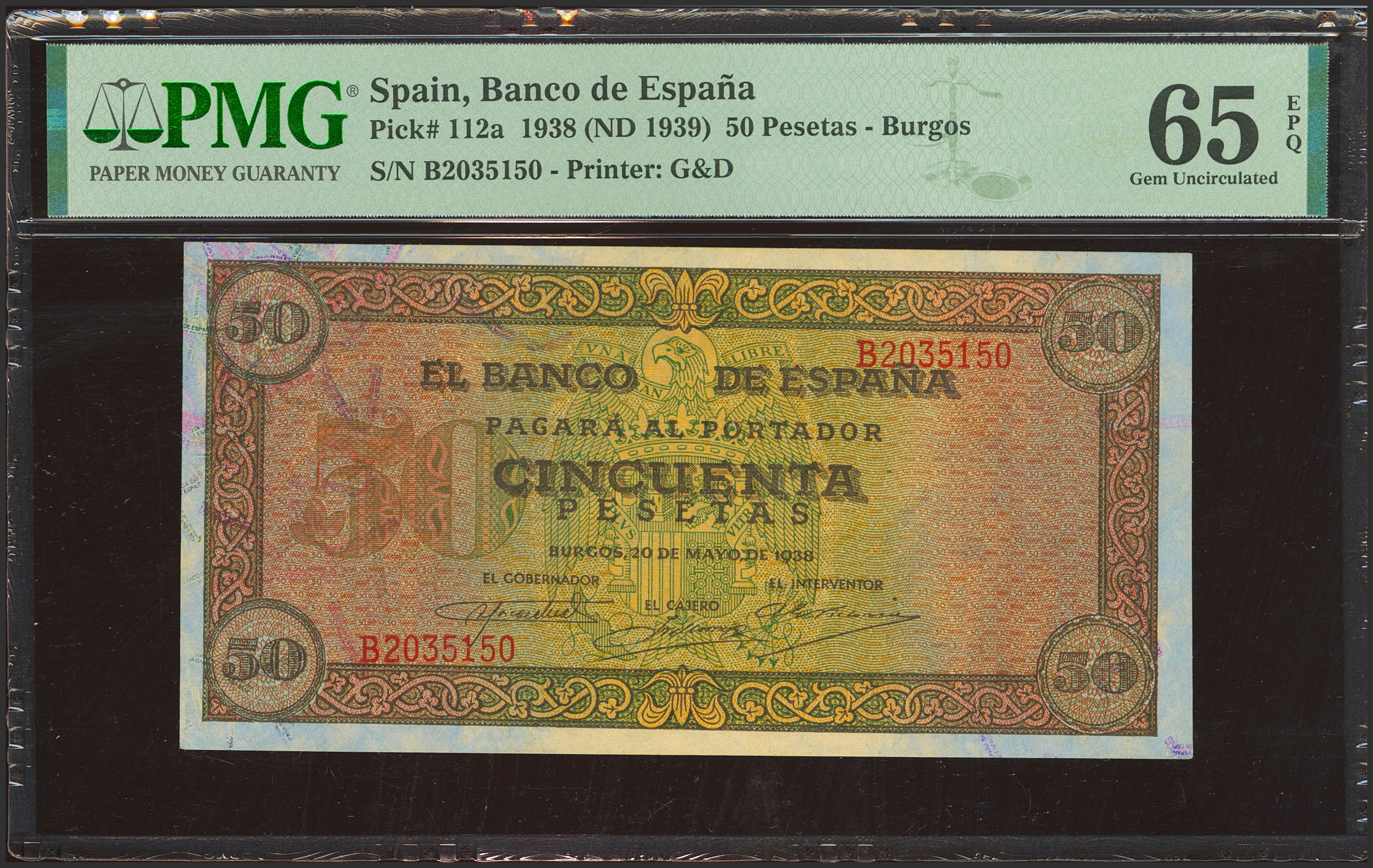 50 Pesetas. 20 de Mayo de 1938. Serie B. (Edifil 2023: 431a, Pick: 112a). Inusual en esta excepcional calidad, apresto original. SC. Encapsulado PMG65EPQ.
