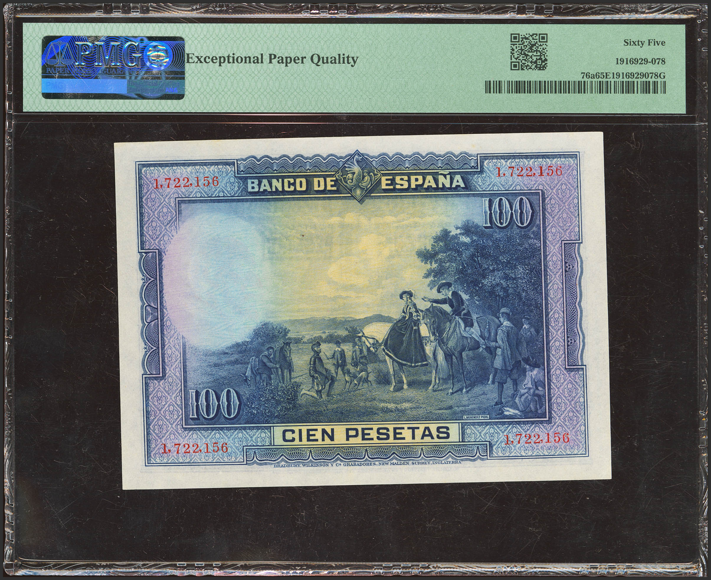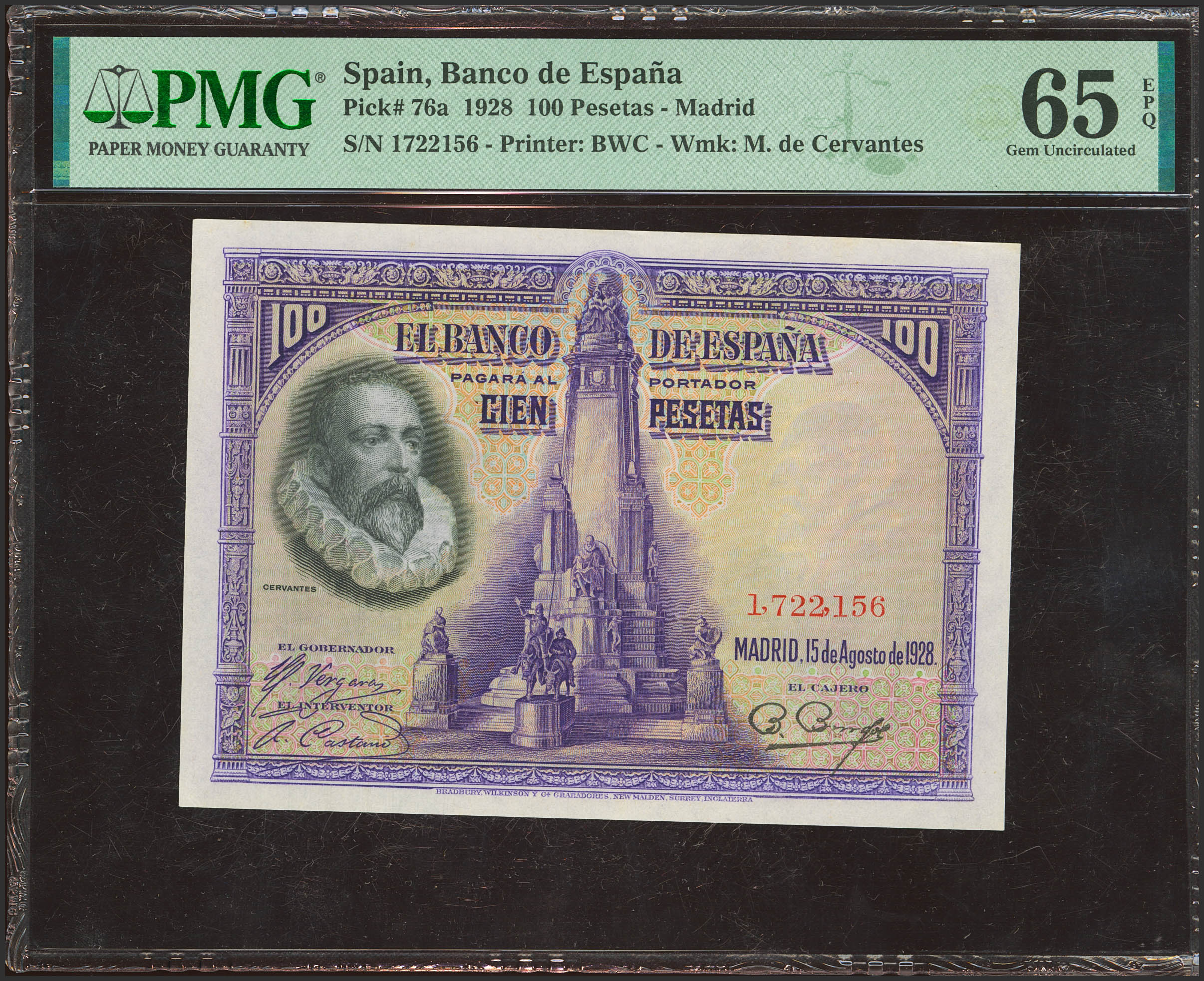 100 Pesetas. 15 de Agosto de 1928. Sin serie. (Edifil 2023: 355, Pick: 76a). Inusual en esta excepcional calidad, apresto original. SC. Encapsulado PMG65EPQ.