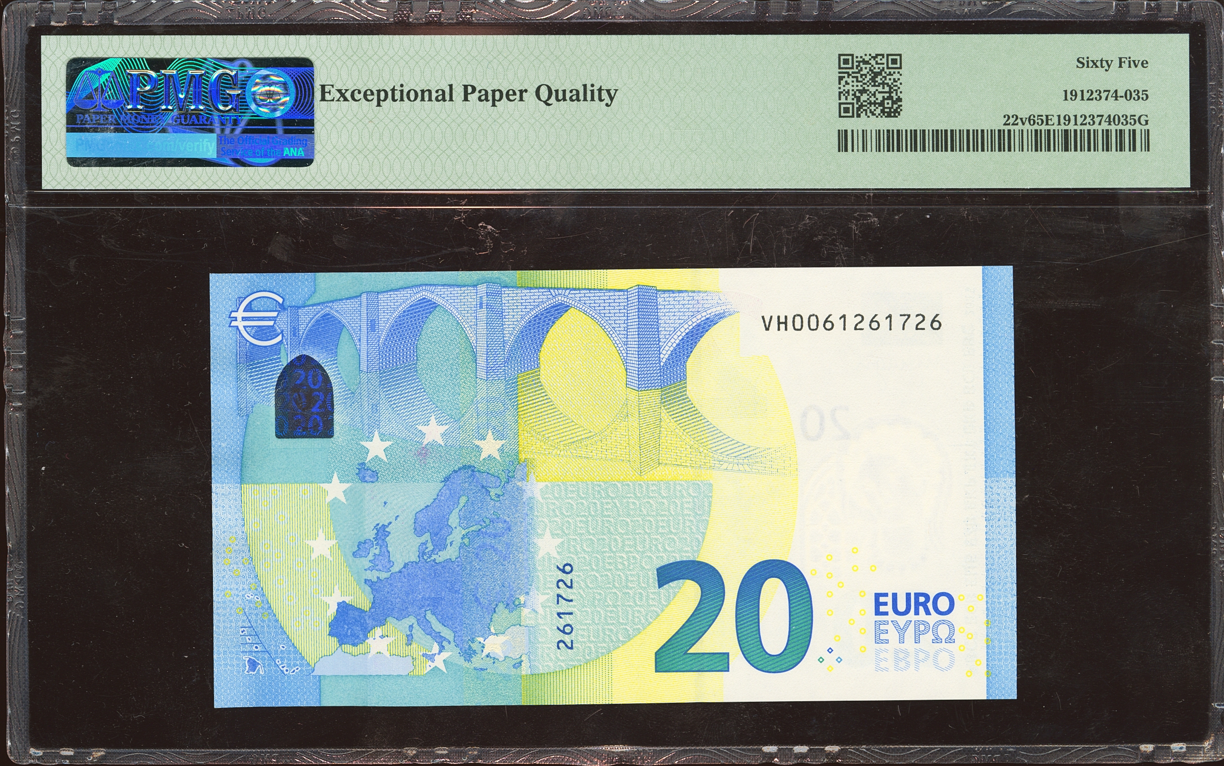 20 Euros. 25 de Noviembre de 2015. Firma Draghi. Serie especial VH (España). (Edifil 2023: 495a, Pick: 22v). SC. Encapsulado PMG65EPQ.