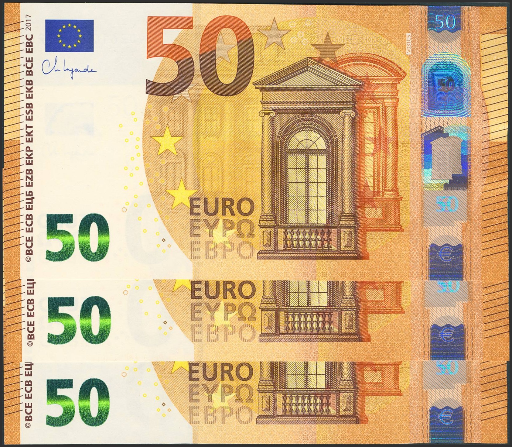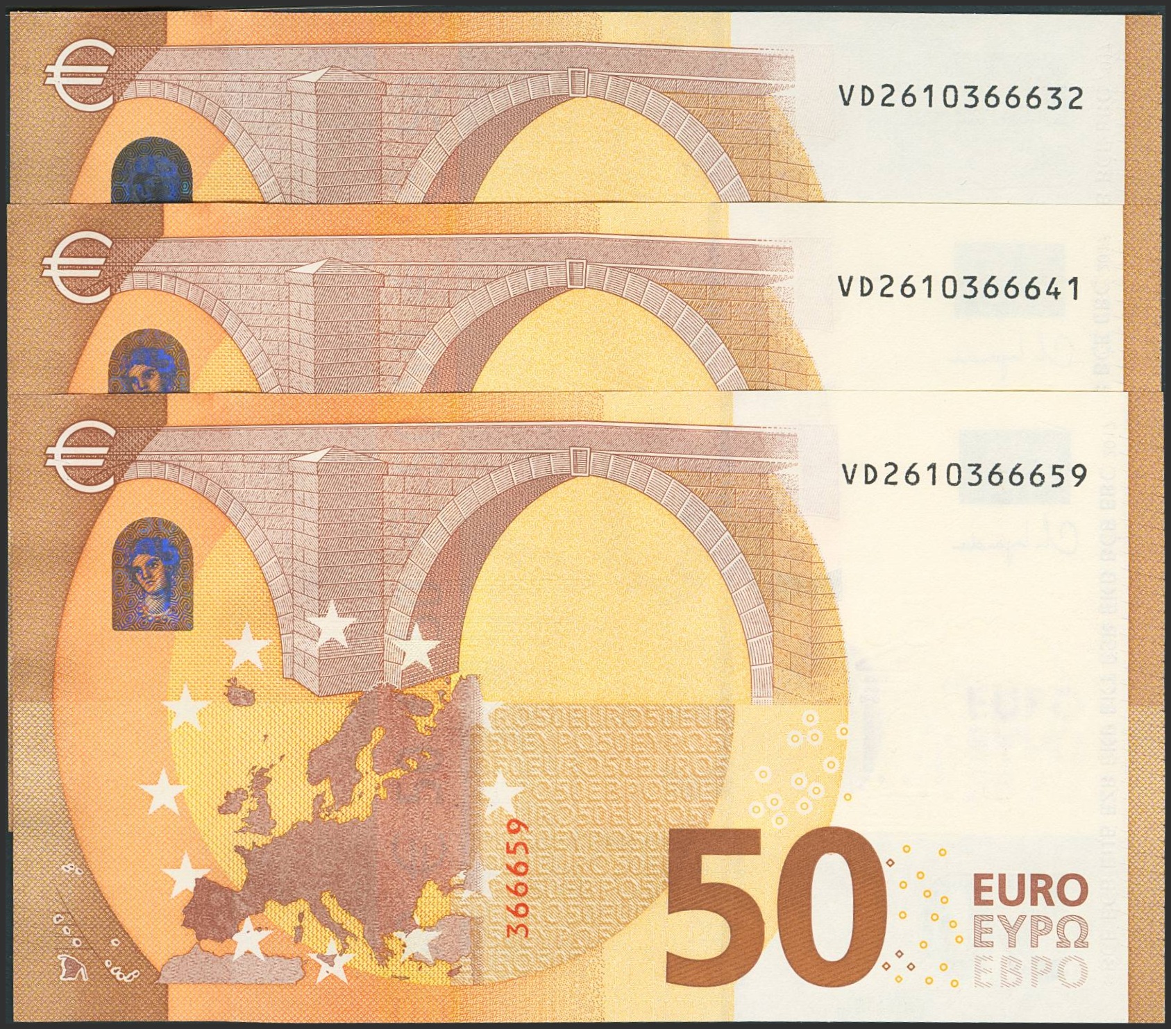 50 Euros. 4 de Abril de 2017. Trío correlativo (cabe recordar que el último dígito de todos los billetes denominados en euros es para control interno del Banco Central Europeo, el que marca la correlatividad de los billetes es el penúltimo dígito). Firma Draghi. Serie VD (España). (Edifil 2023: 496Ab). SC.