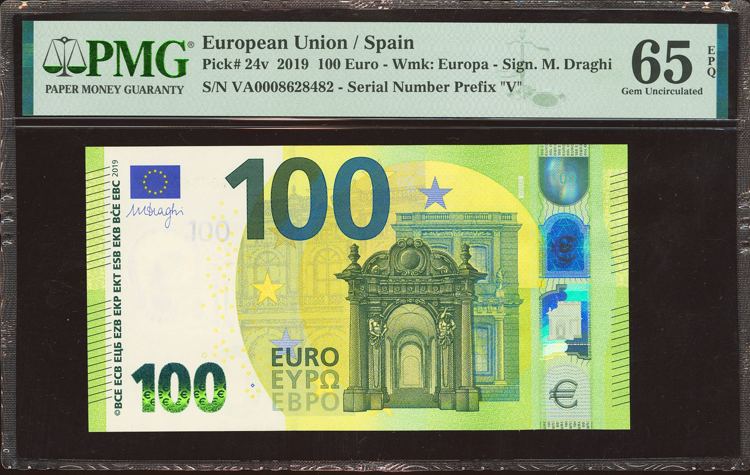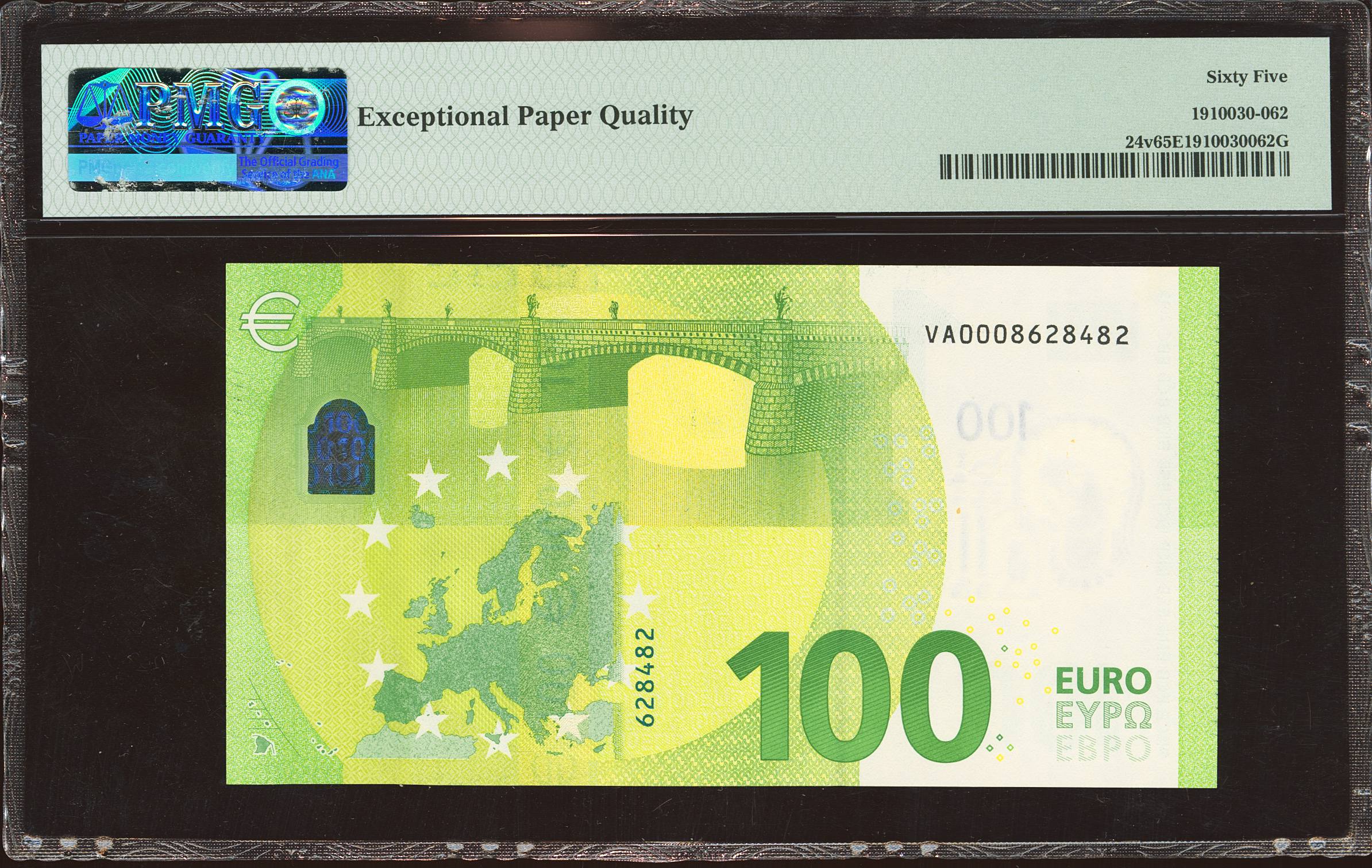 100 Euros. 2019. Firma Draghi. Serie VA (España) y numeración baja. (Edifil 2023: 497, Pick: 24v). SC. Encapsulado PMG65EPQ.