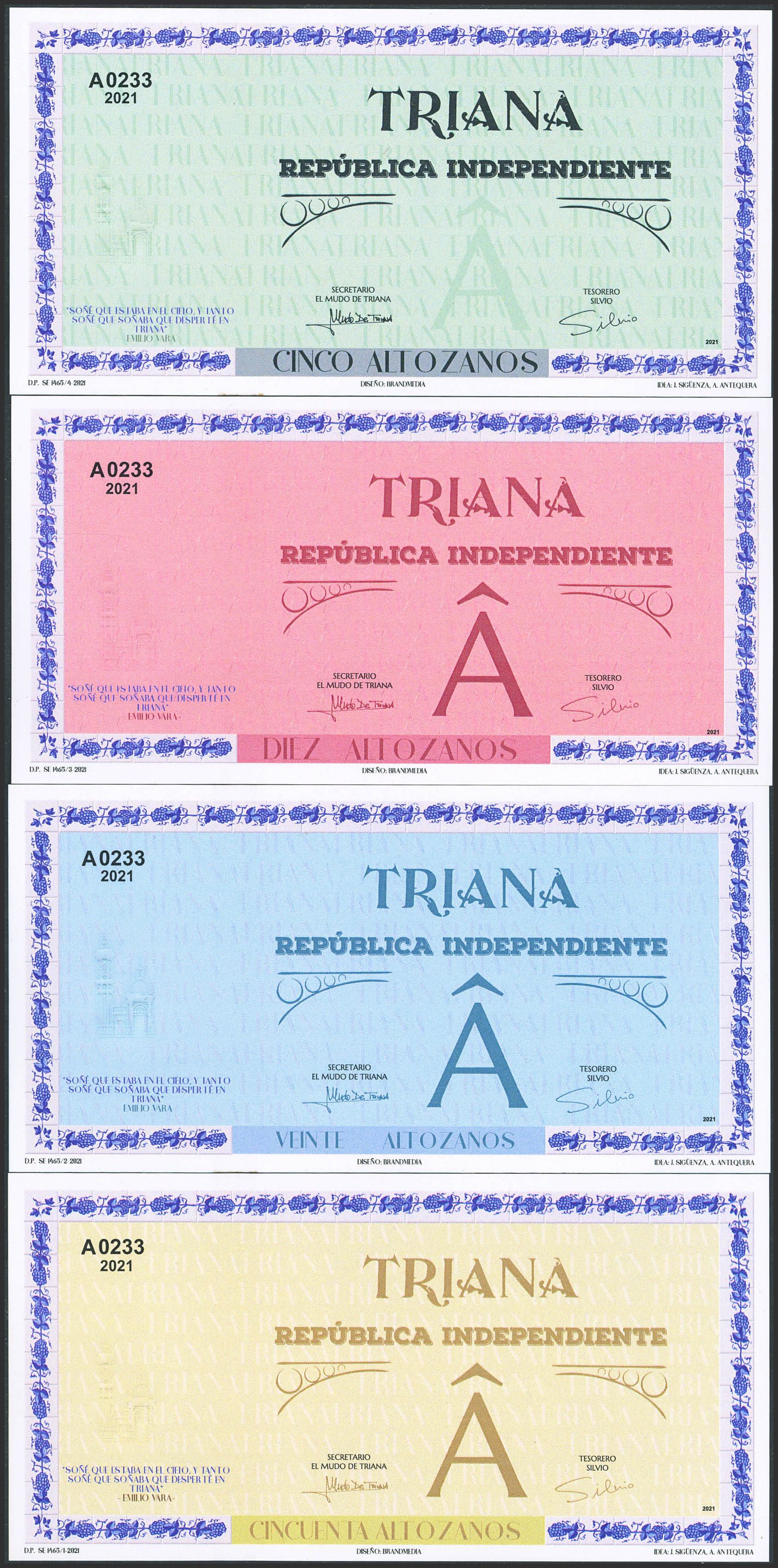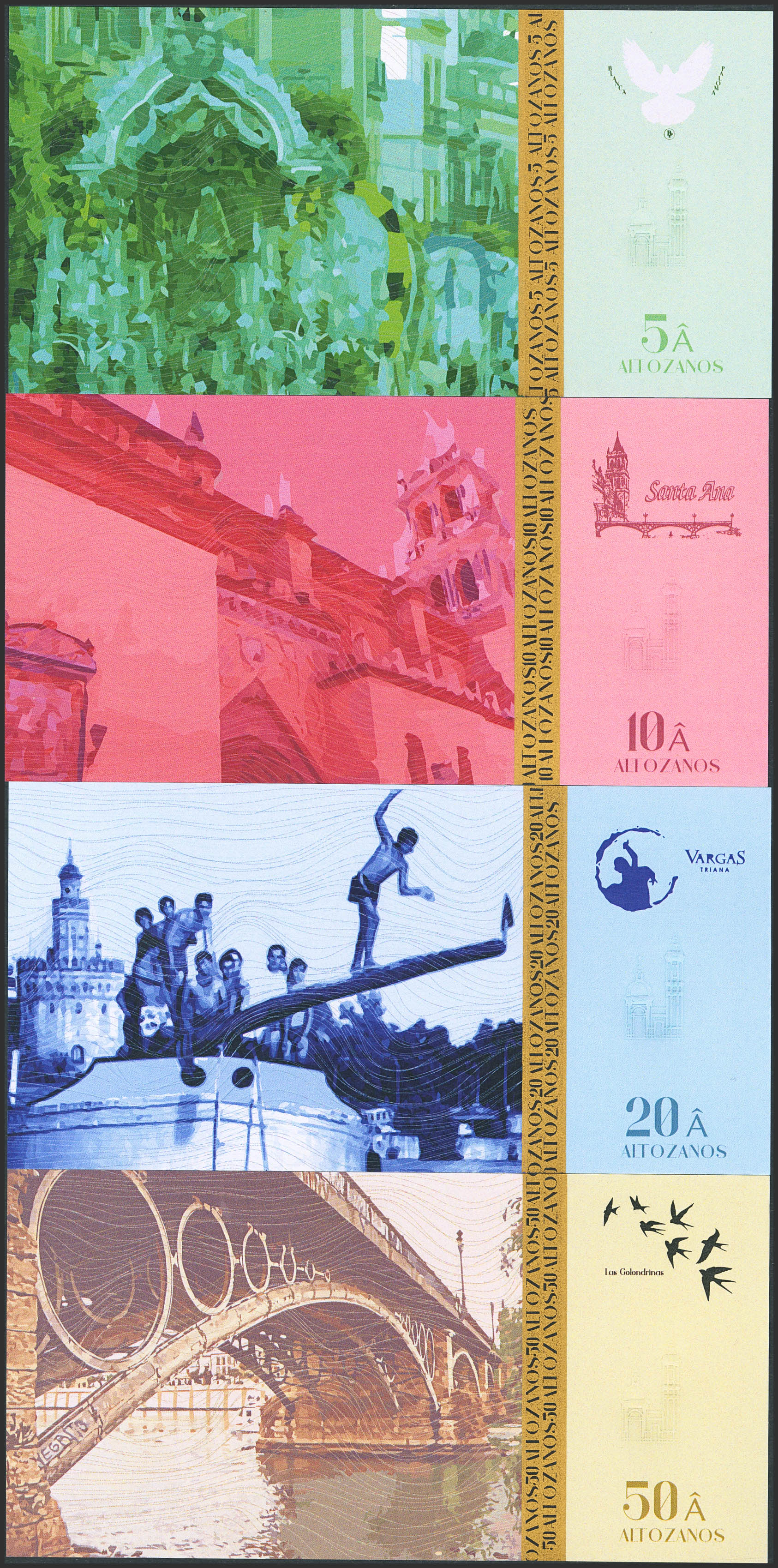 Serie de 4 billetes de fantasía con una moneda "turística" de 5 Altozanos, 10 Altozanos, 20 Altozanos y 50 Altozanos. 2021. Altozanos de Triana, Sevilla. Diseño de Brandemia. SC.PD: Finalista de los Premios Agripina 2021 y elegida como idea más original. El nombre "Altozano" proviene de la plaza de entrada al barrio desde el Casco Histórico hispalense. Su símbolo propio (una A con acento circunflejo) representa el hogar que es Triana para los suyos. La marca de agua es la Capilla del Carmen, paradigmática dentro del barrio y una de las obras que quedan en Sevilla del gran arquitecto Aníbal González, arquitecto de la Exposición Iberoamericana de 1929 y creador, entre otros, de la Plaza de España o de la Plaza de América.