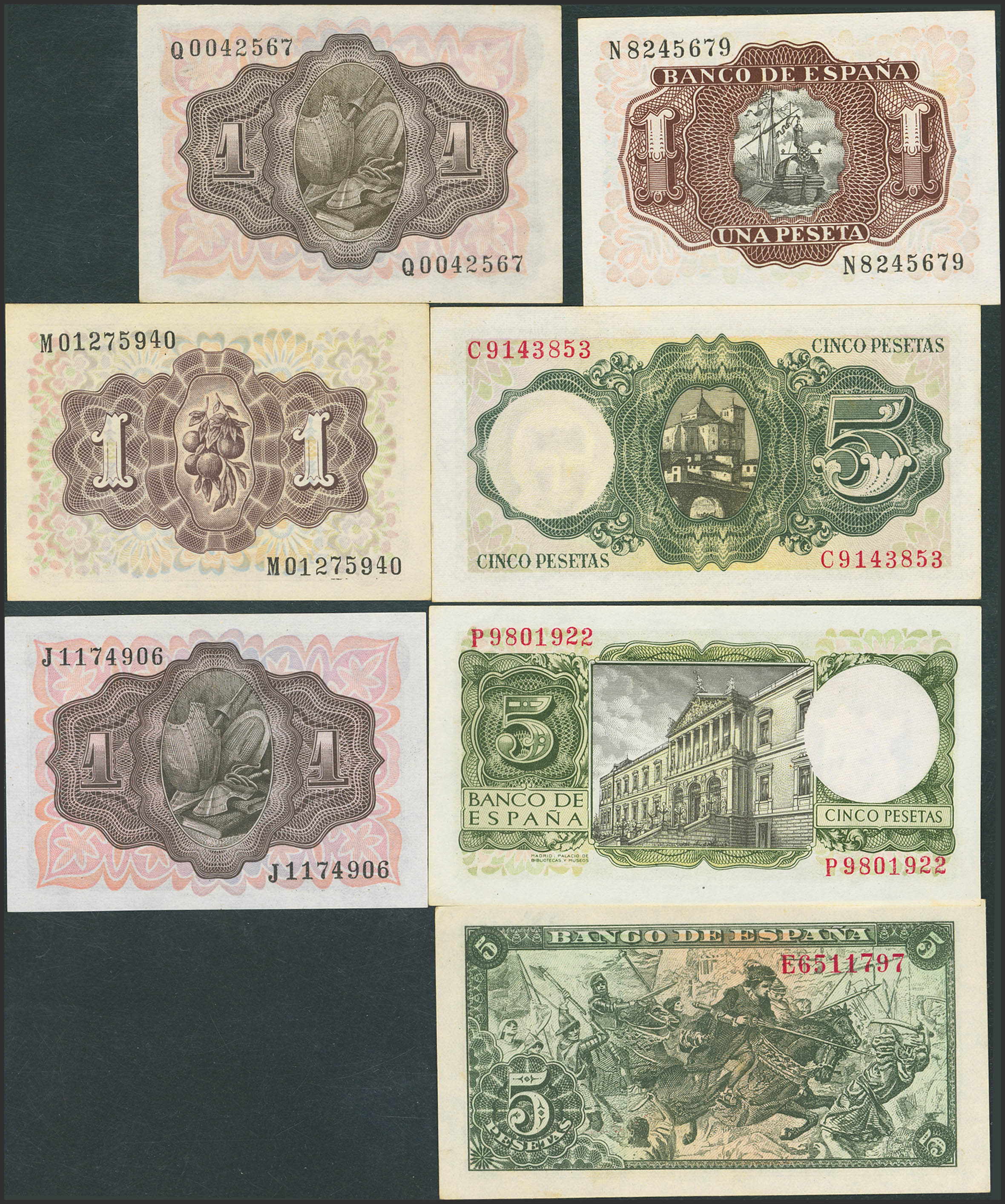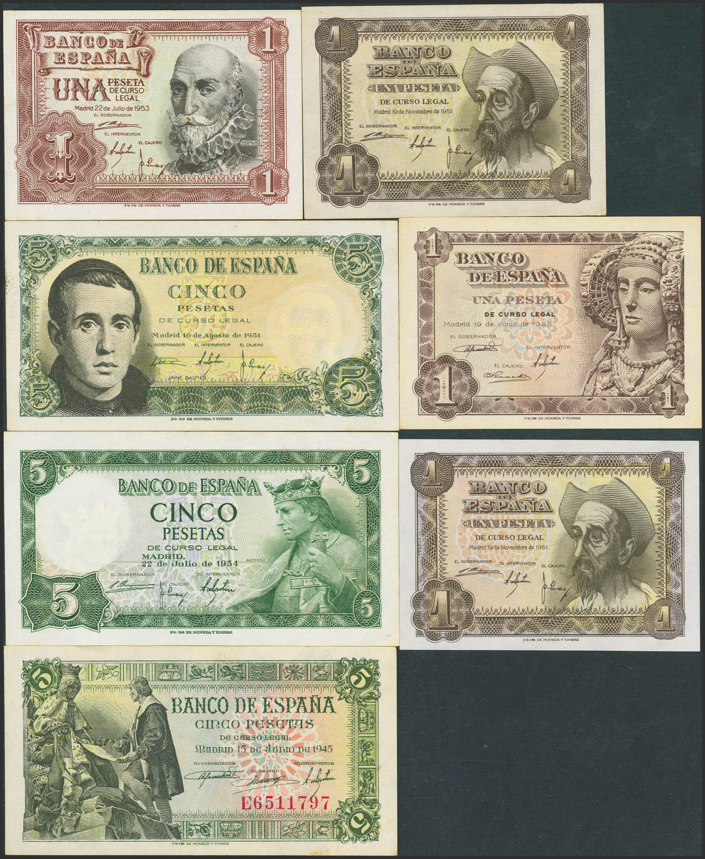 Conjunto de 7 billetes del Banco de España, de diferentes emisiones y en diversas calidades. A EXAMINAR.