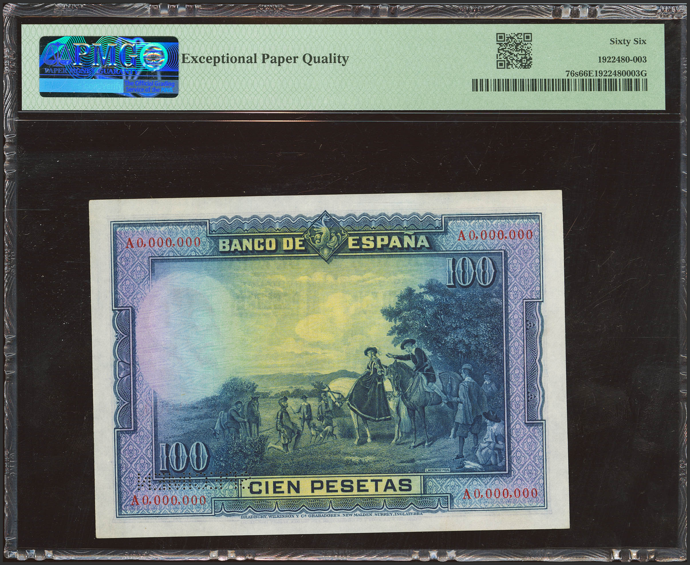 100 Pesetas. 15 de Agosto de 1928. Numeración A0000000, taladrado SPECIMEN en el lugar destinado a la firma del cajero (Edifil 2023: 355M, Pick: 76s). Rarísimo, especialmente en esta excepcional calidad, apresto original. SC. Encapsulado PMG66EPQ.