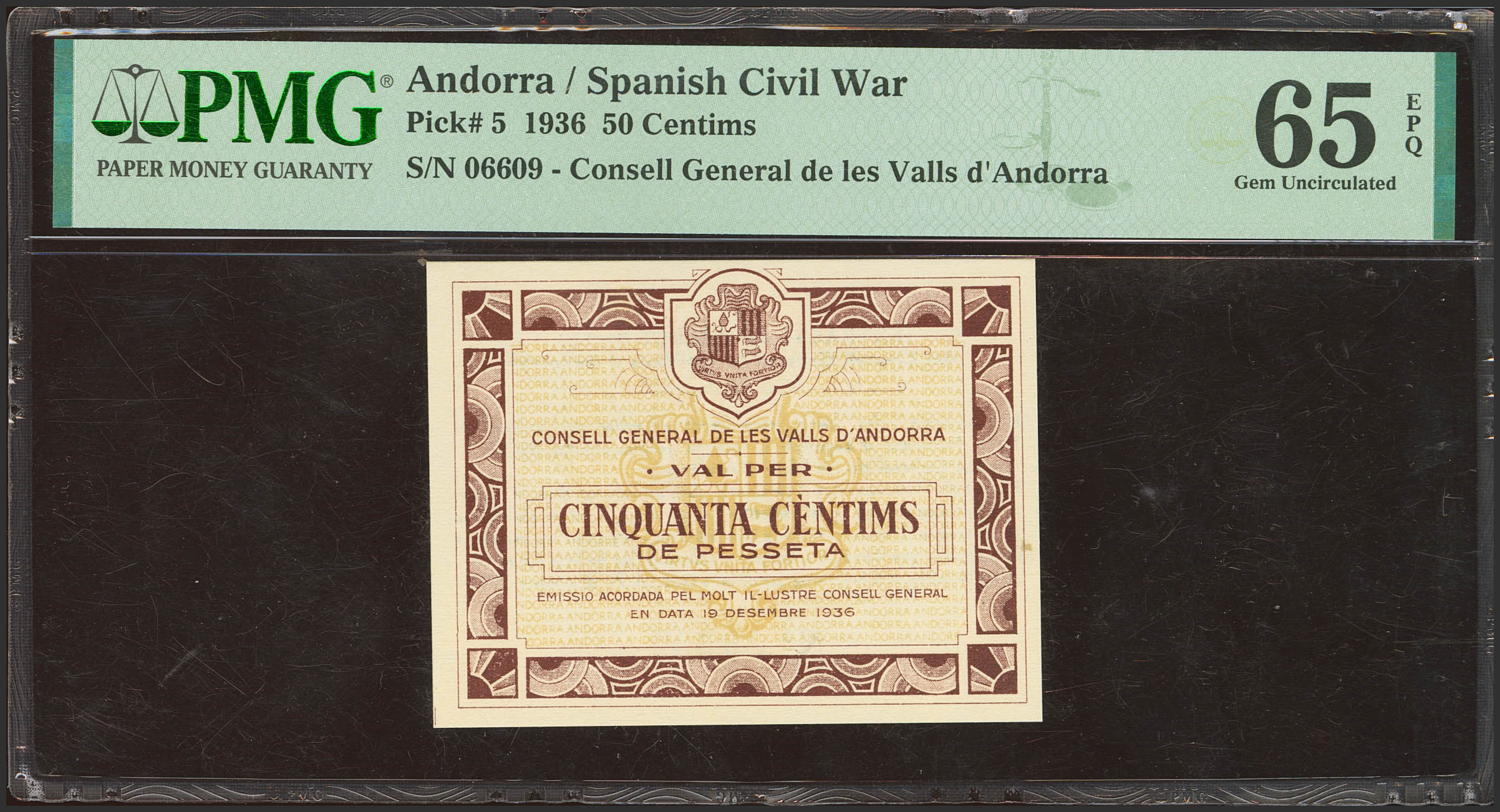 ANDORRA. 50 Centims. 19 de Diciembre de 1936. Sin serie. (Edifil 2023: 1, Pick: 5). Raro en esta excepcional calidad, apresto original. SC. Encapsulado PMG65EPQ.