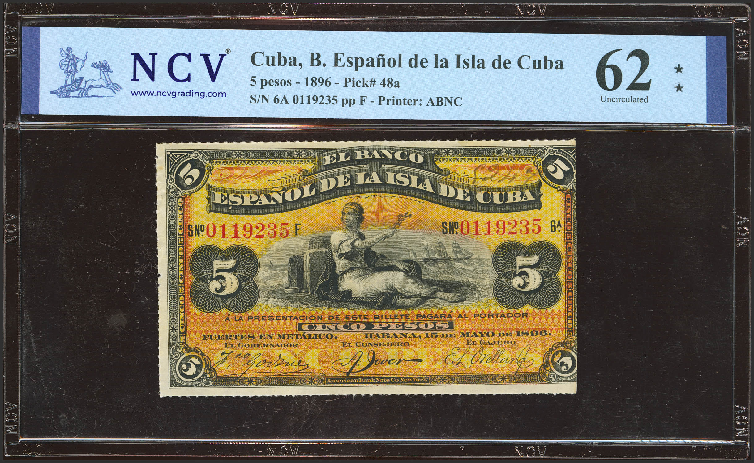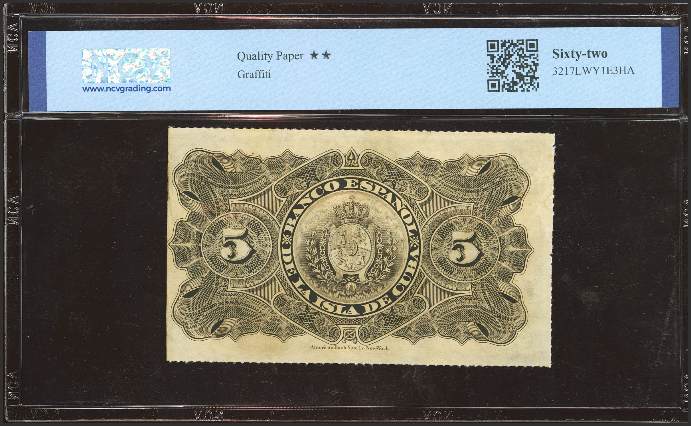 BANCO ESPAÑOL DE LA ISLA DE CUBA. 5 Pesos. 15 de Mayo de 1896. (Edifil 2023: 72, Pick: 48a). Anotaciones. SC-. Encapsulado NCV62 (graffiti).