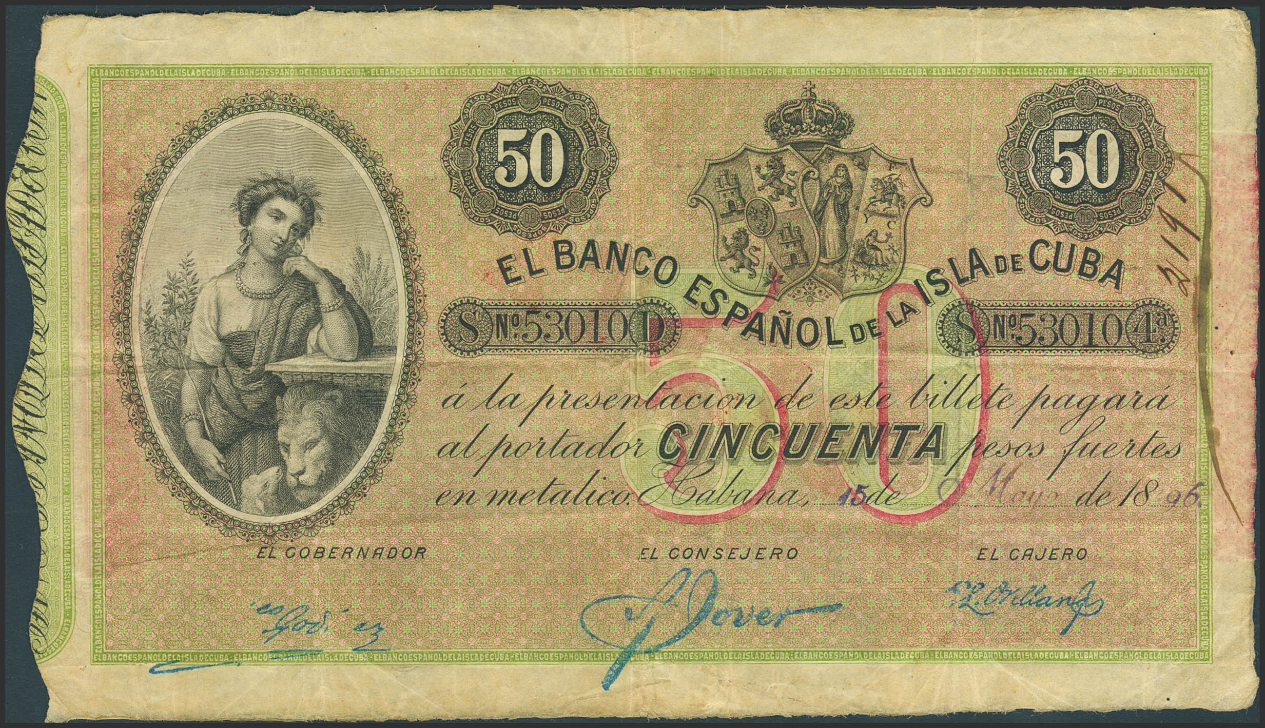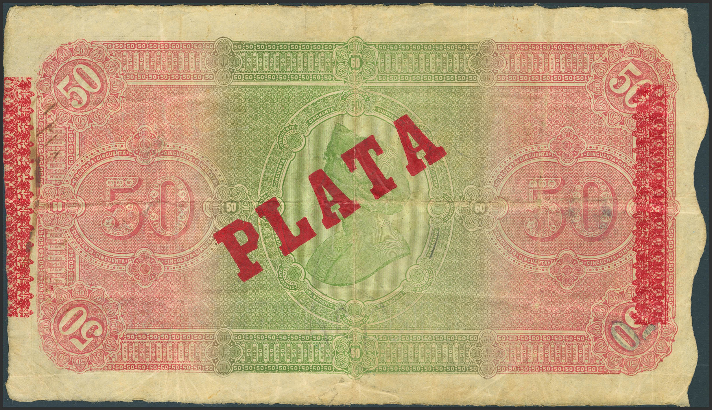 CUBA. 50 Pesos. 15 de Mayo de 1896. Sobrecarga PLATA, al dorso. (Edifil 2023: 83). MBC-.