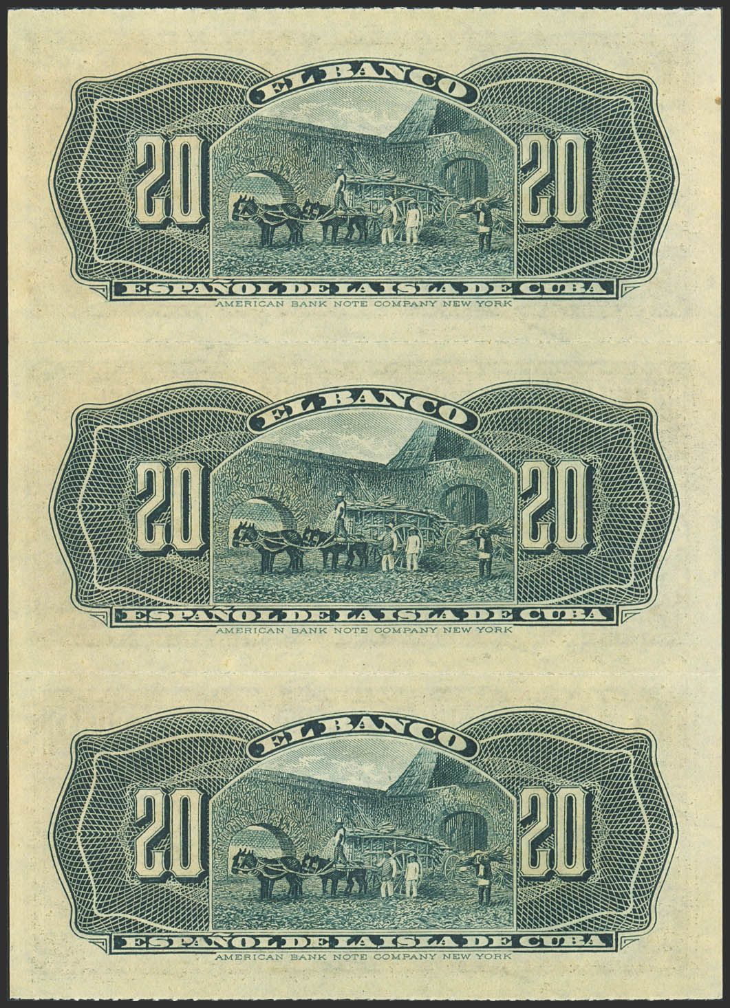 BANCO ESPAÑOL DE LA ISLA DE CUBA. Conjunto de 3 billetes correlativos de 20 Centavos (sin desprender), emitidos el 15 de Febrero de 1897 (Edifil 2023: 85, Pick: 53a). Apresto original. SC.