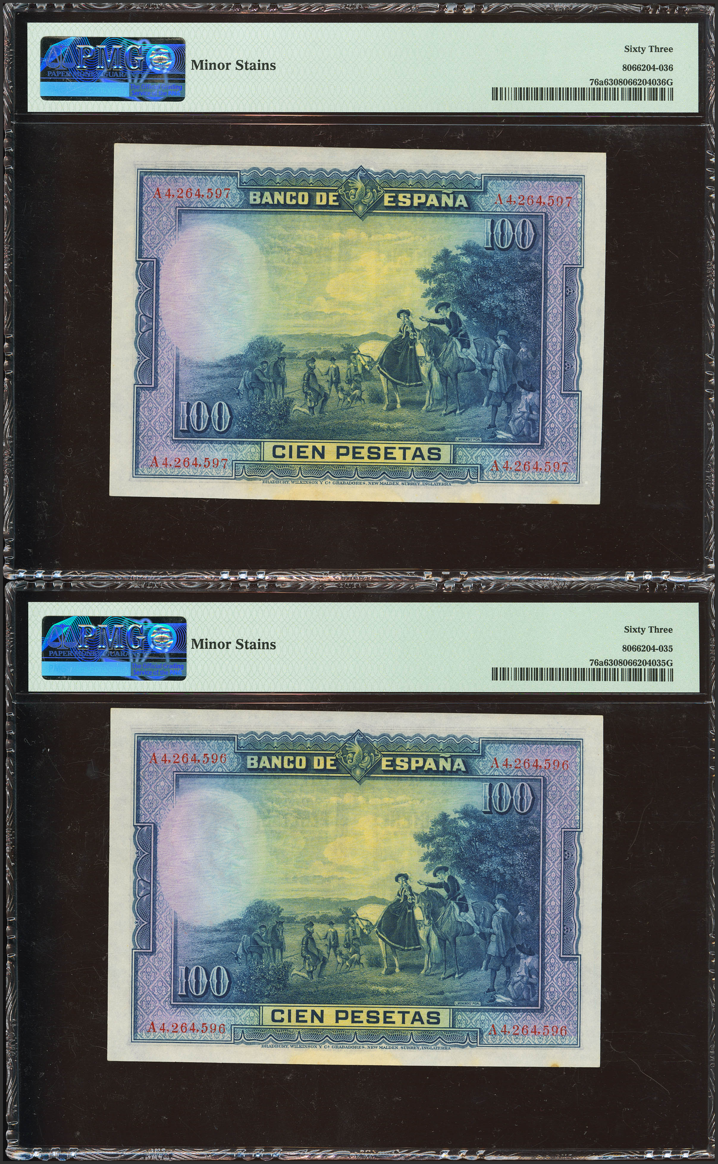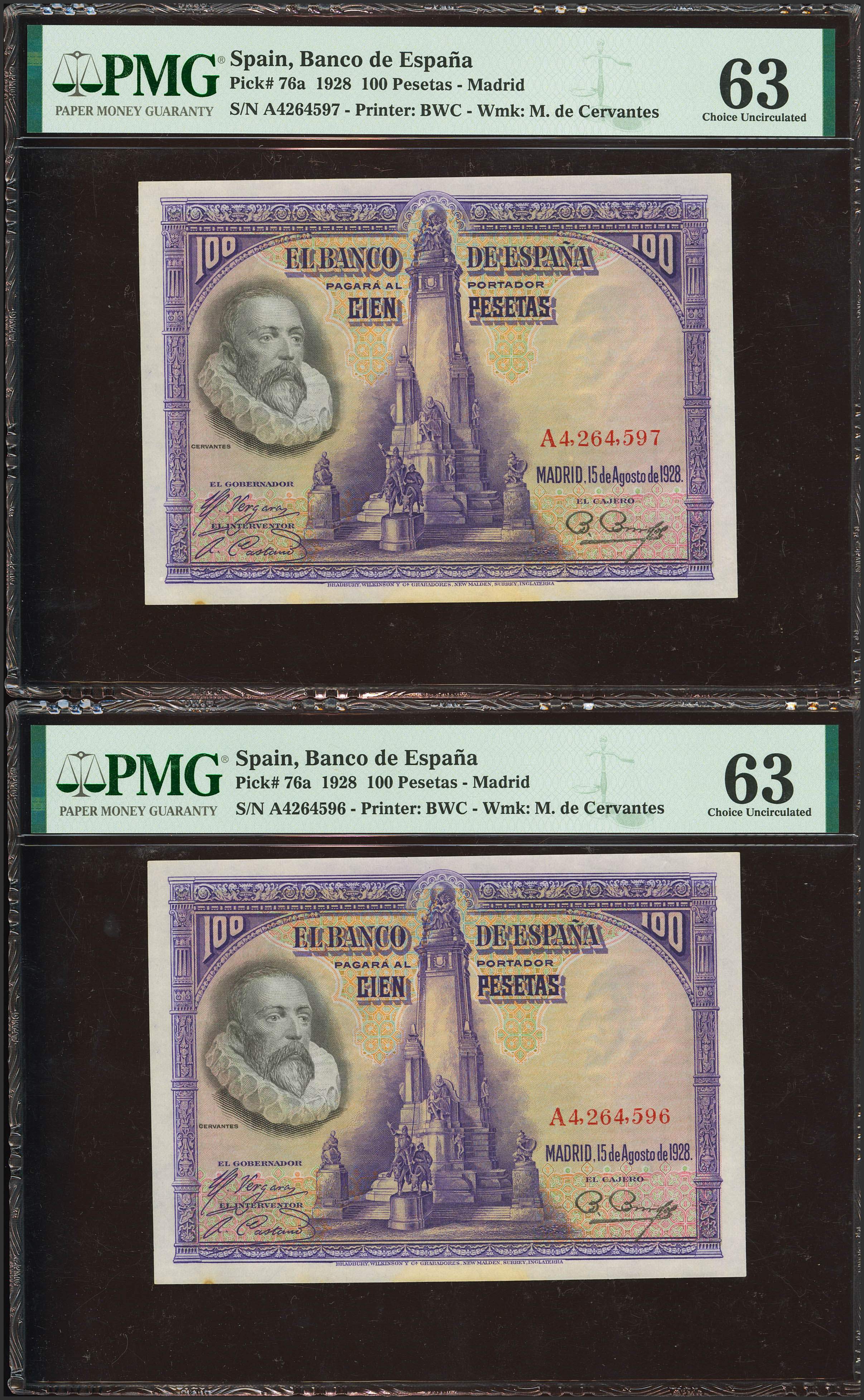 100 Pesetas. 15 de Agosto de 1928. Pareja correlativa. Serie A. (Edifil 2023: 355a, Pick: 76a). Manchitas del tiempo. SC-. Encapsulados PMG63 (minor stains), ambos.