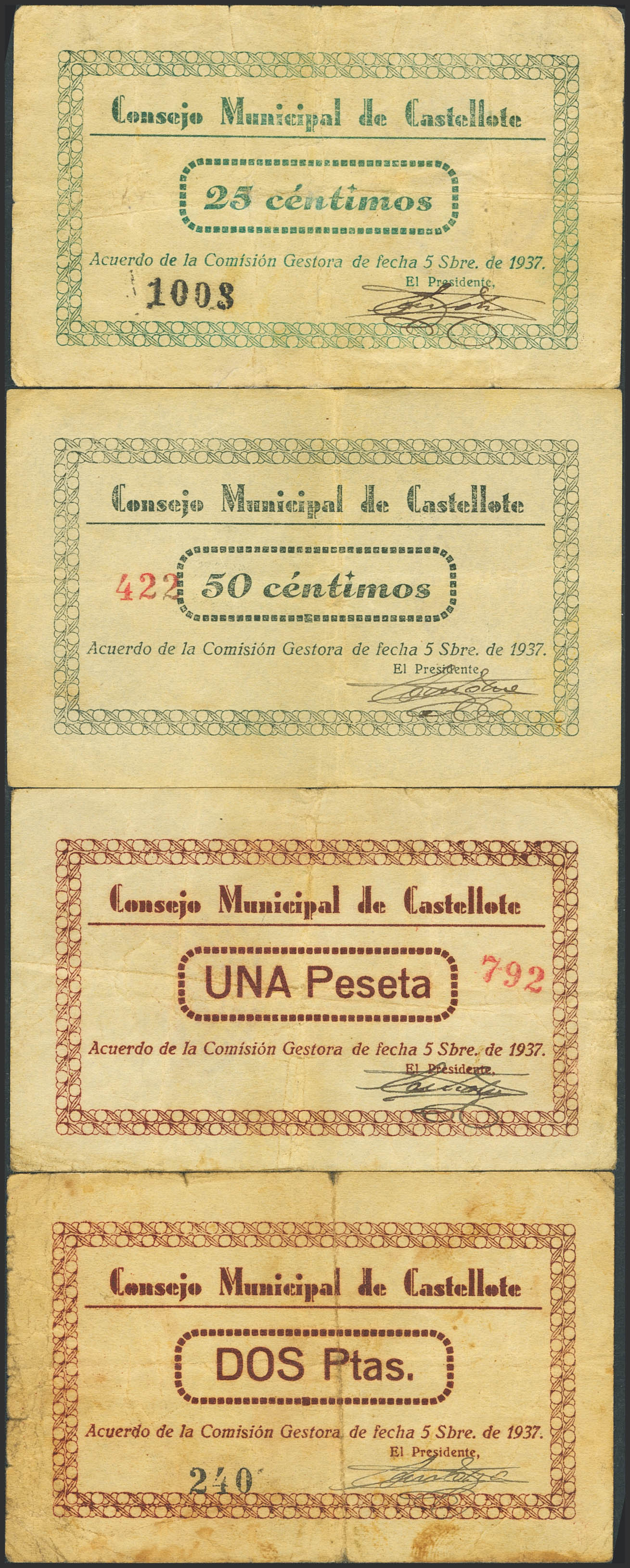 CASTELLOTE (TERUEL). 25 Céntimos, 50 Céntimos, 1 Peseta y 2 Pesetas. 5 de Septiembre de 1937. (González: 1791/94). Rara serie completa. MBC.