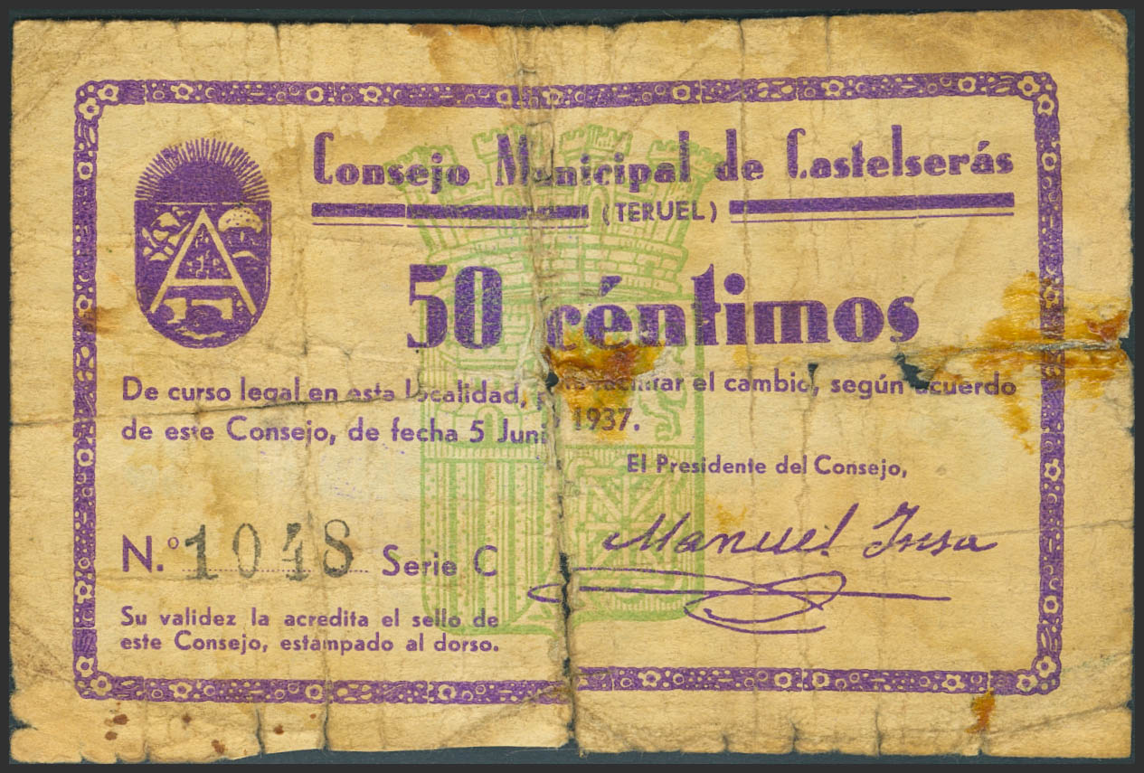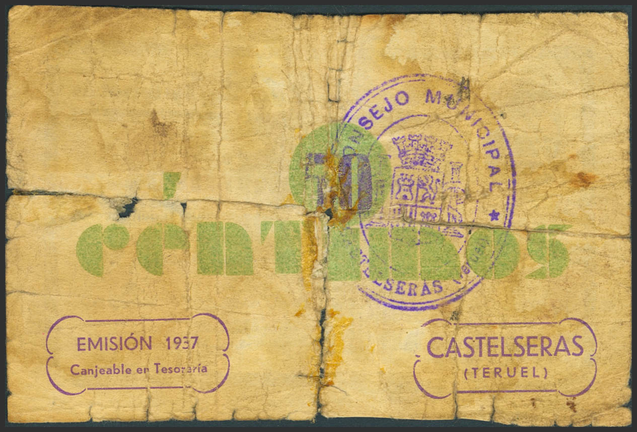 CASTELSERAS (TERUEL). 50 Céntimos. 5 de Junio de 1937. Serie C. (Pick: 1798). Raro. BC-.