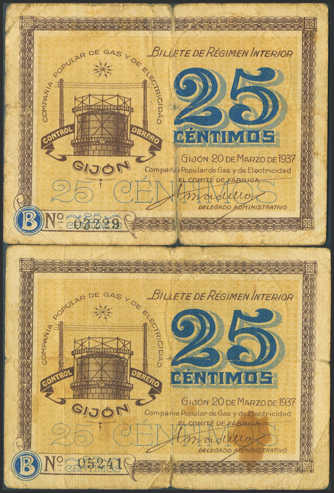 GIJON (ASTURIAS). 25 Céntimos (2). 20 de Mayo de 1937. Serie B, ambos. (Pick: 2657). BC.