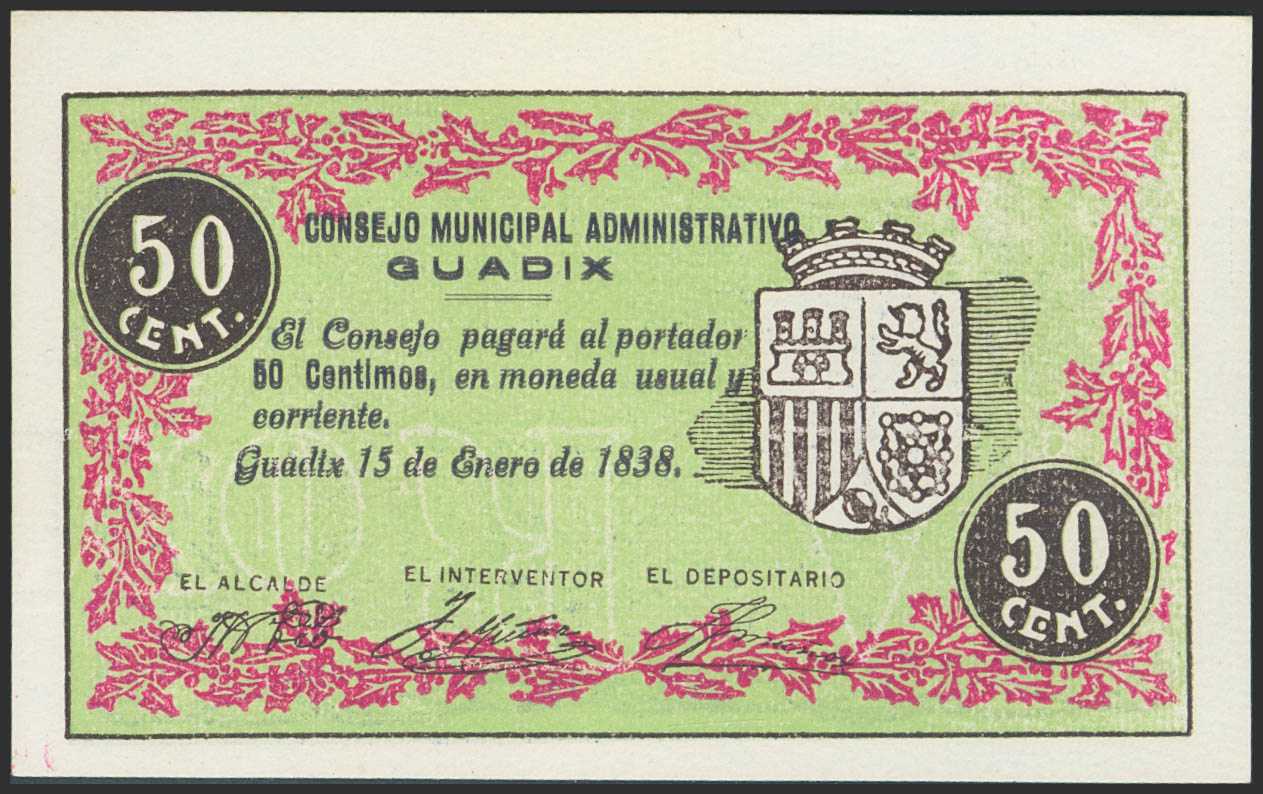 GUADIX (GRANADA). 50 Céntimos. 15 de Enero de 1938. (Pick: 2771). Inusual doble impresión. SC.