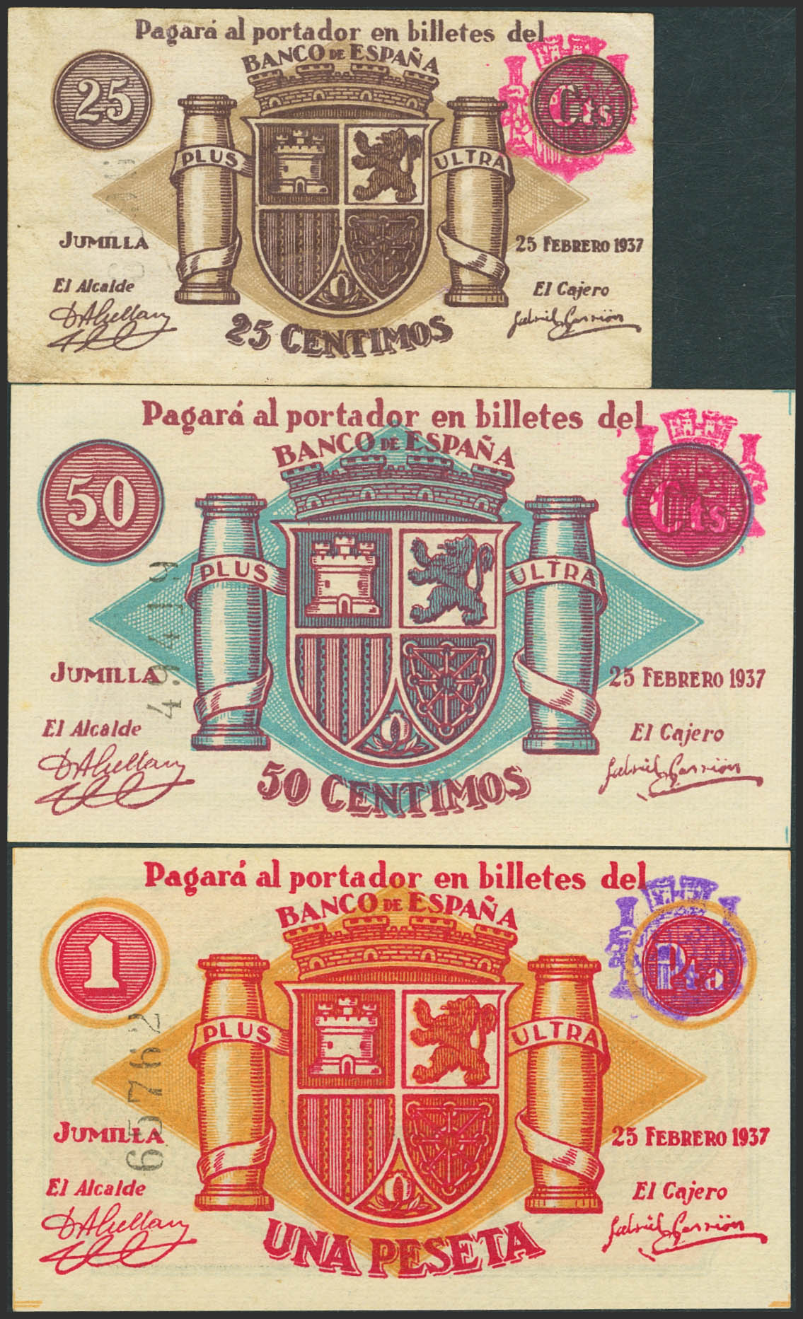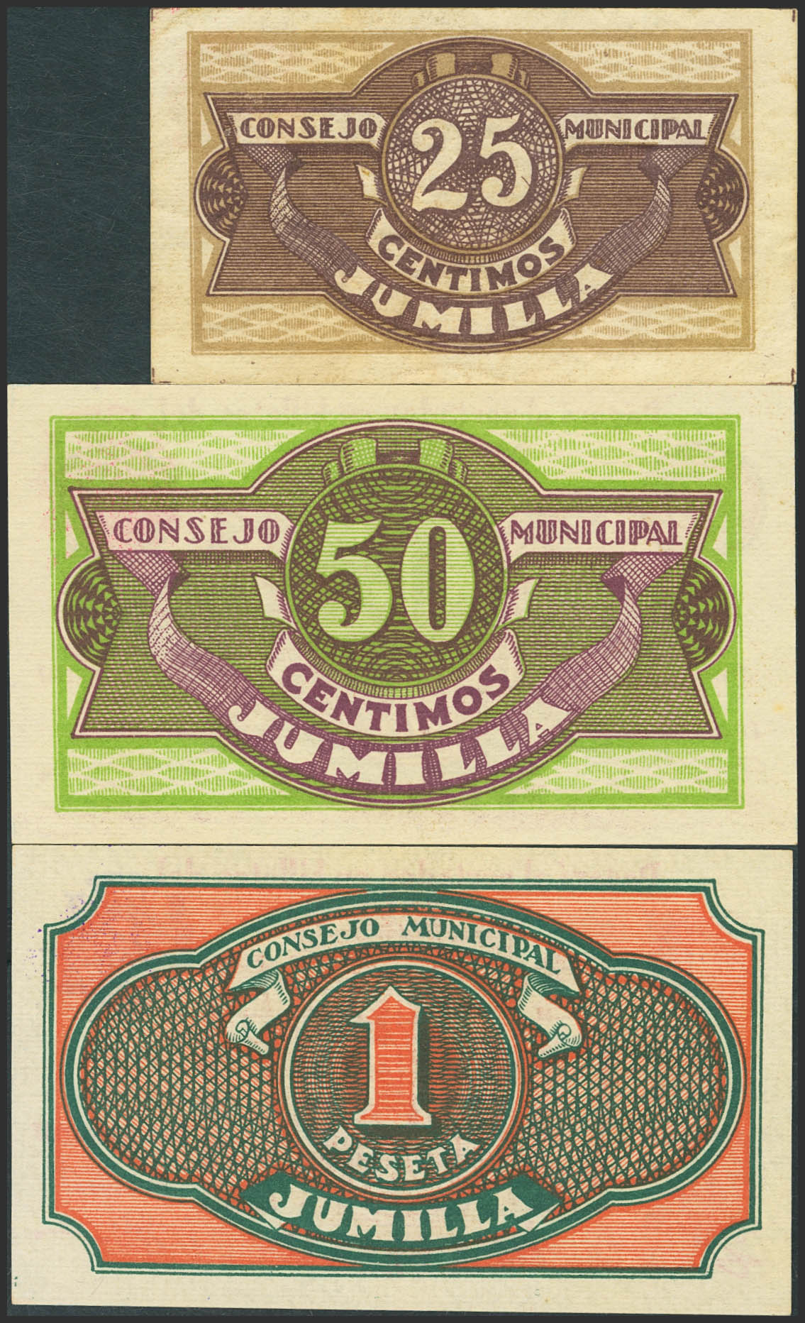 JUMILLA (MURCIA). 25 Céntimos, 50 Céntimos y 1 Peseta. 25 de Febrero de 1937. (González: 3070/72). Inusual serie completa. SC/MBC+.