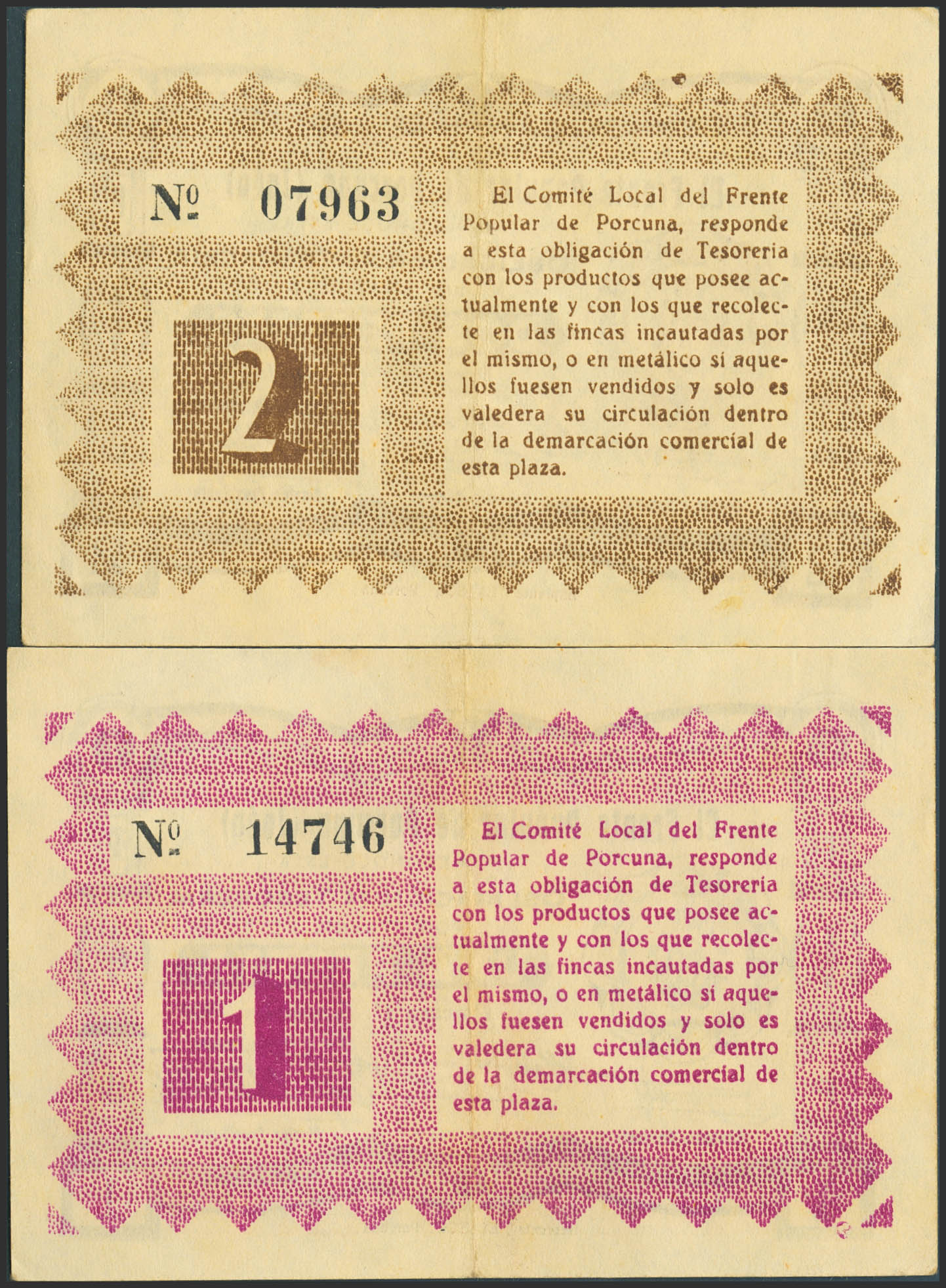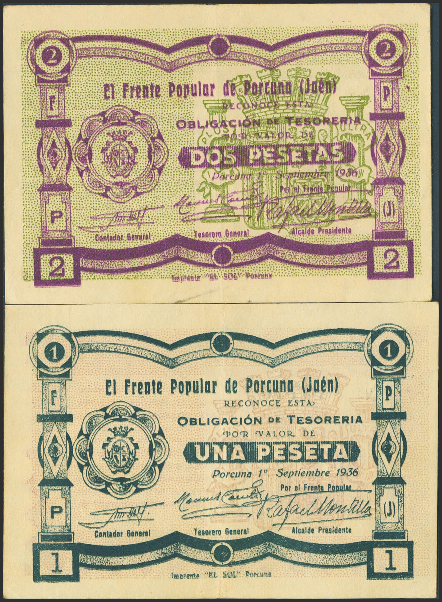 PORCUNA (JAEN). 1 Peseta y 2 Pesetas. 1 de Septiembre de 1936. (Pick: 4243, 4244). MBC+.