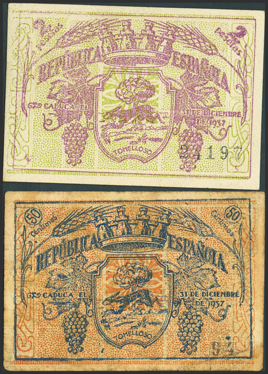 TOMELLOSO (CIUDAD REAL). 50 Céntimos y 2 Pesetas. 9 de Julio de 1937. (González: 5043, 5045). MBC/SC-.