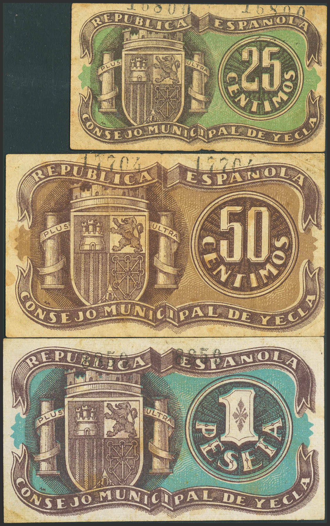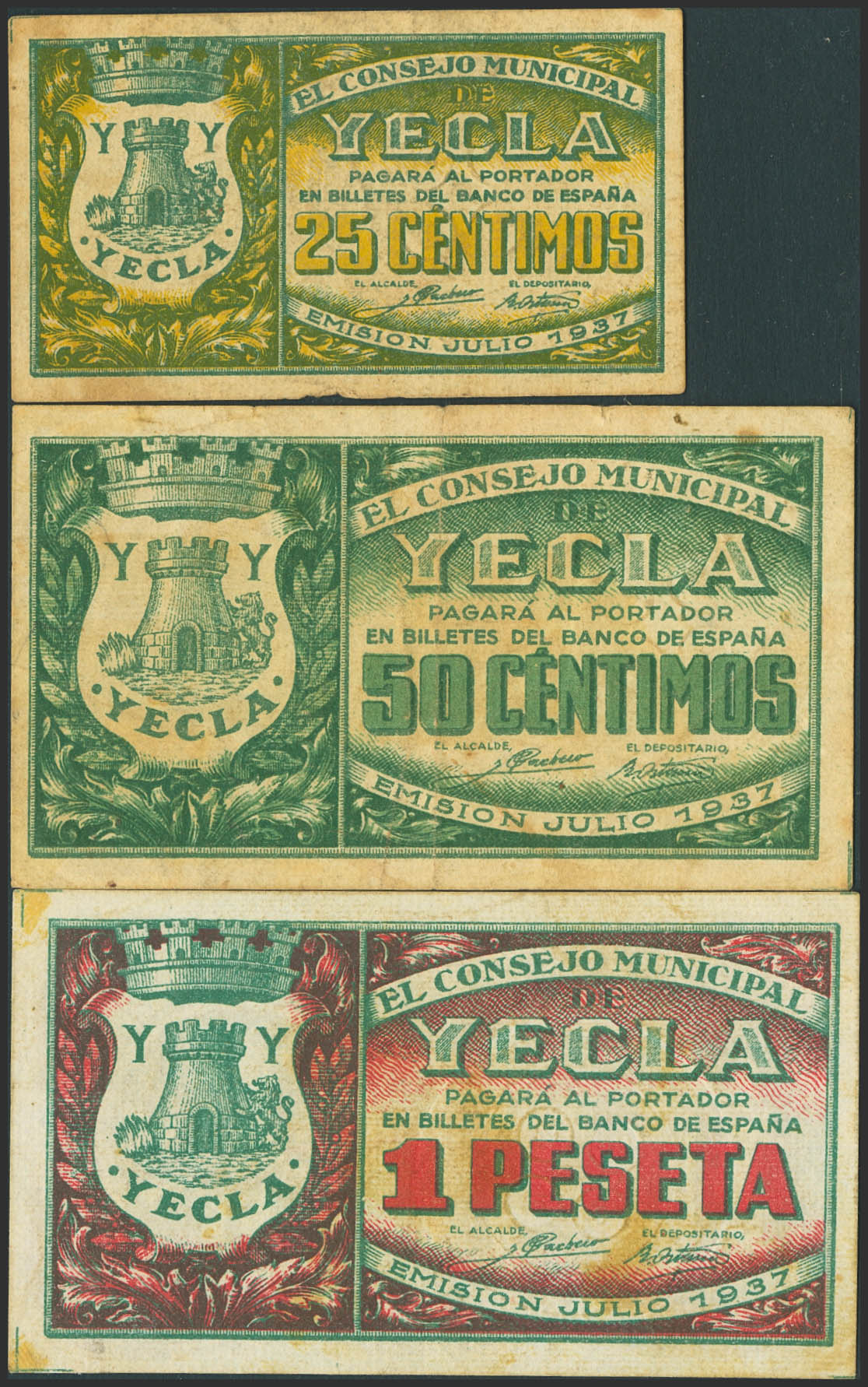 YECLA (MURCIA). 25 Céntimos, 50 Céntimos y 1 Peseta. Junio 1937. (González: 5807/09). Inusual serie completa. MBC.