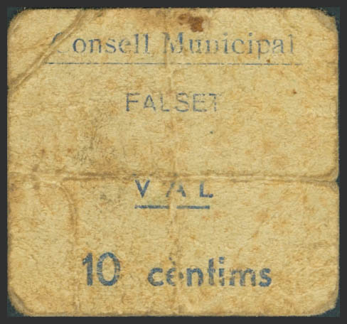 FALSET (TARRAGONA). 10 Céntimos. (1937ca). (Pick: 7810). Muy raro. BC+.