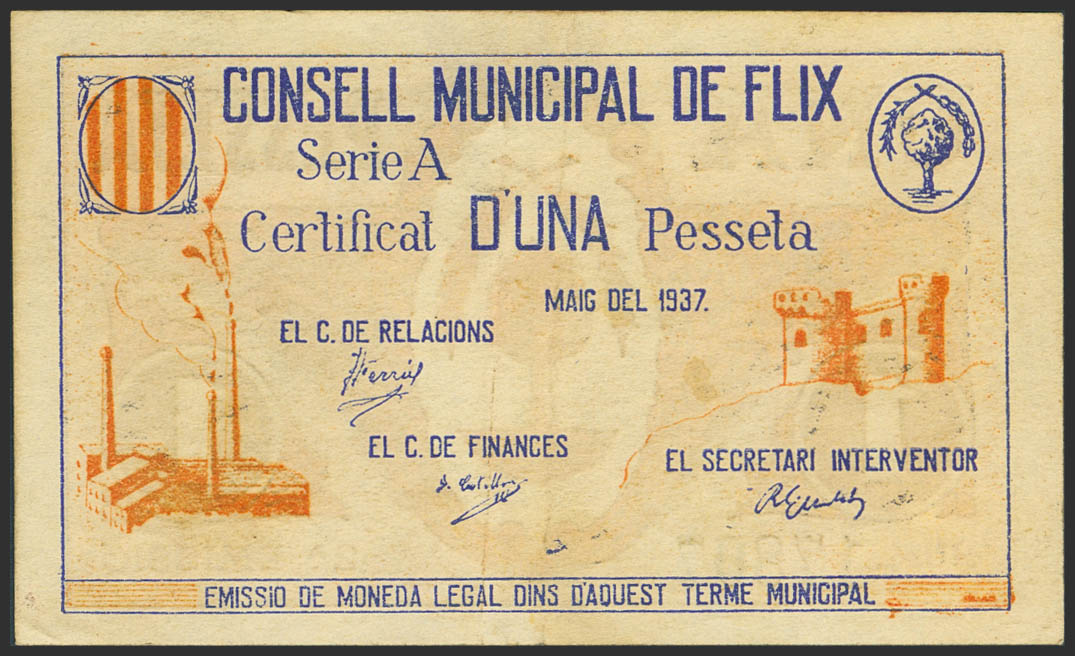 FLIX (TARRAGONA). 1 Peseta. Mayo de 1937. (González: 7885). Raro. MBC-.