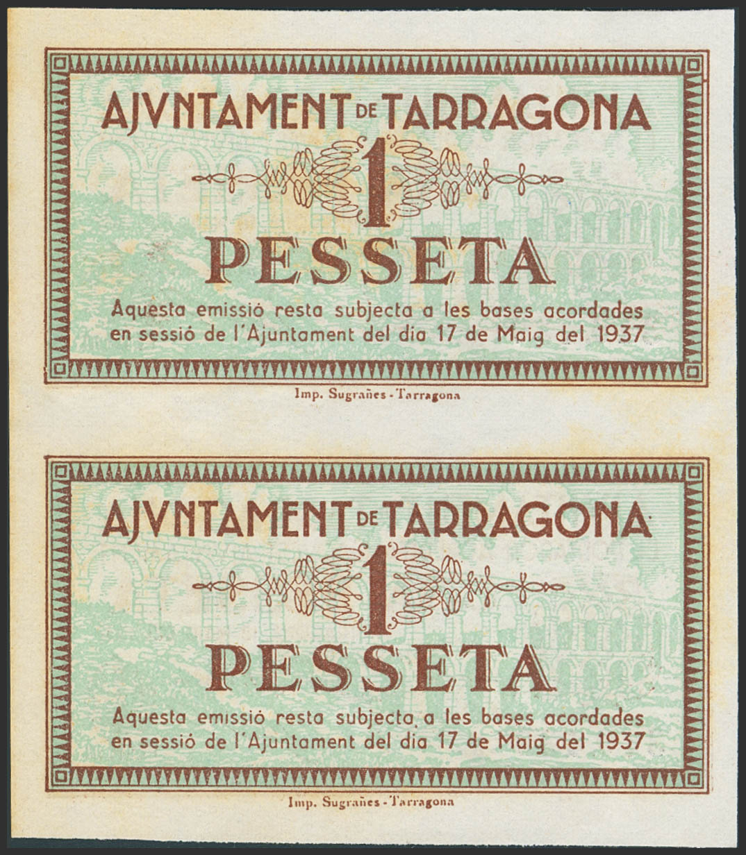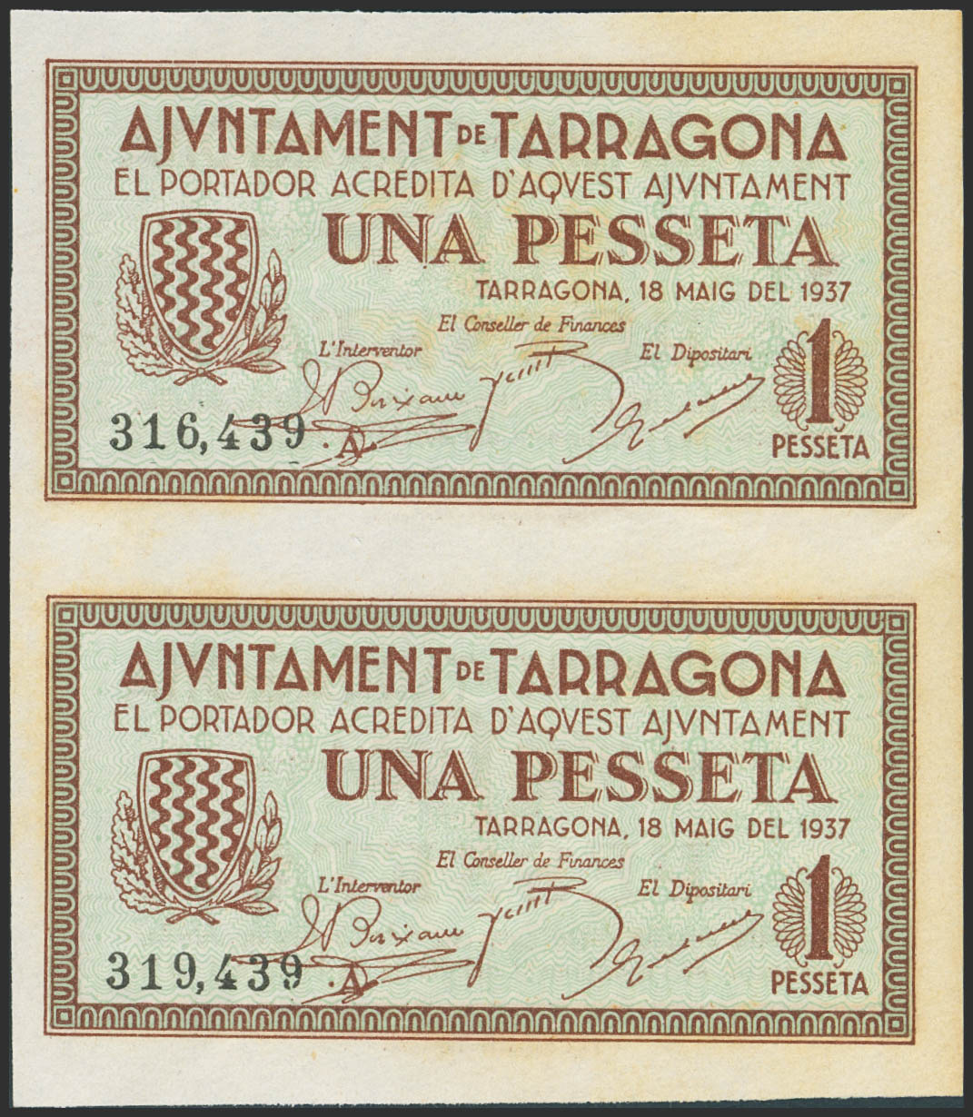 TARRAGONA. 1 Peseta. (1937ca). 2 billetes sin guillotinar. (Pick: 10086). SC-.