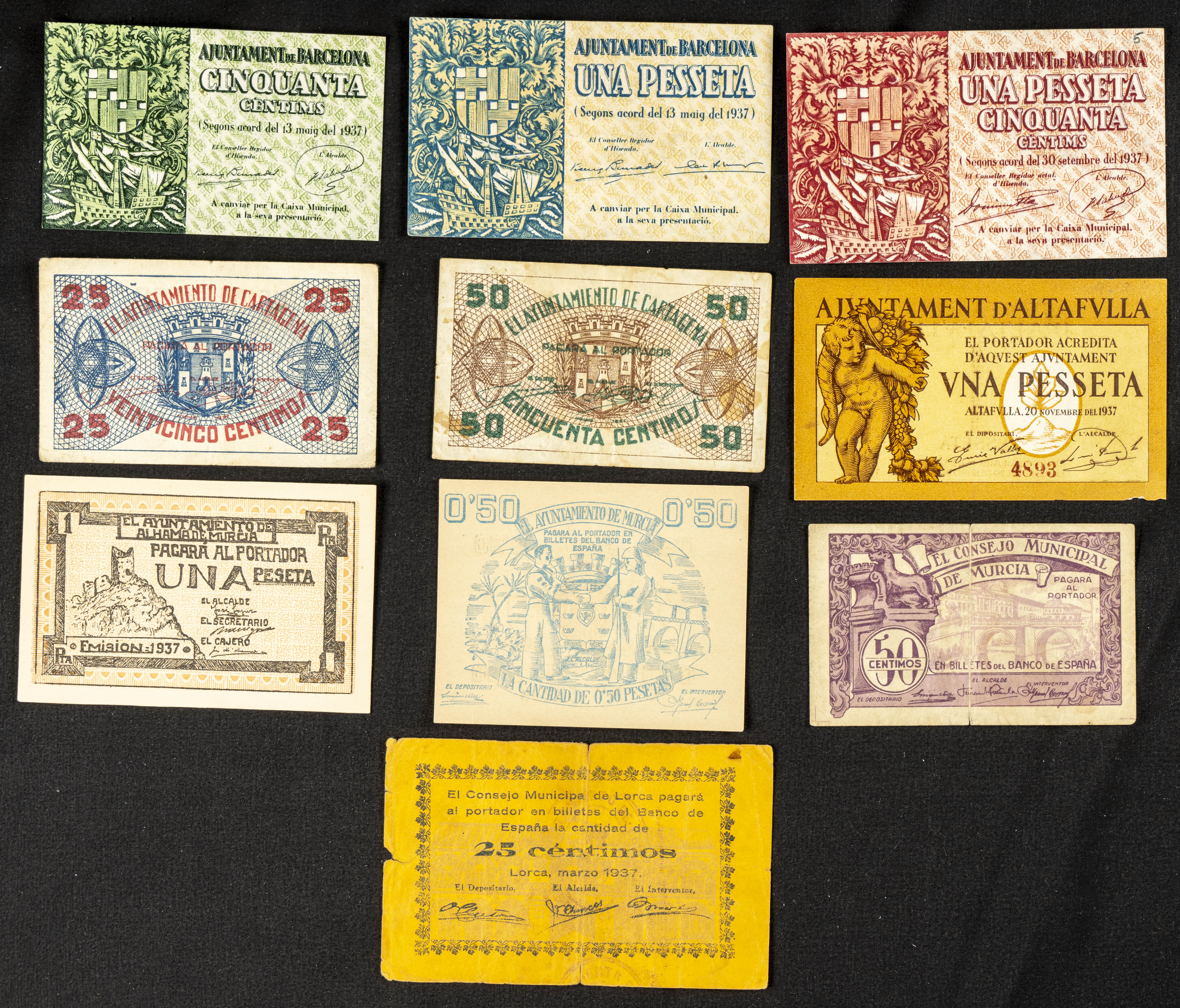 Conjunto de 10 billetes locales de la Guerra civil, de diferentes localidades y en diversas calidades. A EXAMINAR.Una vez más agradecemos la colaboración altruista de toda la comunidad de La Taberna, que nos brindan su ayuda en la parte técnica para clasificar los billetes falsos o fantasías de este lote, rogamos un poco de paciencia, en cuanto este lote haya sido revisado y el cedente puesto sobre aviso, se volverá a poner a la venta retirando los billetes conflictivos, pedimos disculpas a quién se haya sentido ofendido por nuestra actuación, siguiendo la sensibilidad de La Taberna procederemos a modificar la composición del lote y atendiendo a nuestro derecho recogido en el punto 9 de nuestras condiciones de venta. Somos unos firmes defensores de todas las plataformas online que entendemos que son fuente de conocimiento y actúan como salvaguardas del sector.