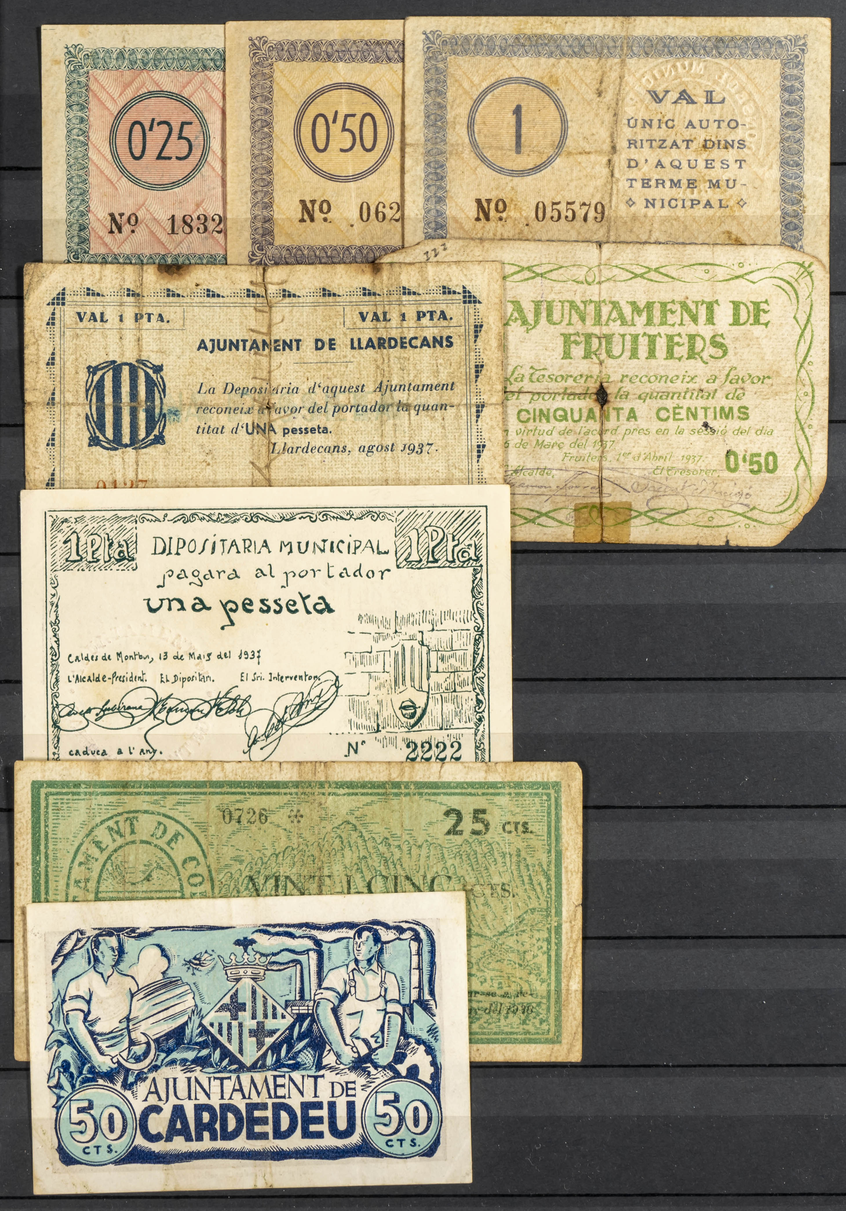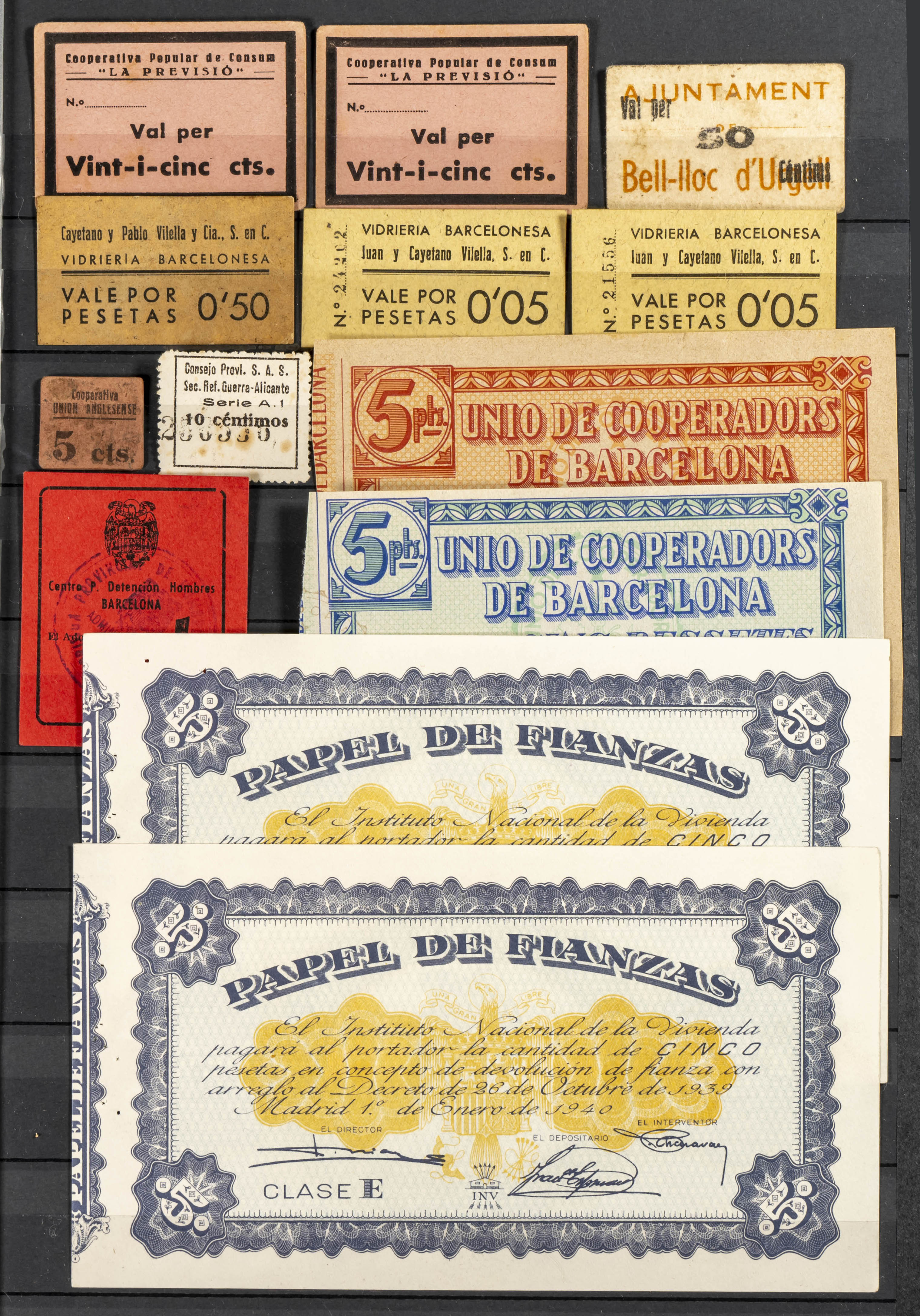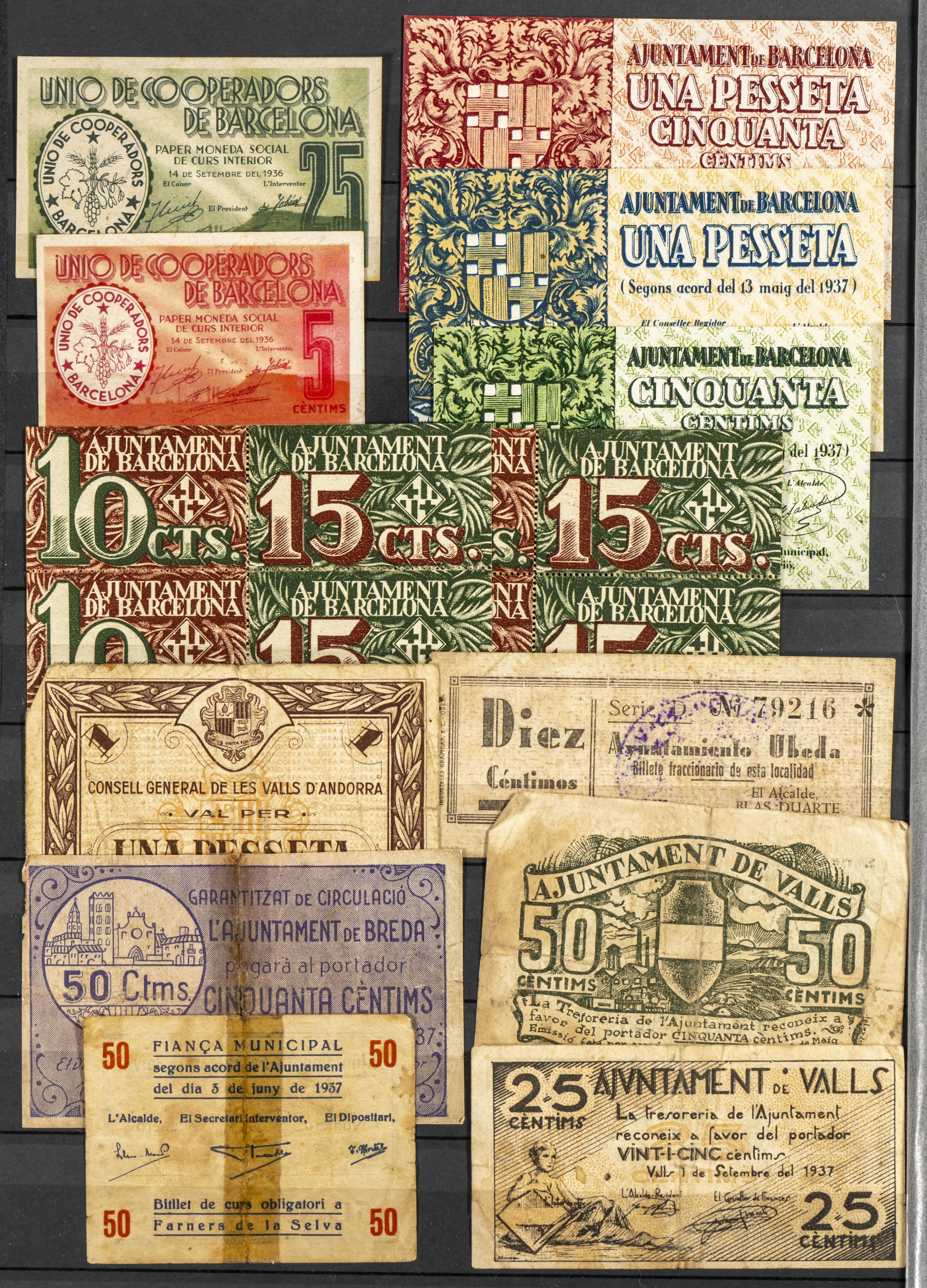 Conjunto de más de 30 billetes de la Guerra Civil de diferentes localidades y en diversas calidades (incluyendo algún ejemplar de Papel de Finanzas). A EXAMINAR.