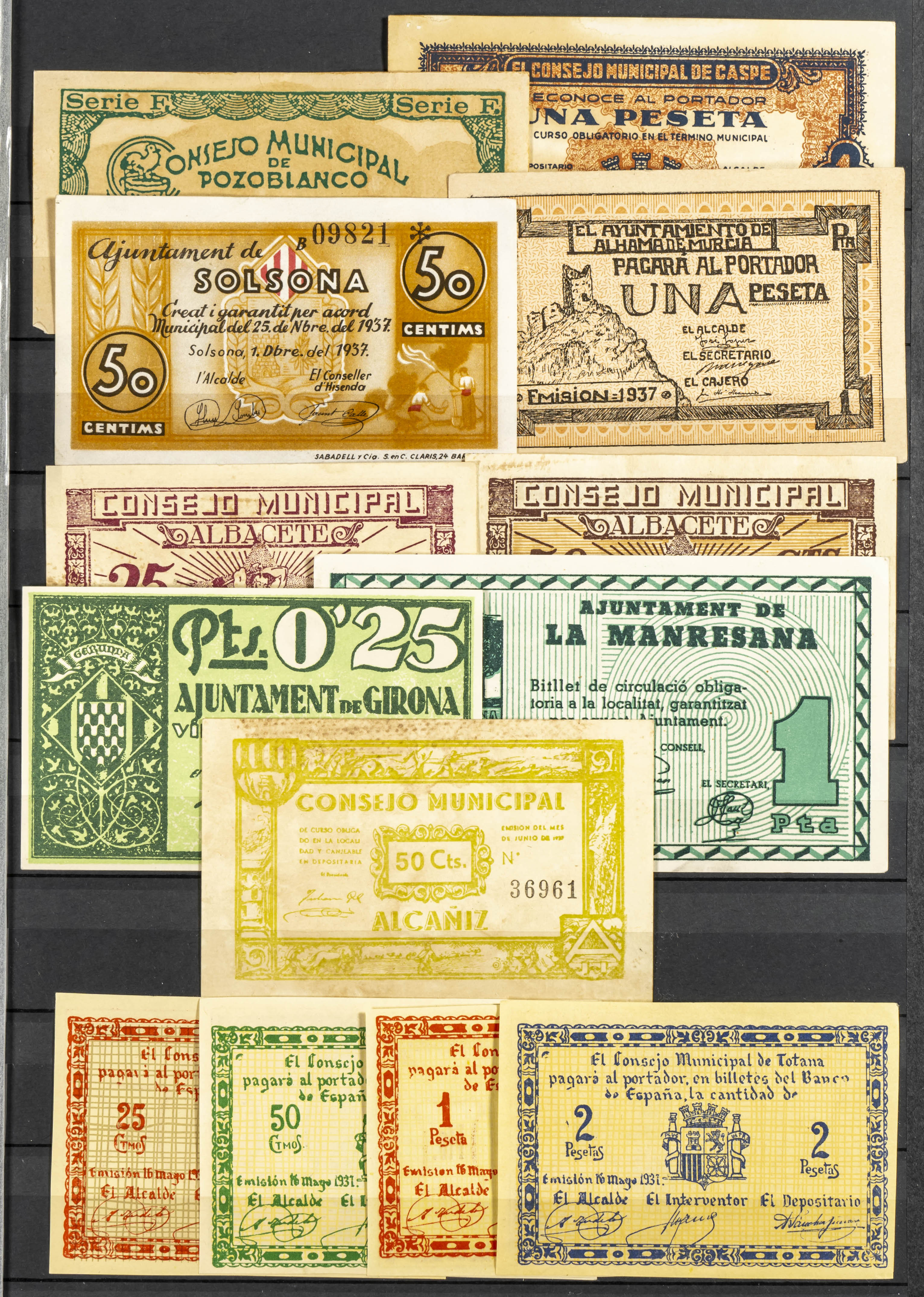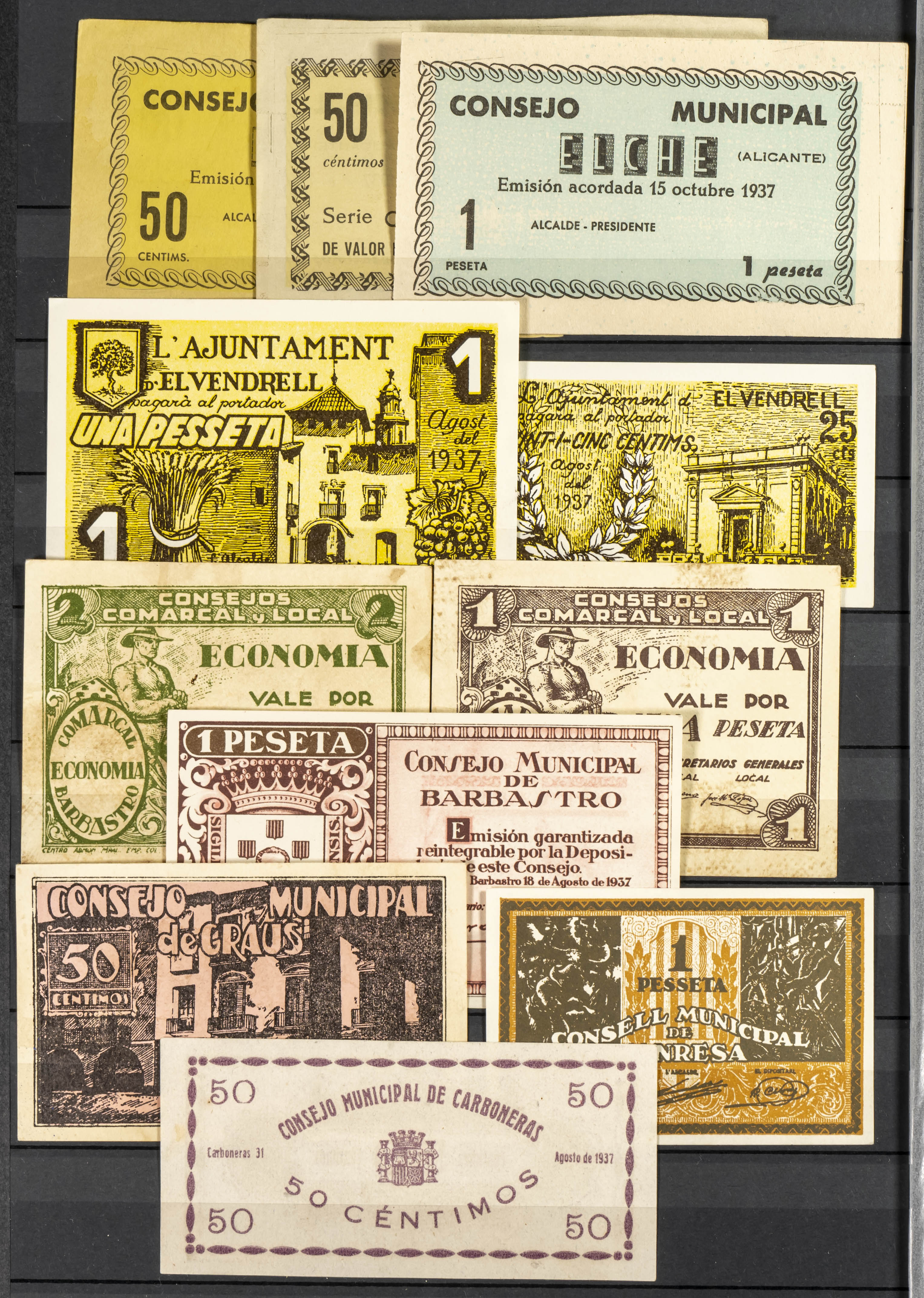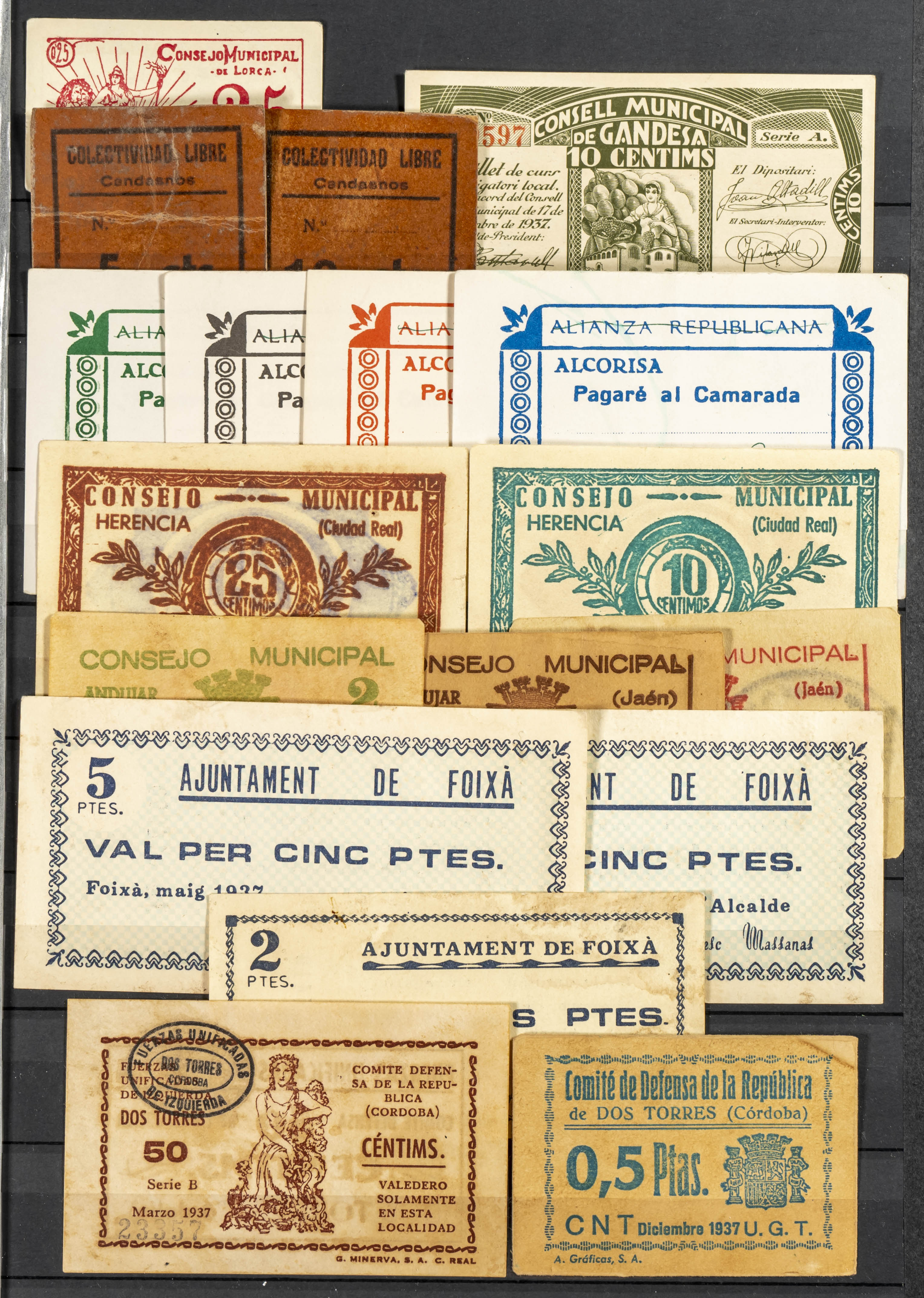 Conjunto de más de 40 billetes de la Guerra Civil de diferentes localidades, la mayoría de ellos falsos, ideal para estudio. A EXAMINAR.(Agradecemos sinceramente a “La taberna” la valiosa información proporcionada sobre este lote, en el que se señala la existencia de treinta y ocho billetes falsos y cuatro de autenticidad dudosa. Recordamos, en cualquier caso, que el lote se ofrece con precio de salida libre. Todos los billetes han sido fotografiados con el único propósito de documentar su existencia, difundir la información y evitar que estos ejemplares, o copias similares, puedan ser ofrecidos en el futuro como originales.Somos conscientes de la controversia que existe en la red respecto a la conveniencia o no de ofrecer este tipo de lotes. Tanto Iberphil como Ibercoin los han incluido en sus subastas, con mayor o menor frecuencia, durante los últimos veinte años. En todos los casos, estos lotes son íntegramente fotografiados, con el objetivo de brindar a los coleccionistas la oportunidad de estudiar y familiarizarse con estos ejemplares falsificados, sean sellos, monedas o billetes, que siempre se ofrecen a precio simbólico y claramente identificados como problemáticos.Es cierto, y no lo ocultamos, que desde el punto de vista técnico estos lotes suponen una vía práctica que, al catalogarse como "lotes libres y conflictivos a examinar", reducen significativamente el tiempo de análisis detallado que normalmente se requeriría, liberando así al equipo técnico de una carga de trabajo considerable y de la correspondiente responsabilidad.Conviene añadir que, en nuestra labor como intermediarios, en muchas ocasiones el propio vendedor exige la inclusión de la totalidad de las piezas en subasta. En este caso concreto, el lote procede de un cedente externo, aunque Ibercoin conserva en propiedad una pequeña colección de billetes locales falsificados.Por último, aprovechamos para recomendar encarecidamente la lectura de la obra LOS BILLETES MUNICIPALES FALSOS DE LA GUERRA CIVIL, del reconocido especialista Amadeo Amorós Tarí, una referencia imprescindible en la biblioteca de cualquier coleccionista serio).Una vez más agradecemos la colaboración altruista de toda la comunidad de La Taberna, que nos brindan su ayuda en la parte técnica para clasificar los billetes falsos o fantasías de este lote, rogamos un poco de paciencia, en cuanto este lote haya sido revisado y el cedente puesto sobre aviso, se volverá a poner a la venta retirando los billetes conflictivos, pedimos disculpas a quién se haya sentido ofendido por nuestra actuación, siguiendo la sensibilidad de La Taberna procederemos a modificar la composición del lote y atendiendo a nuestro derecho recogido en el punto 9 de nuestras condiciones de venta. Somos unos firmes defensores de todas las plataformas online que entendemos que son fuente de conocimiento y actúan como salvaguardas del sector.
