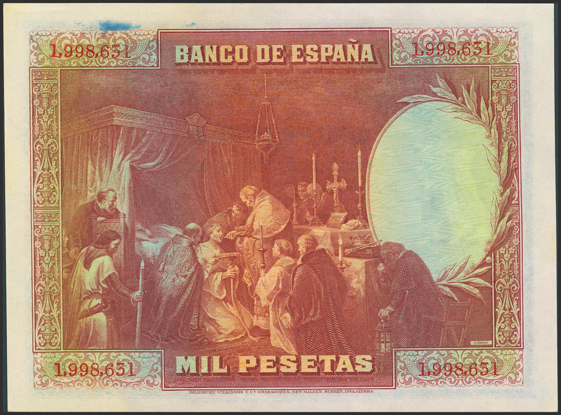 1000 Pesetas. 15 de Agosto de 1928. Sin serie. (Edifil 2023: 357). Inusual, manchita en la esquina superior derecha. SC-.