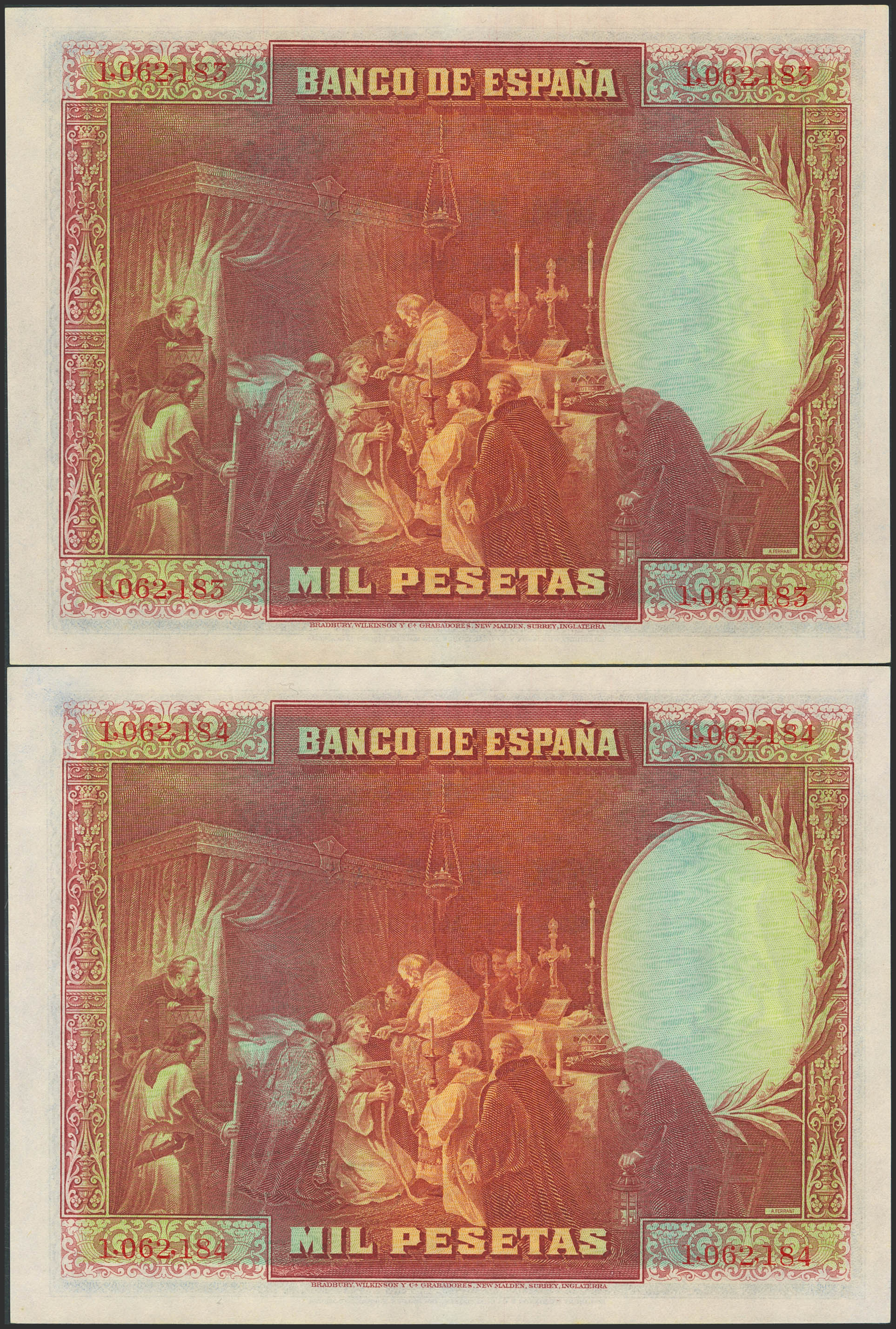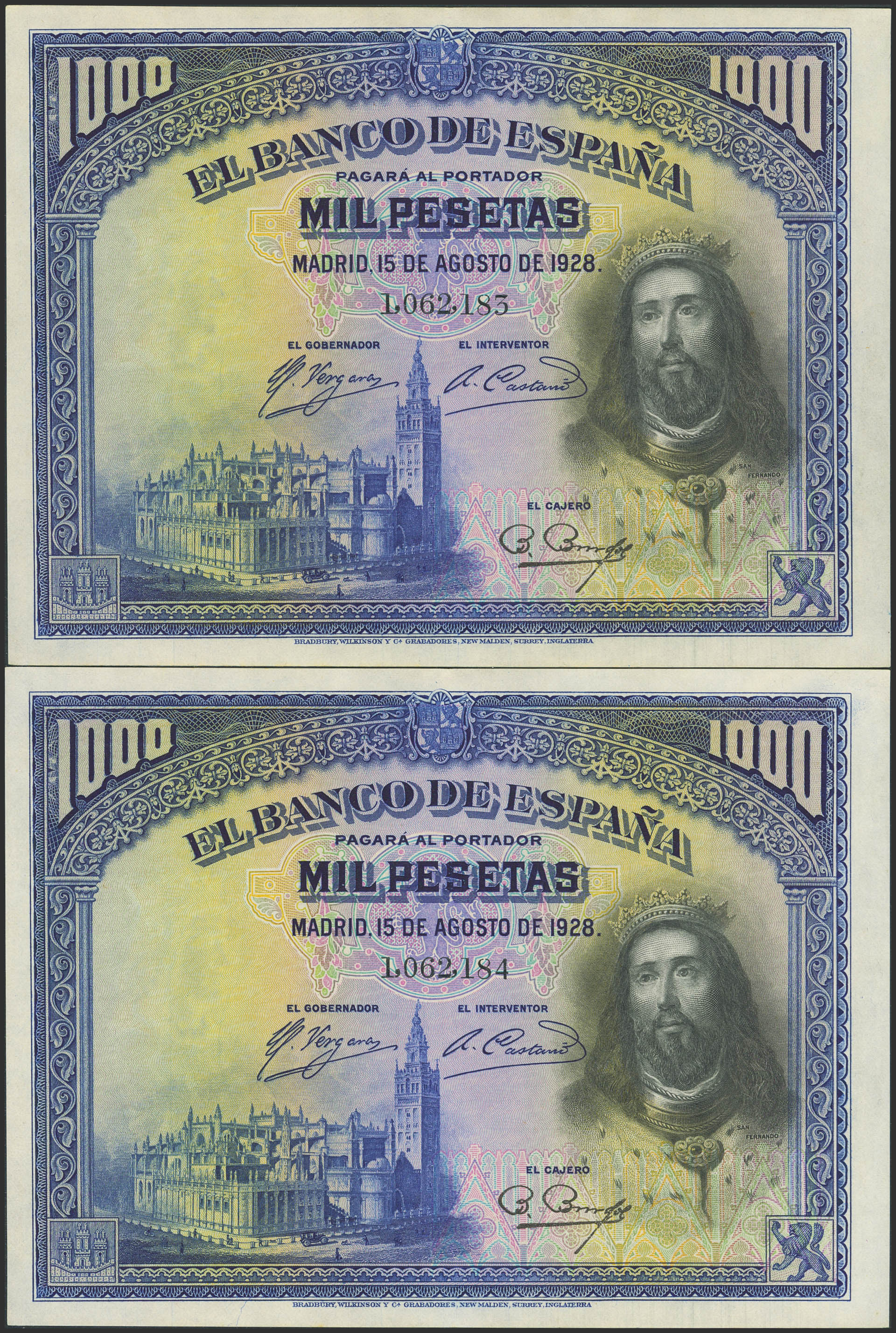 1000 Pesetas. 15 de Agosto de 1928. Pareja correlativa. Sin serie. (Edifil 2023: 357). Conserva todo su apresto original. EBC+.