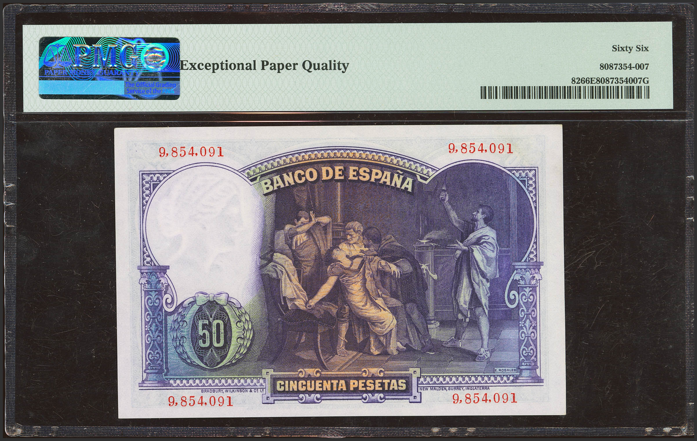 50 Pesetas. 25 de Abril de 1931. Sin serie. (Edifil 2023: 359, Pick: 82). Raro en esta excepcional calidad, apresto original. SC. Encapsulado PMG66EPQ.