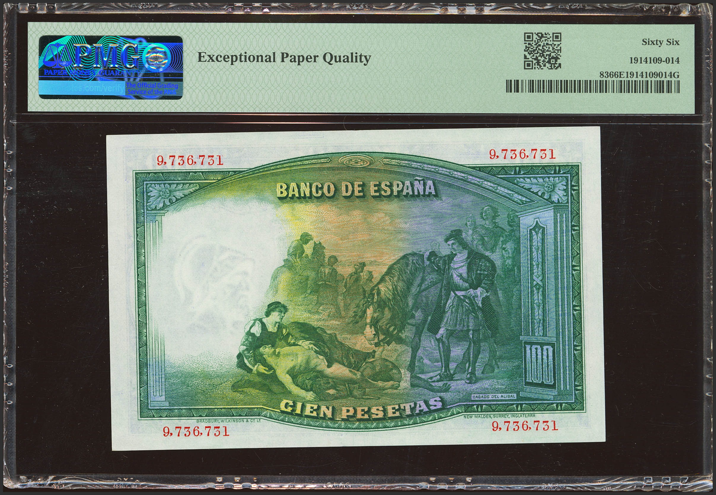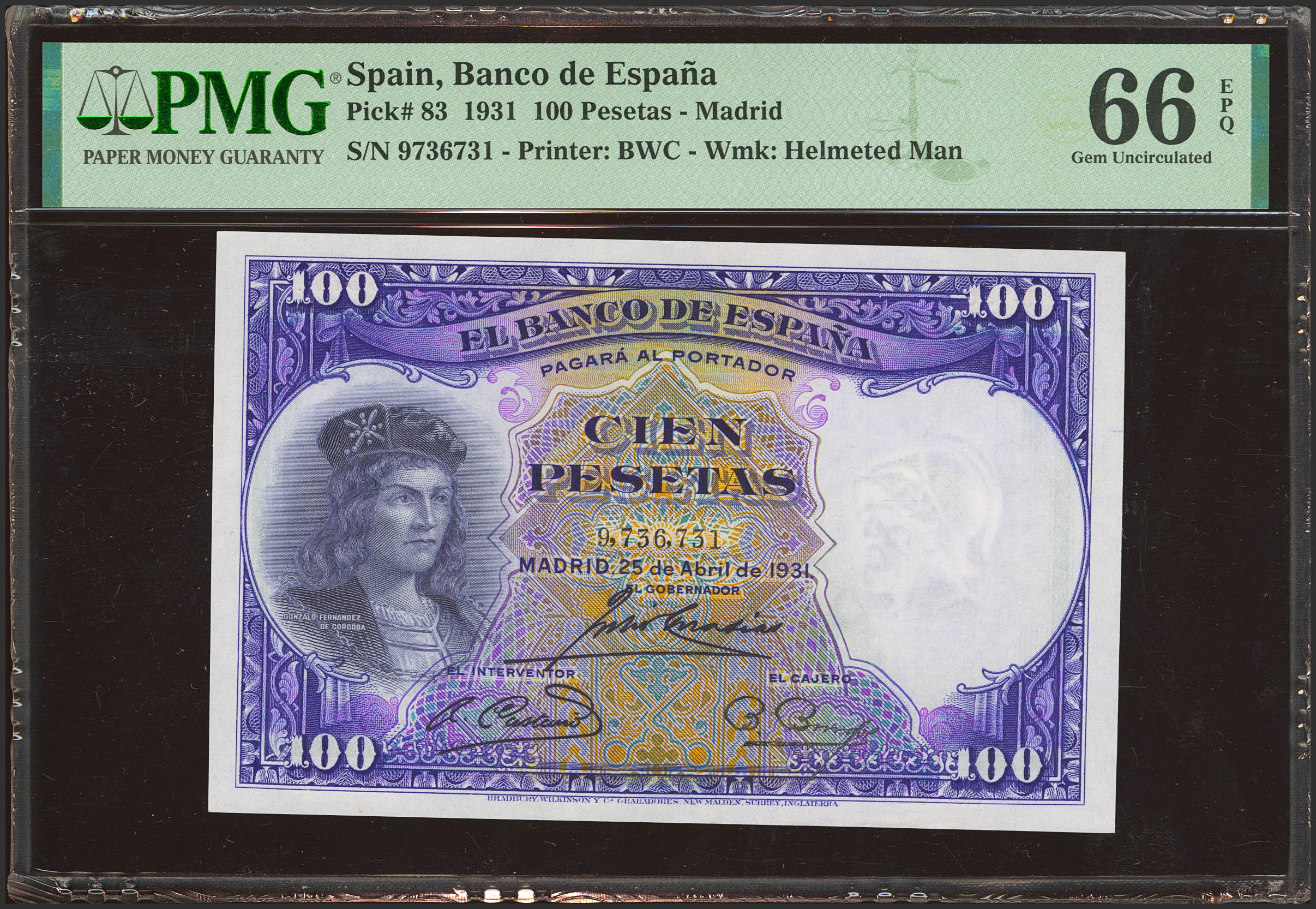 100 Pesetas. 25 de Abril de 1931. Sin serie. (Edifil 2023: 360, Pick: 83). Inusual en esta calidad, apresto original. SC. Encapsulado PMG66EPQ.