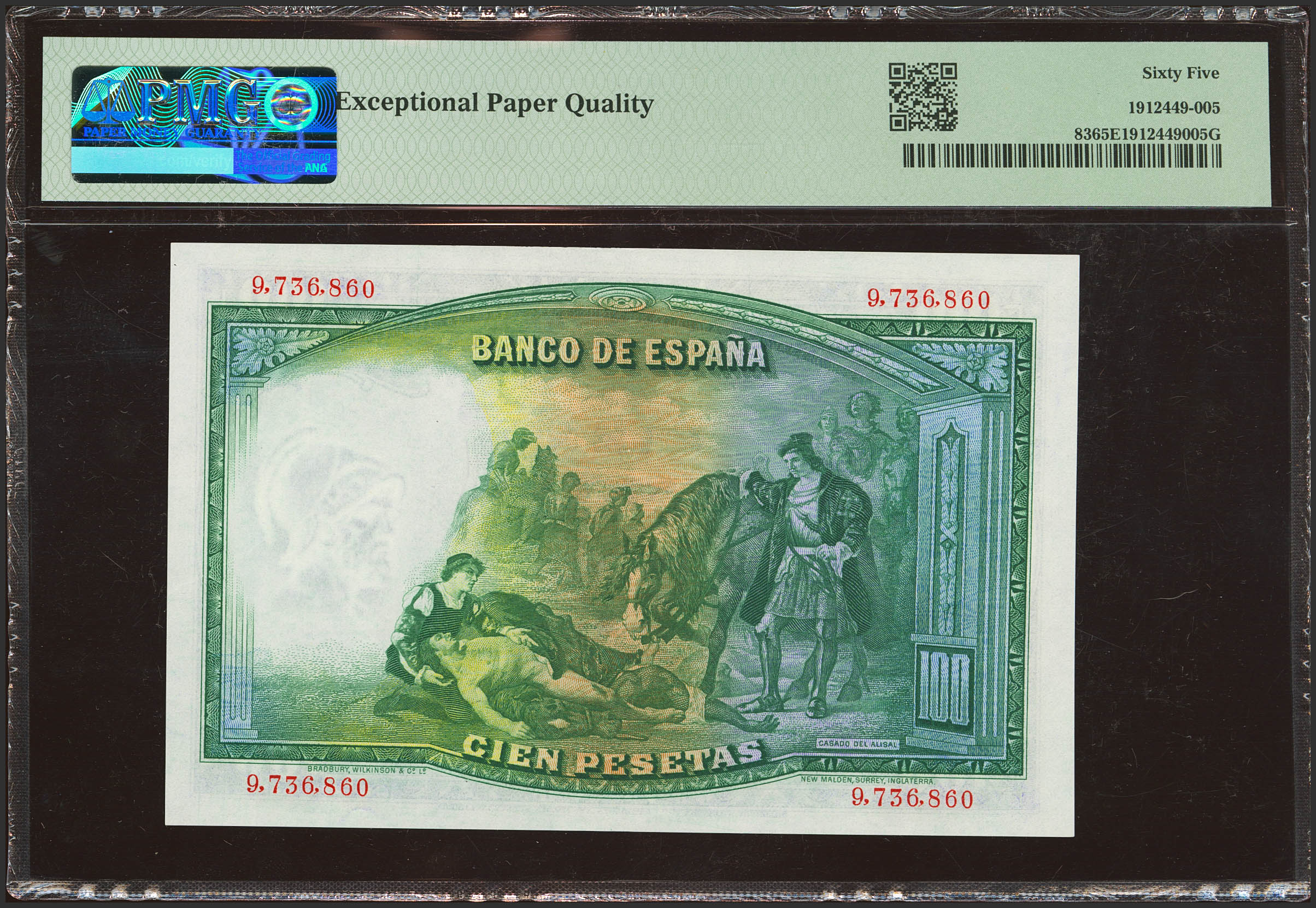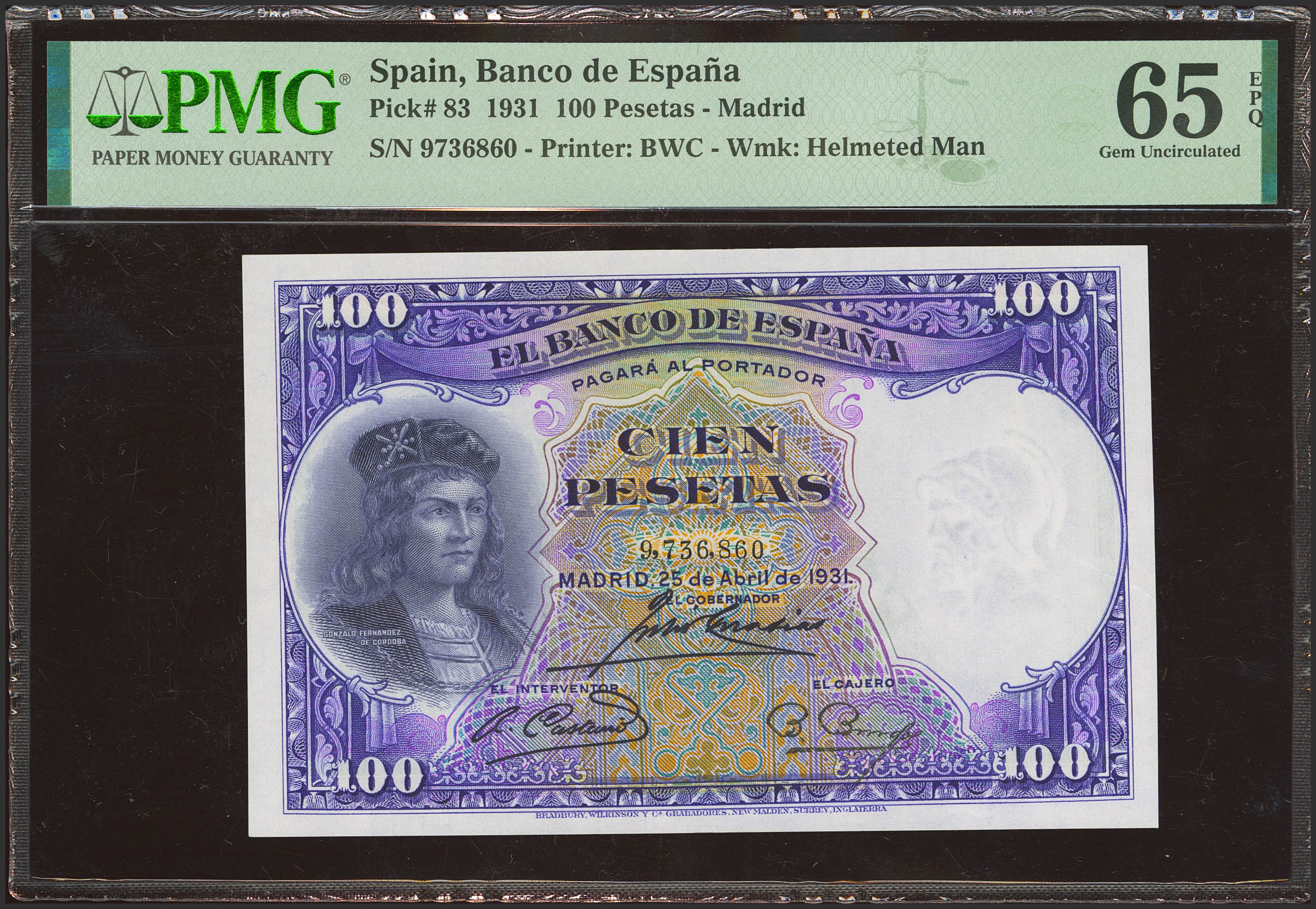 100 Pesetas. 25 de Abril de 1931. Sin serie. (Edifil 2023: 360, Pick: 83). Apresto original. SC. Encapsulado PMG65EPQ.
