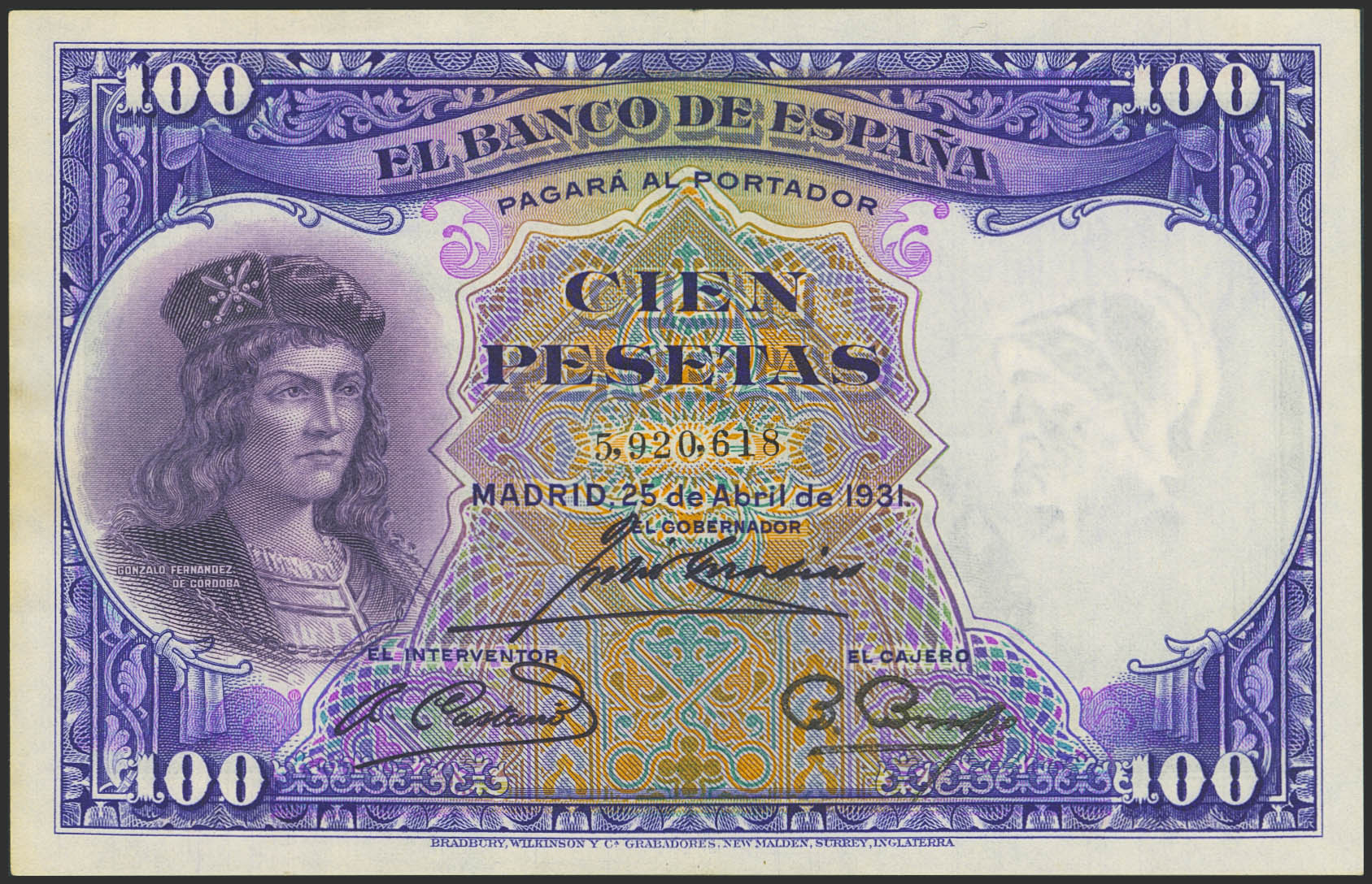 100 Pesetas. 25 de Abril de 1931. Sin serie. (Edifil 2023: 360). Conserva todo su apresto original. EBC+