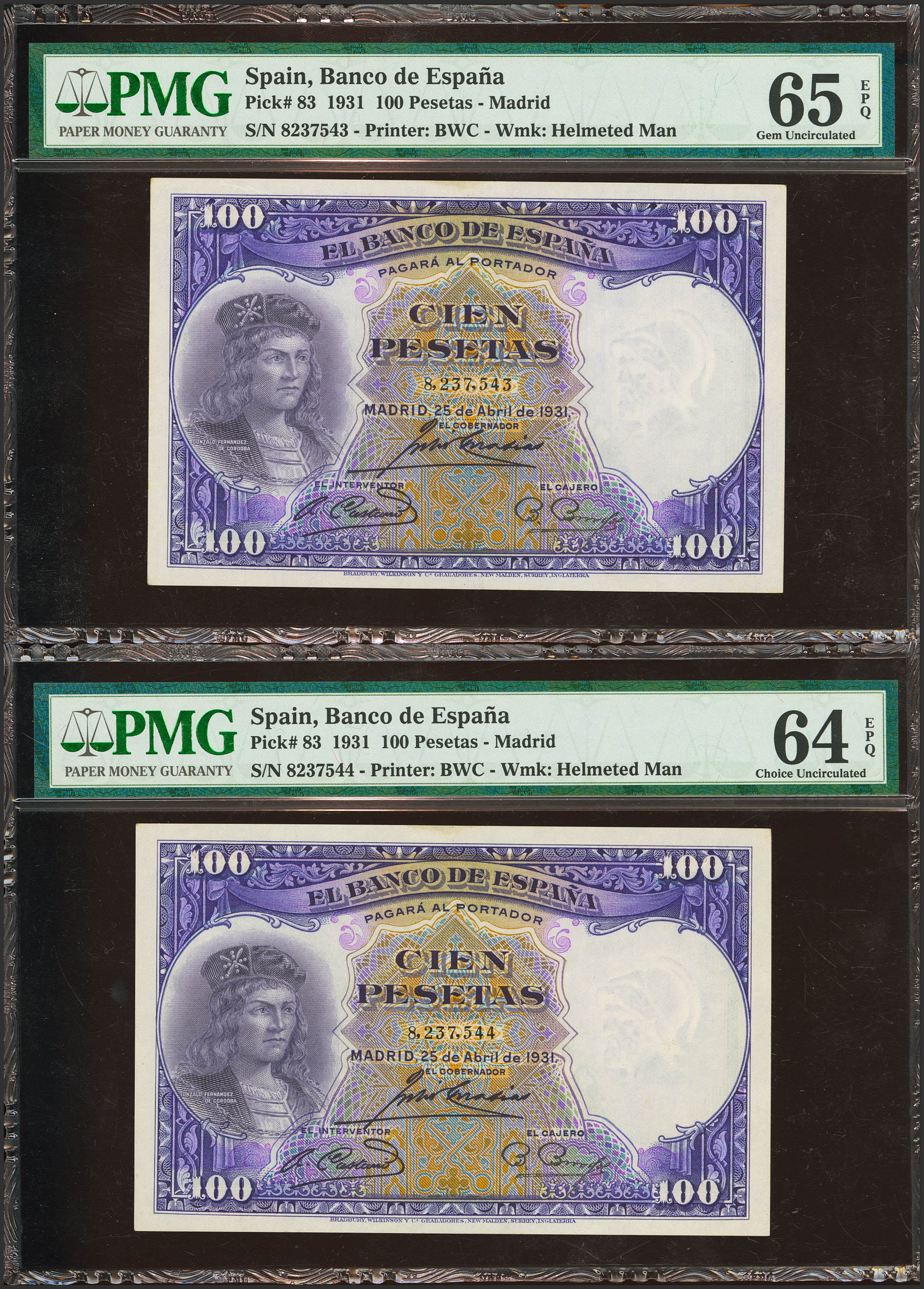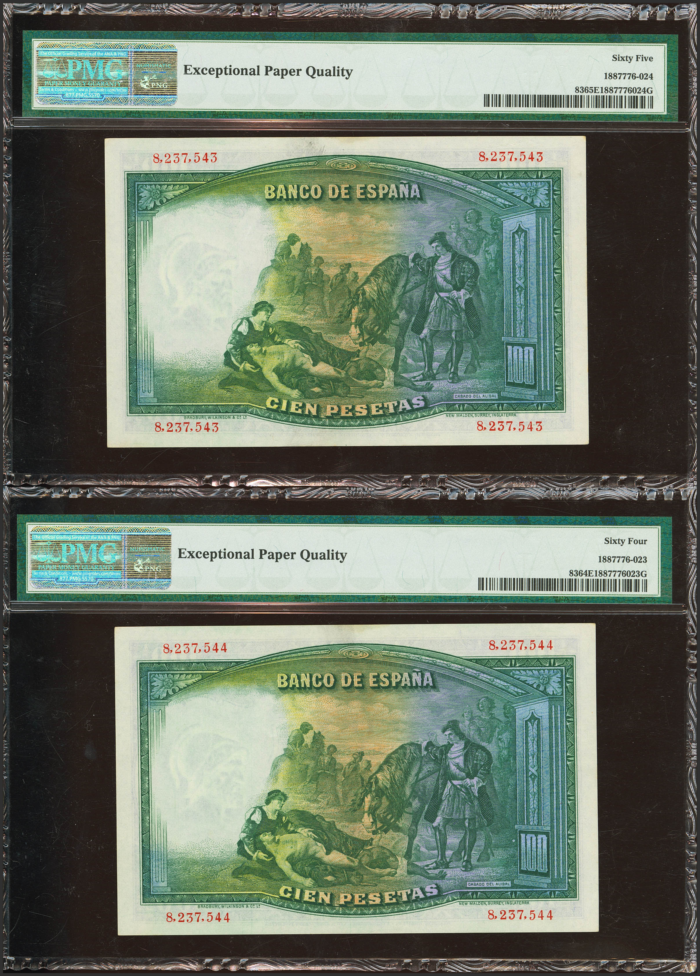 100 Pesetas. 25 de Abril de 1931. Pareja correlativa. Sin serie. (Edifil 2023: 360, Pick: 83). Apresto original. SC. Encapsulados PMG64EPQ/65EPQ.